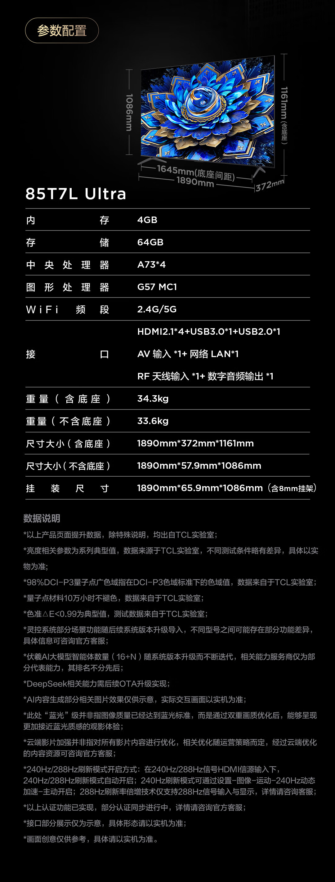 TCL 85T7L Ultra 包安装版【固定挂架送装一体】85英寸 QD-Mini LED电视 T7L Ultra 国家补贴