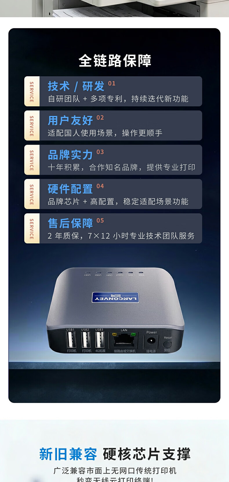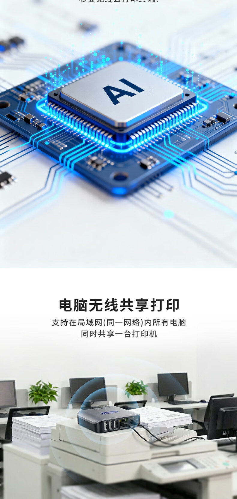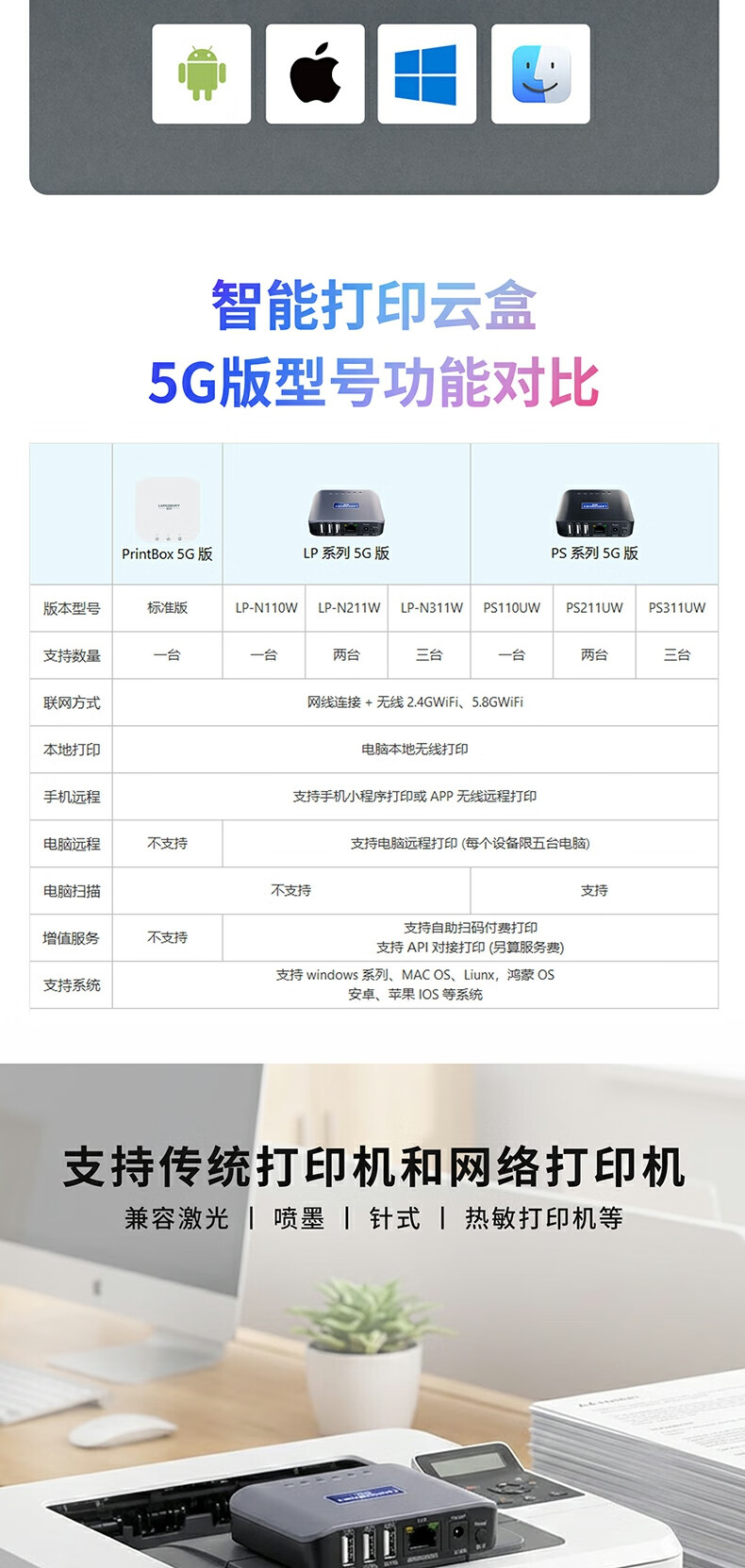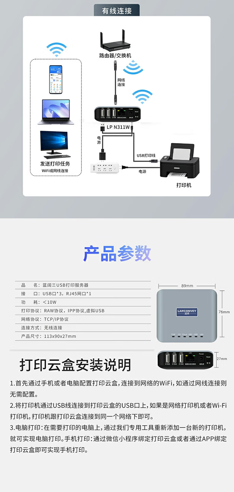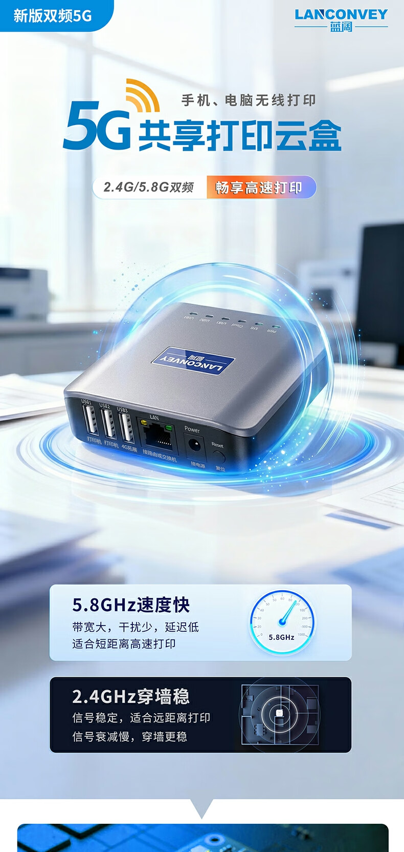 蓝阔支持双频5.8G 2.4GWiFi手机远程电脑无线共享USB打印机转网络 LP-N311W 5G版