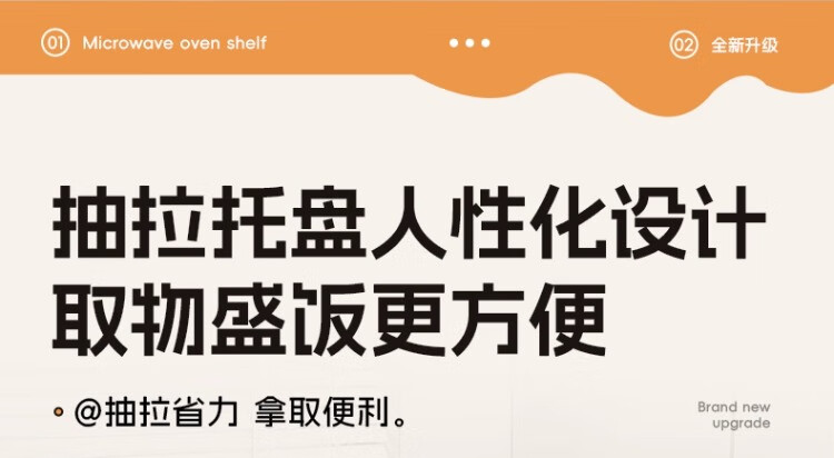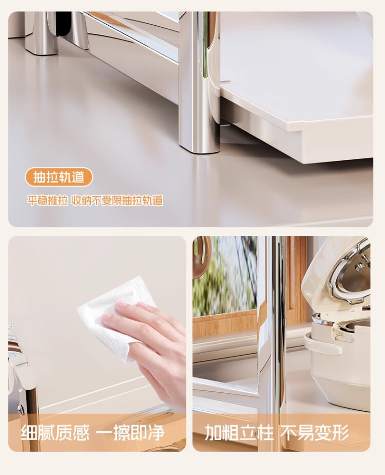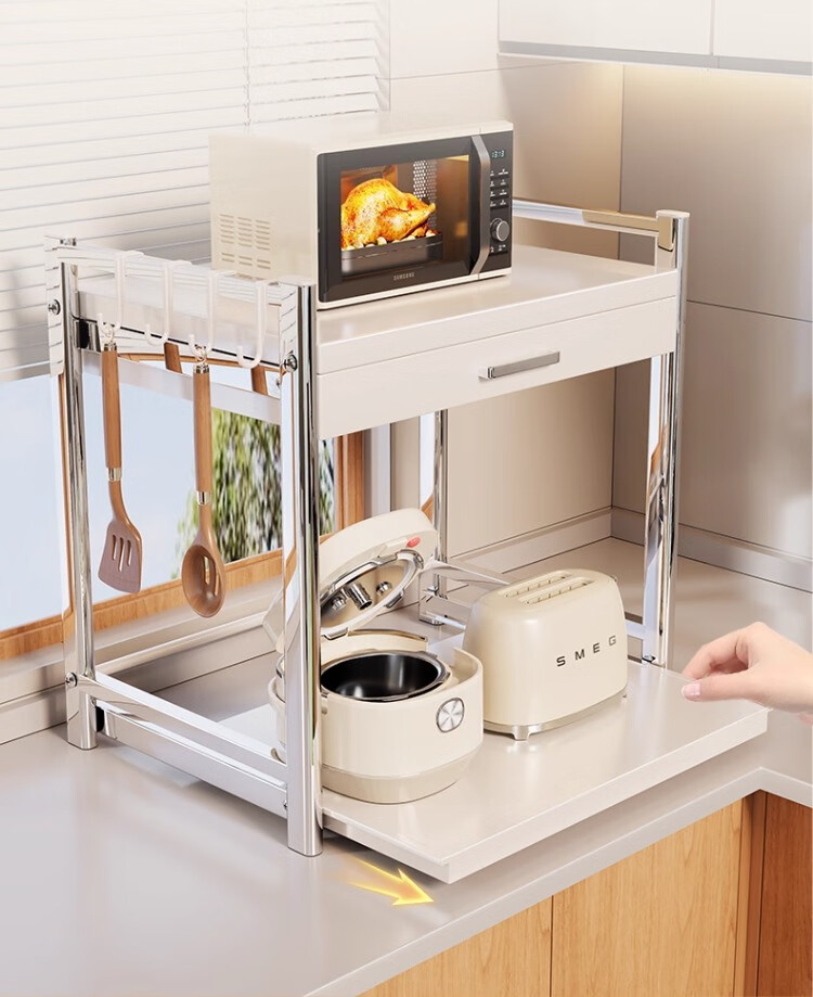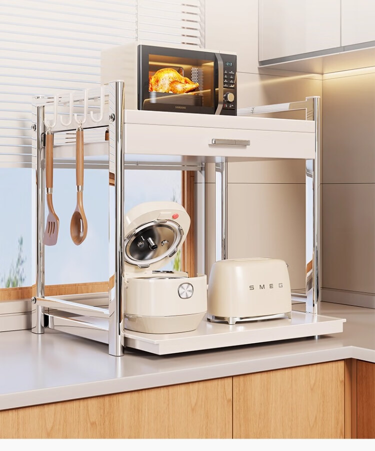 尔思家微波炉置物架厨房台面多用电饭煲烤箱双层收纳架子多功能可抽拉架 奶白银大号【抽屉款】送4挂钩