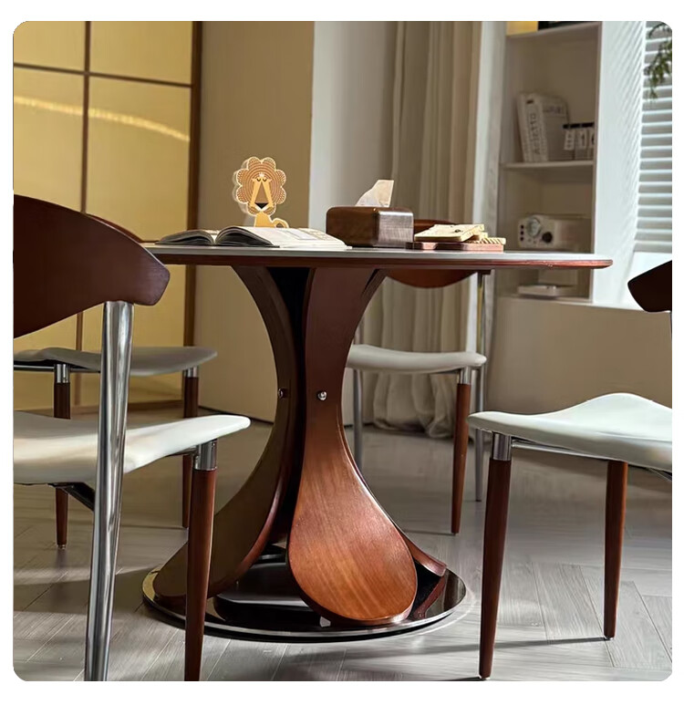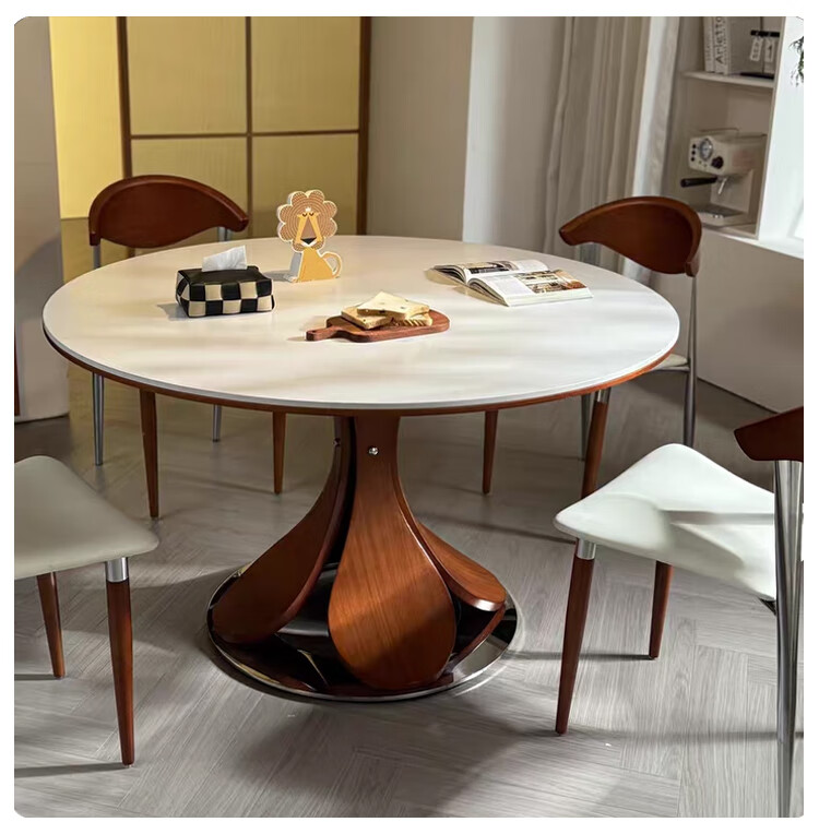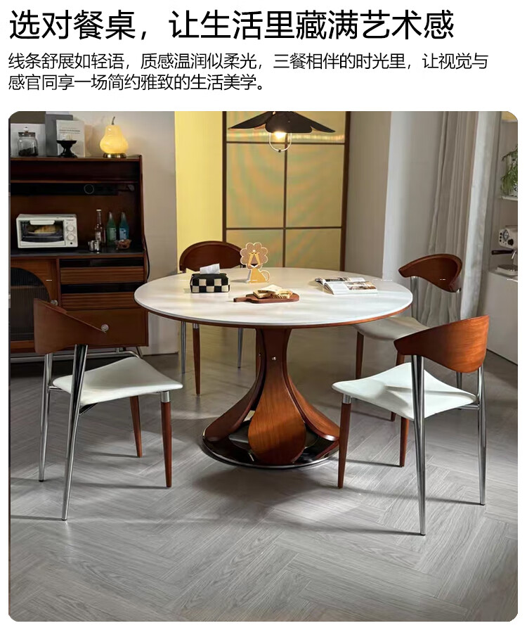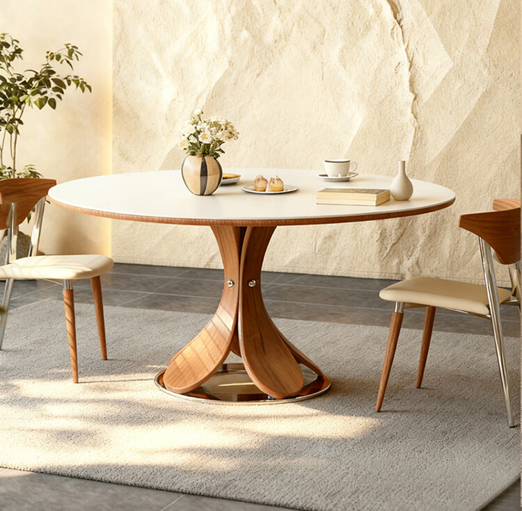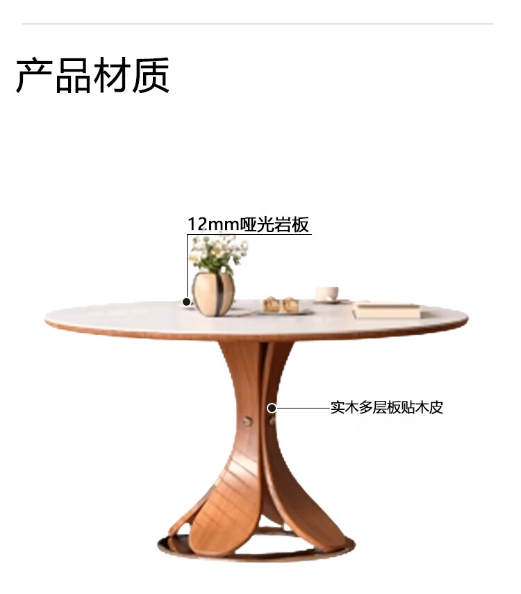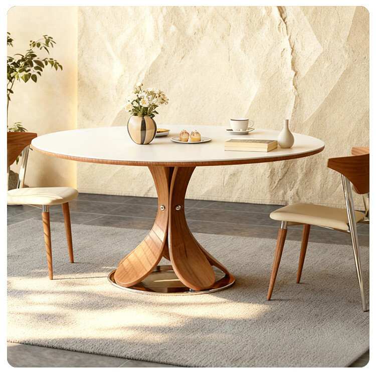 欧荷家具花瓣中古风洞石岩板餐桌家用小户型白蜡木圆桌复古饭厅餐桌椅组合 花瓣餐桌 1m【哑光纯白岩板+实木全托底板】