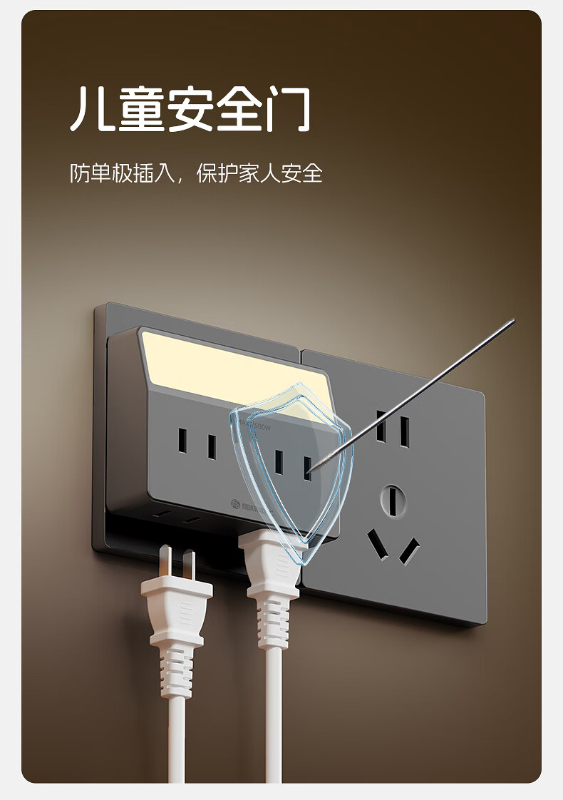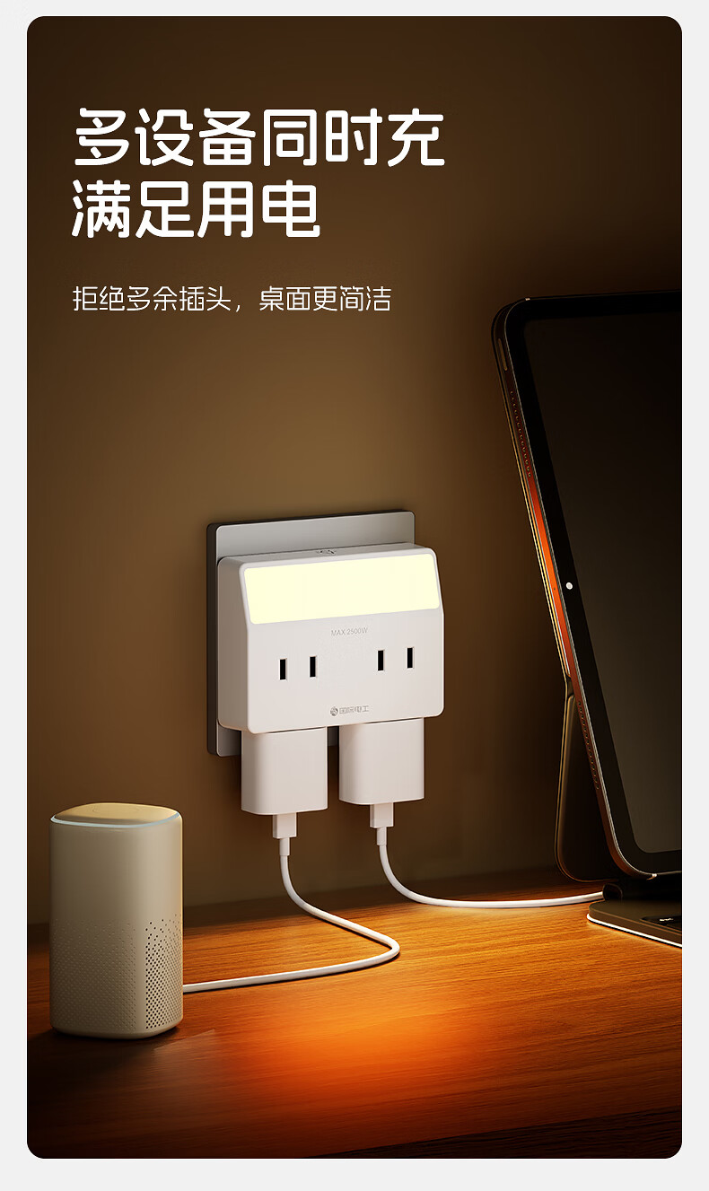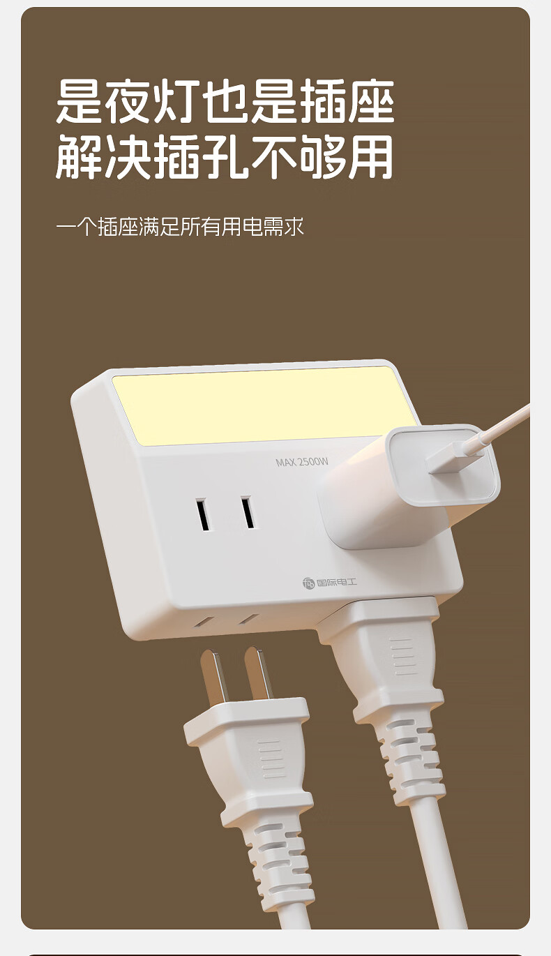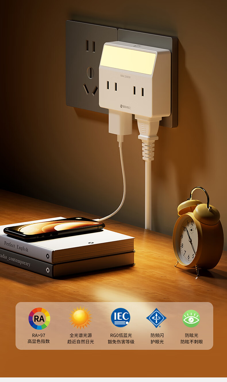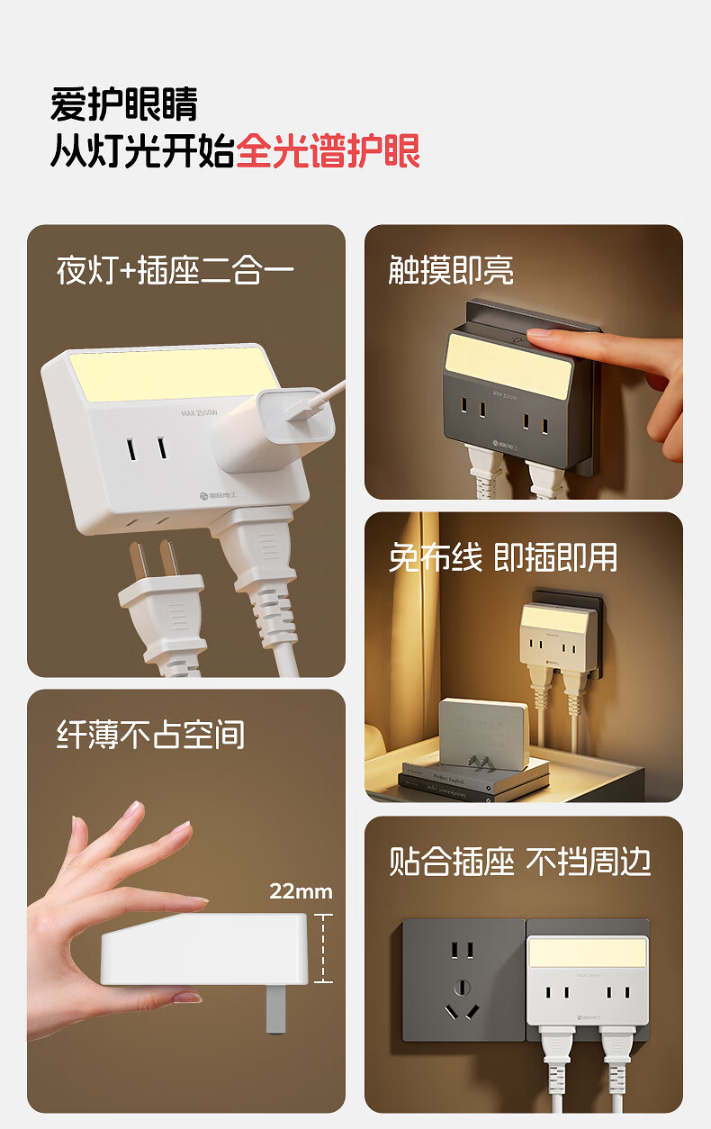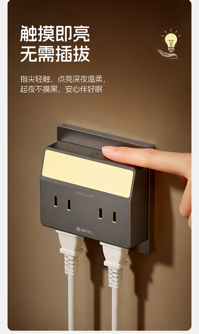 国际电工直插拓展无线插座转换器一转四卧室床头全光谱触摸小夜灯扩展插排 【灰色触摸款】一转四夜灯插座