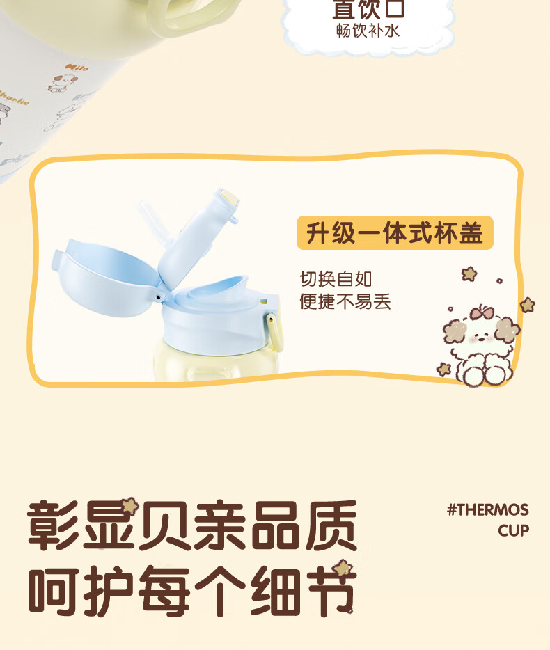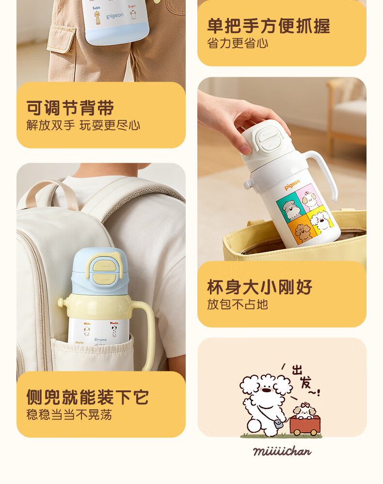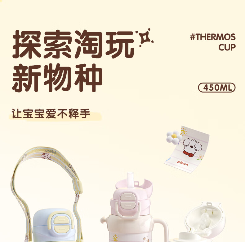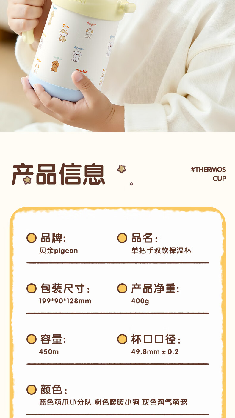 贝亲保温杯儿童水杯316不锈钢外出杯单手柄双饮杯450ML(粉色暖暖小狗)