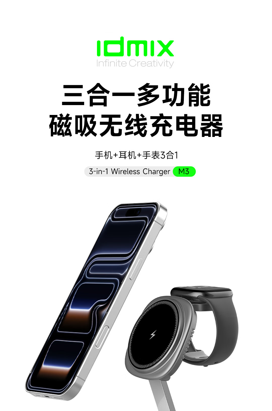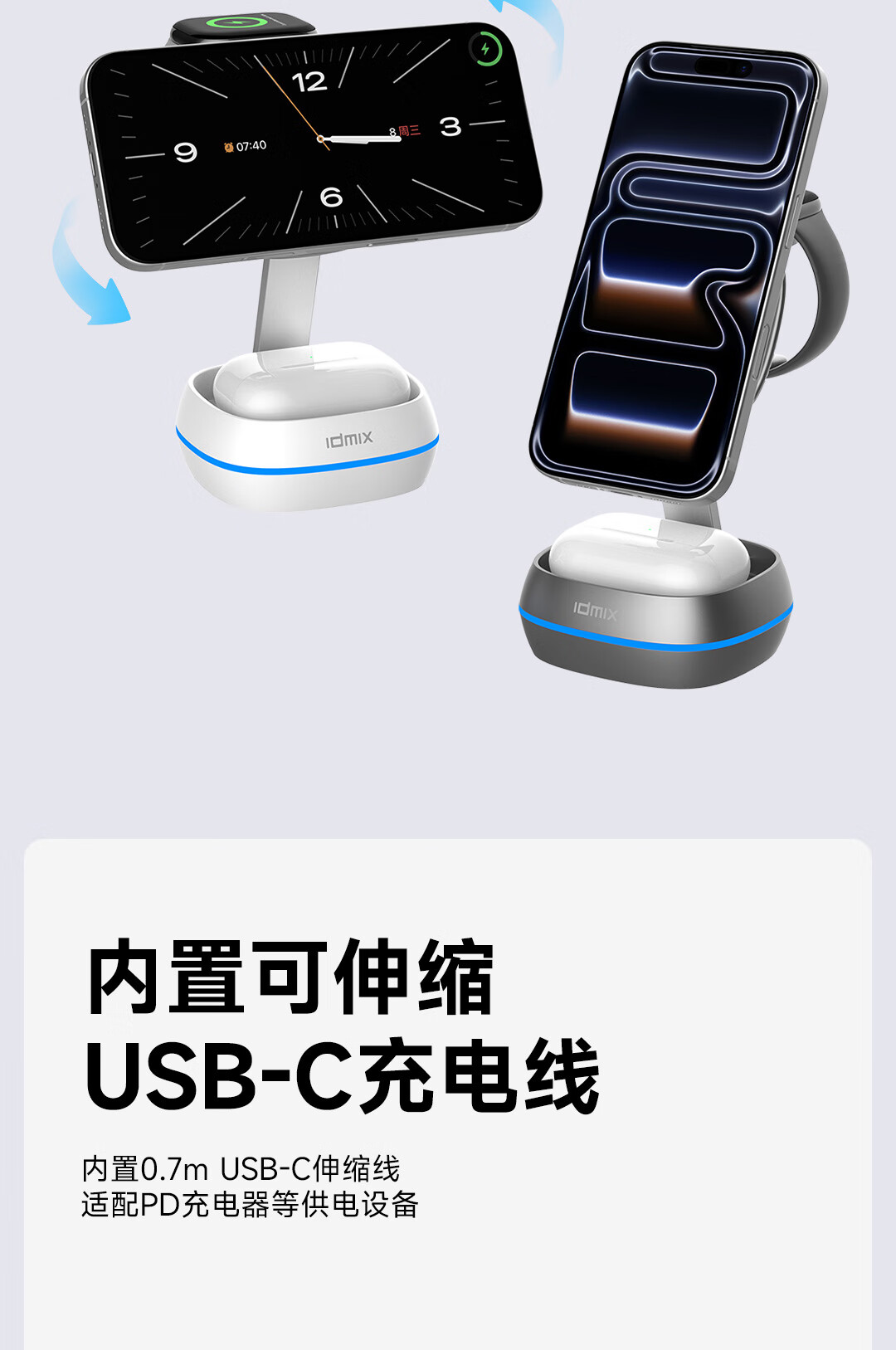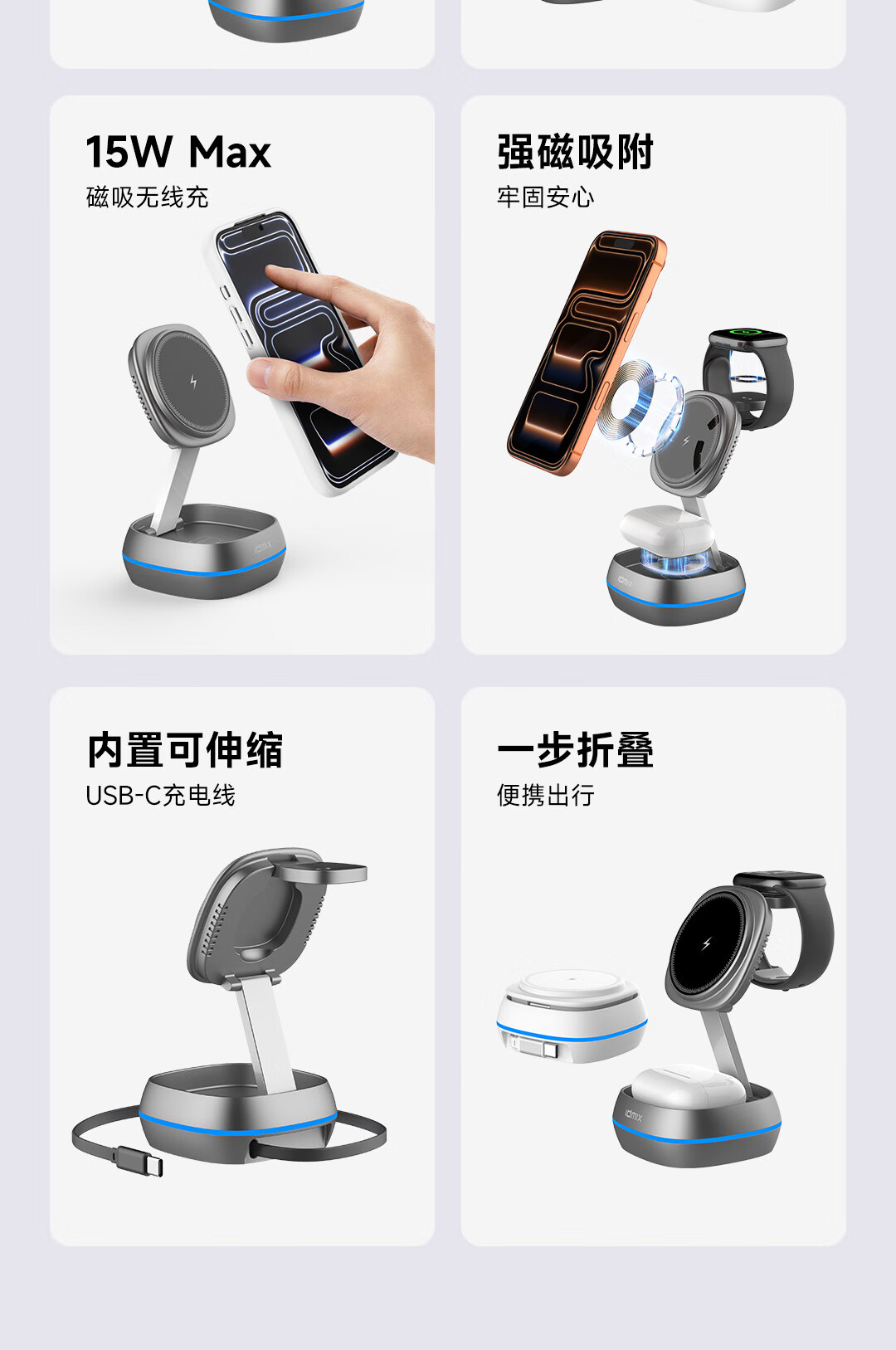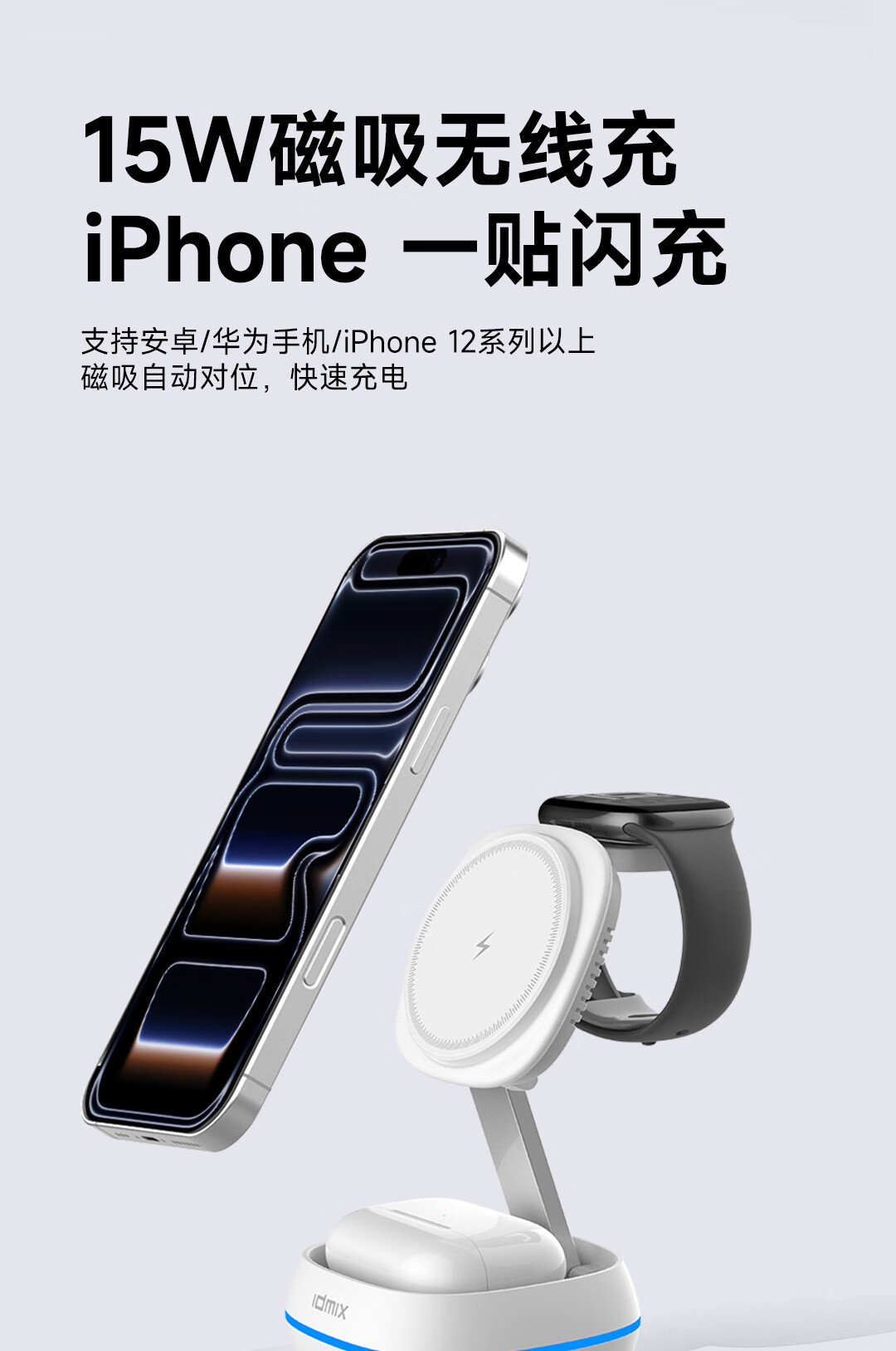 IDMIX三合一无线充电器磁吸带支架适用iPhone17/16/15Pro手机 【白色】自带伸缩线15W无线磁吸充电器