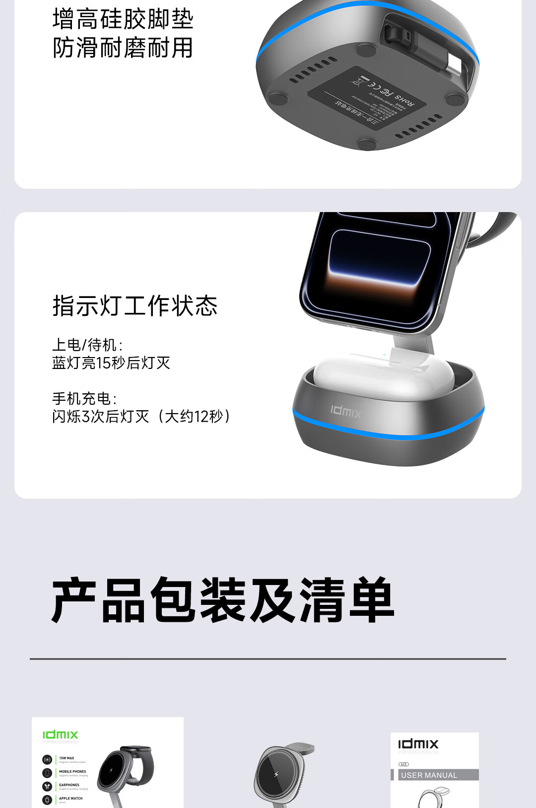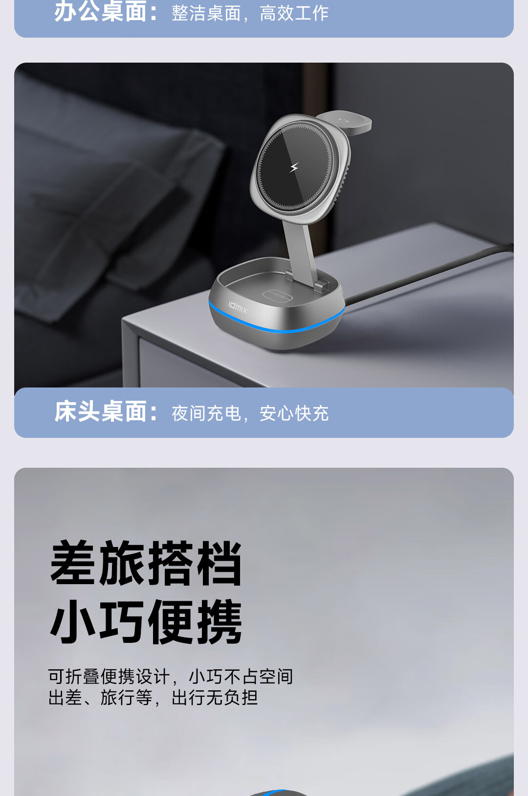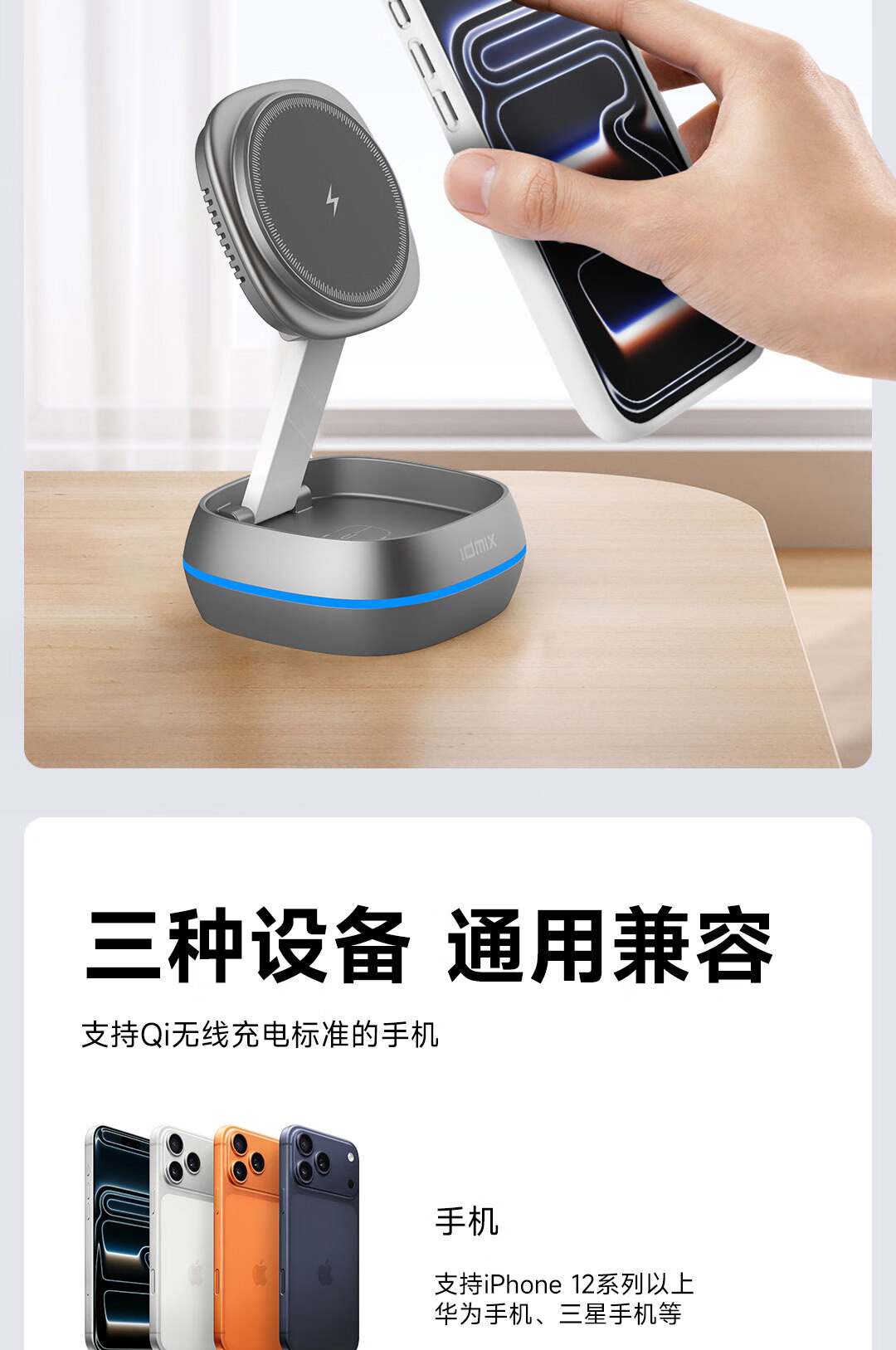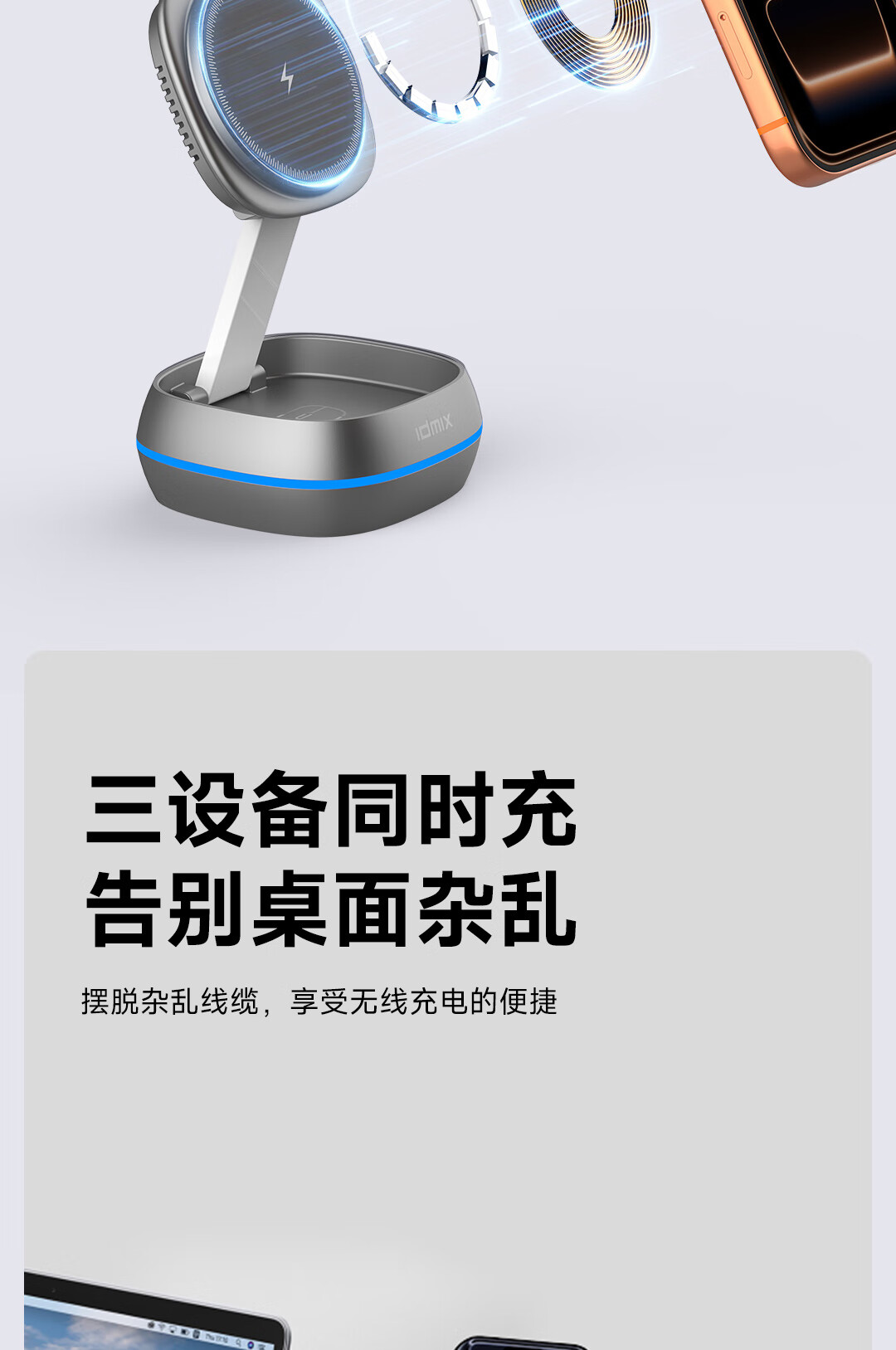 IDMIX三合一无线充电器磁吸带支架适用iPhone17/16/15Pro手机 【白色】自带伸缩线15W无线磁吸充电器