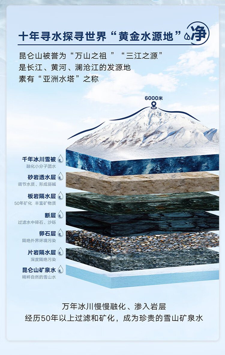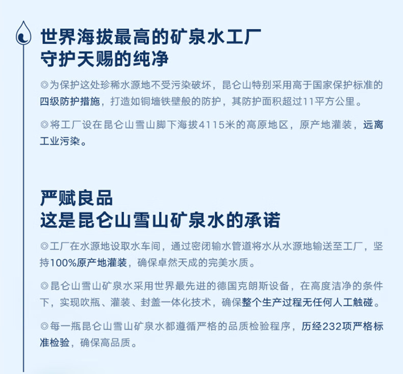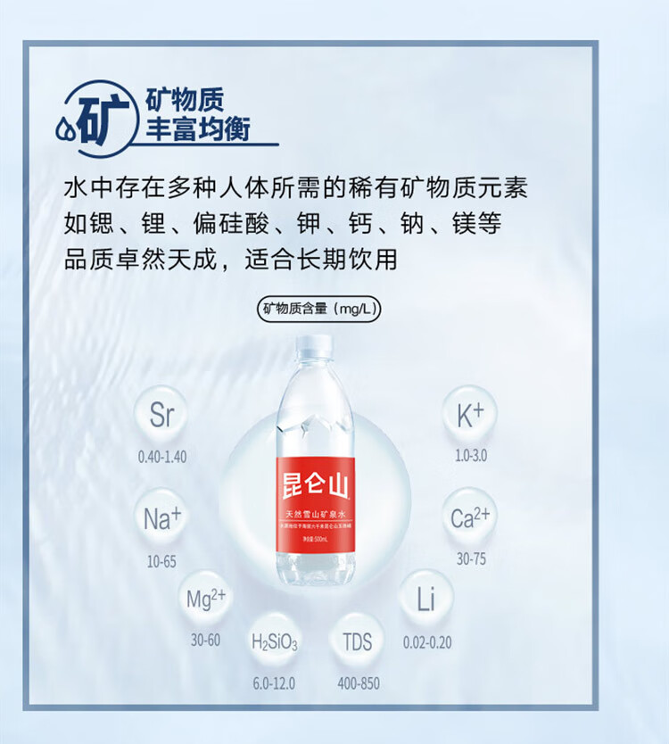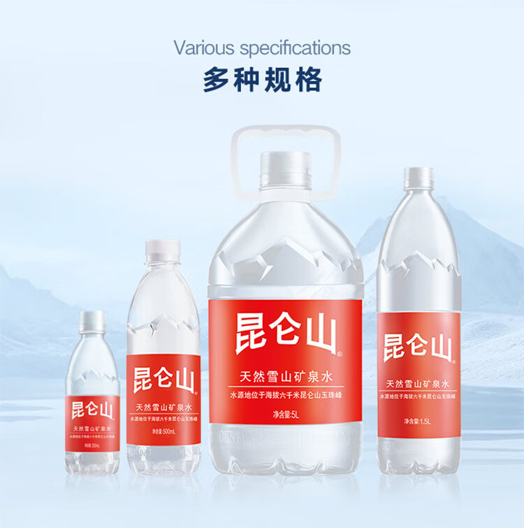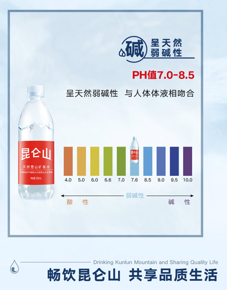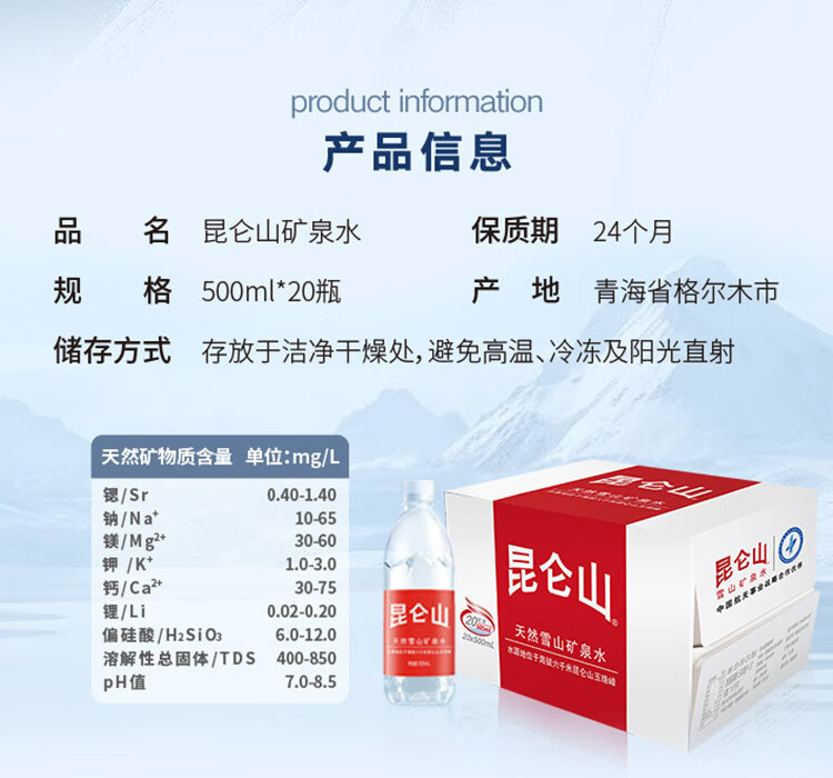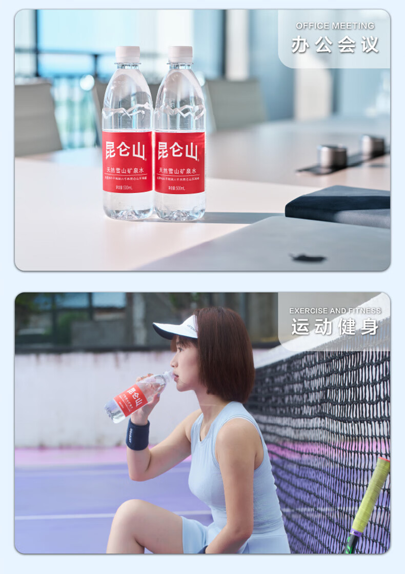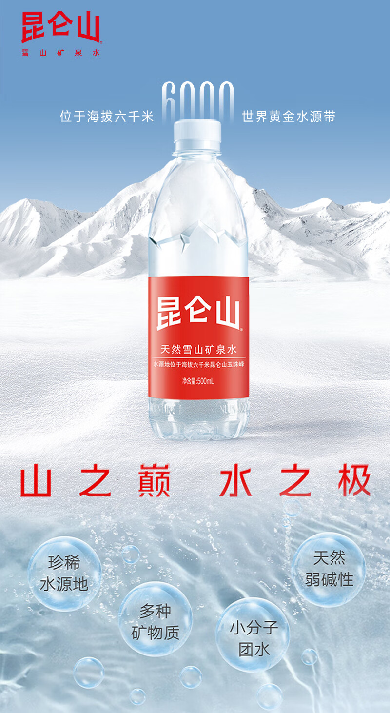 昆仑山矿泉水 饮用天然弱碱性 500ml*20瓶 整箱装 高端矿泉水