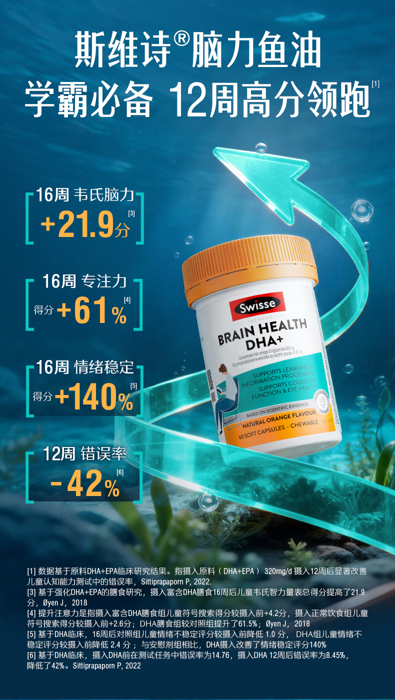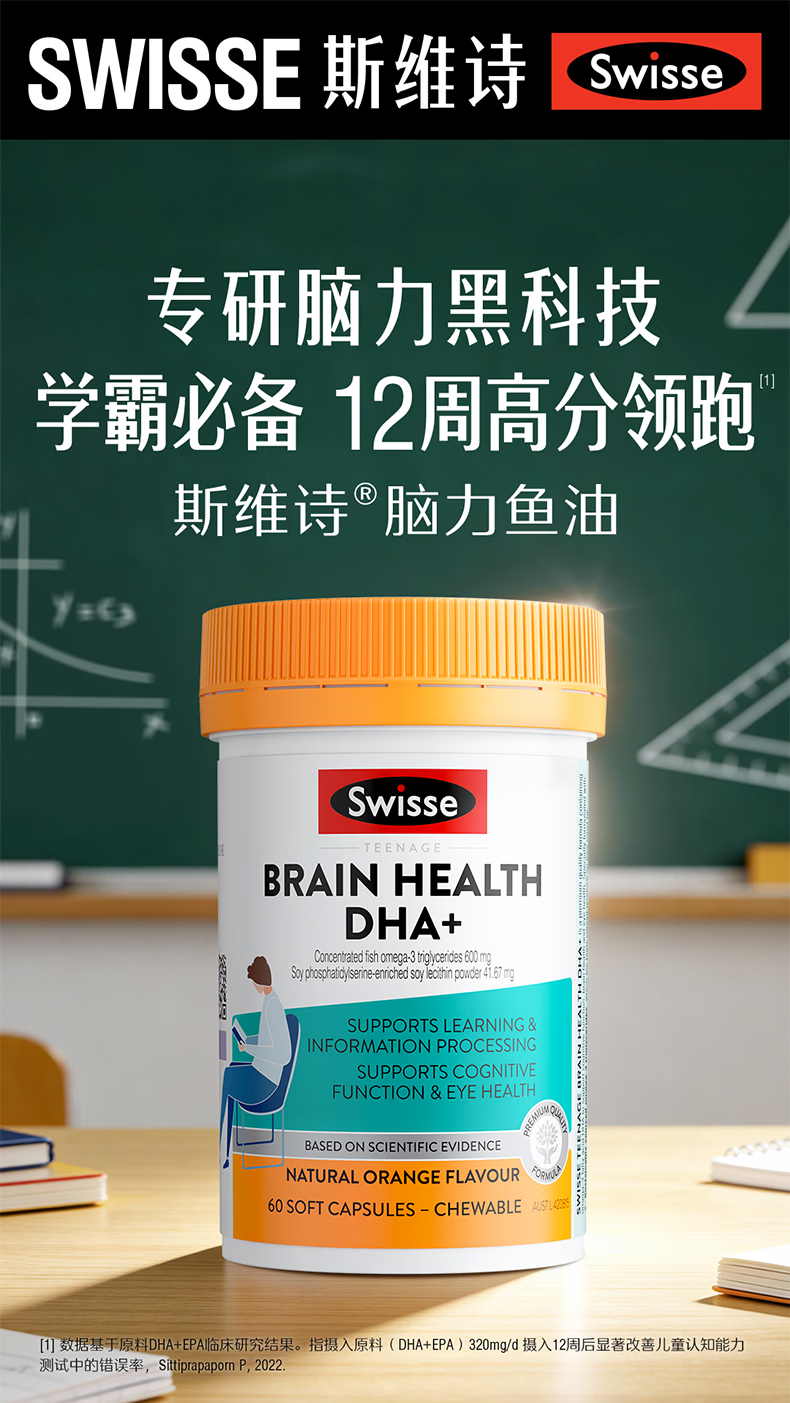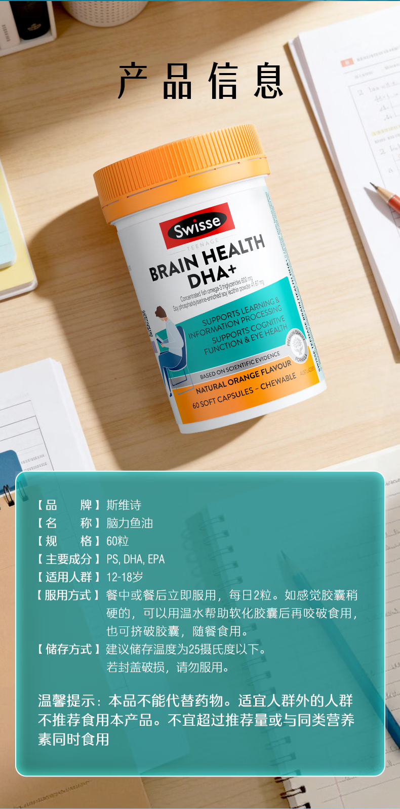 Swisse斯维诗 青少年脑力鱼油rTG型鱼油DHA+EPA护眼补脑学习备考60粒/瓶