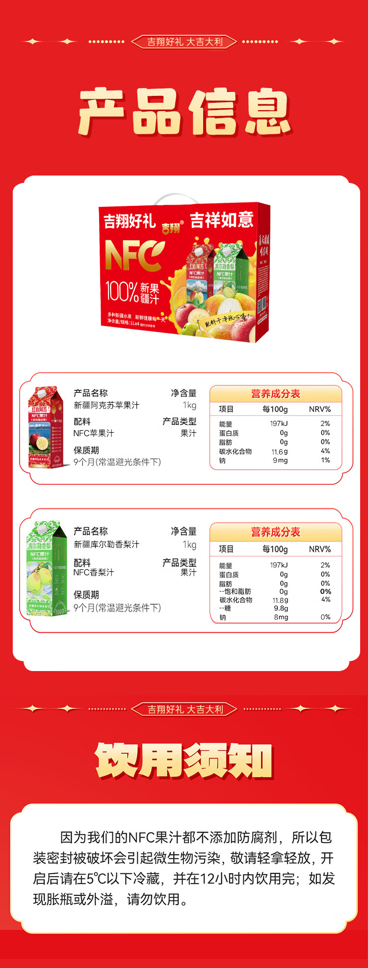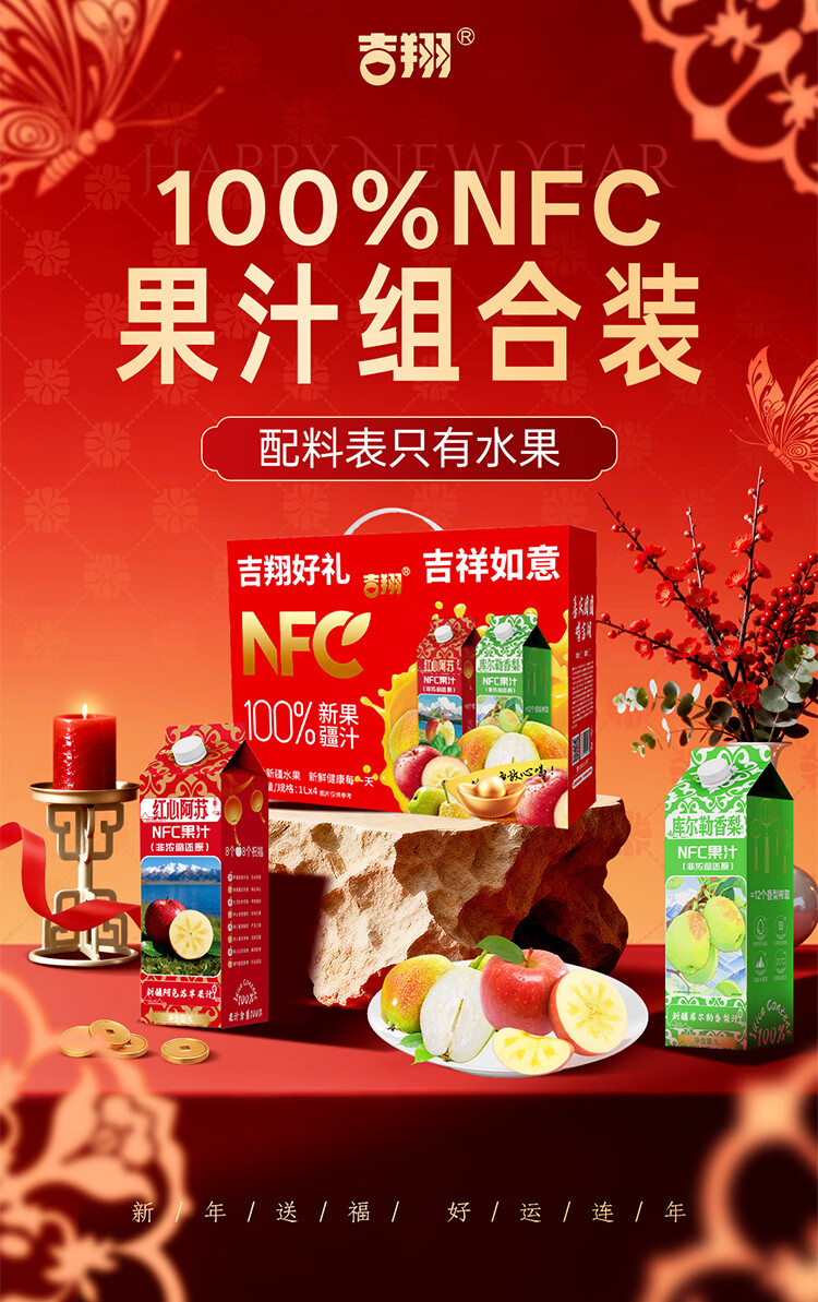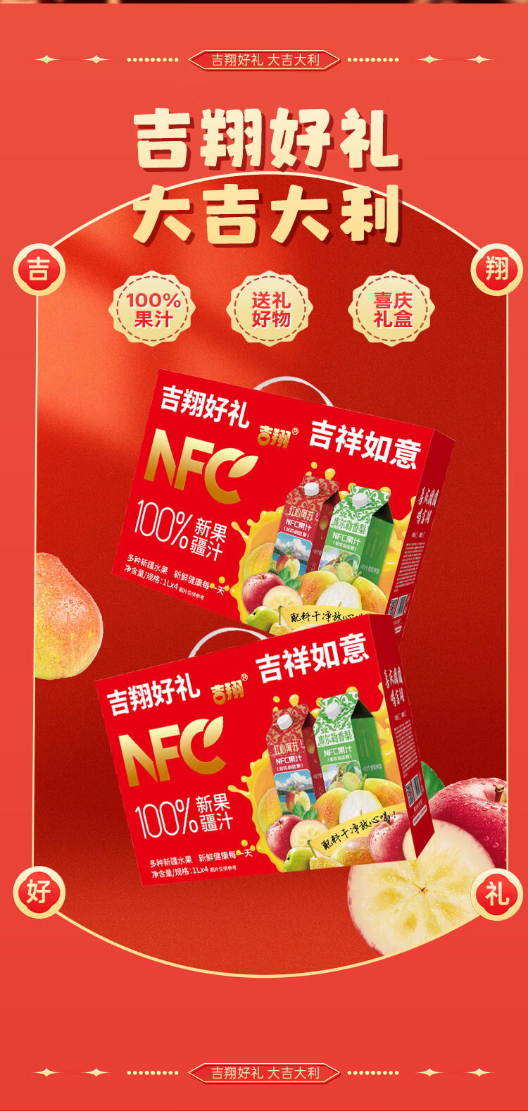 吉翔100%NFC果汁2种口味礼盒装 过年聚会酒宴送礼多口味果汁饮料 库尔勒香梨汁1L*4
