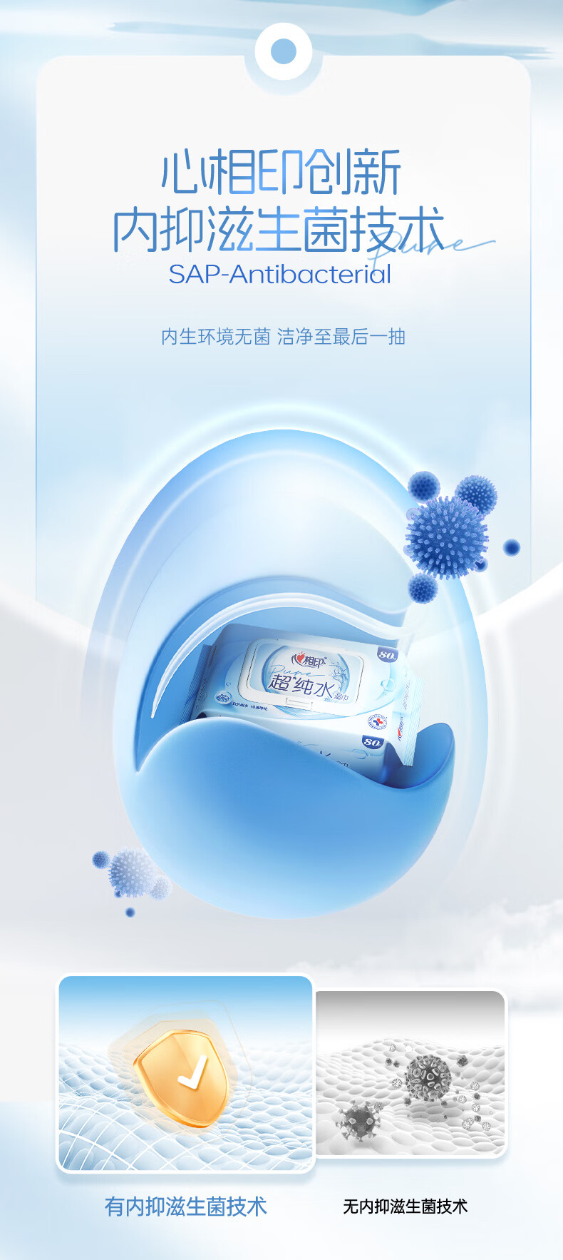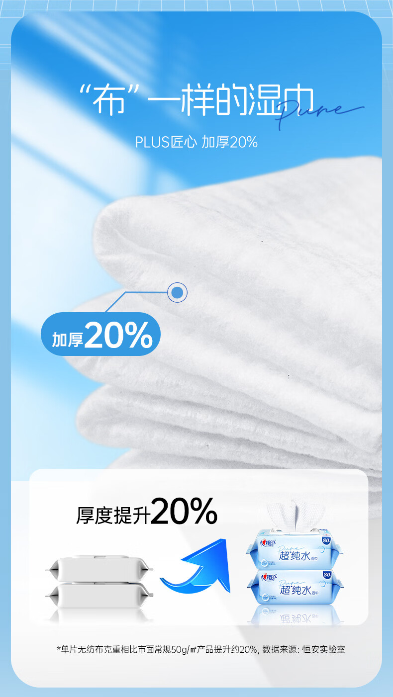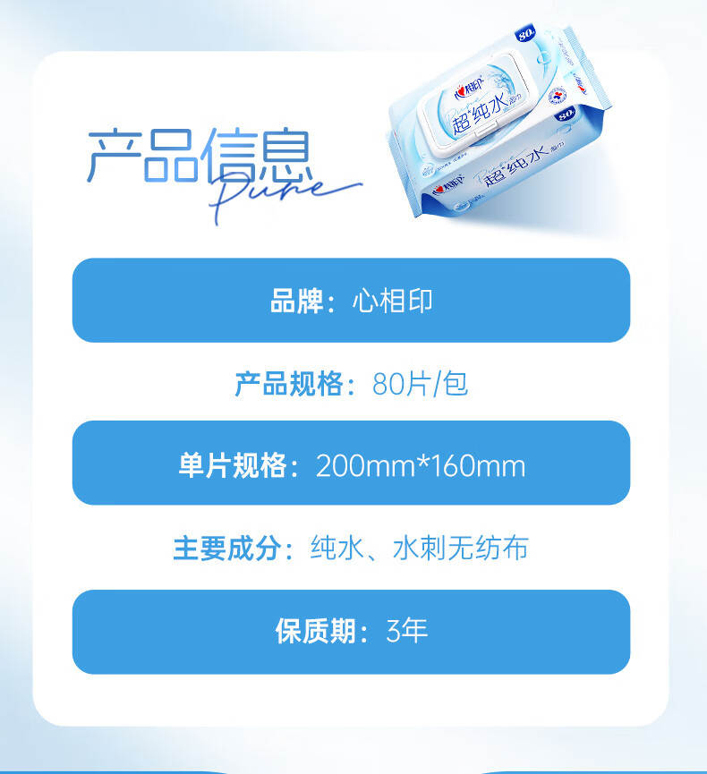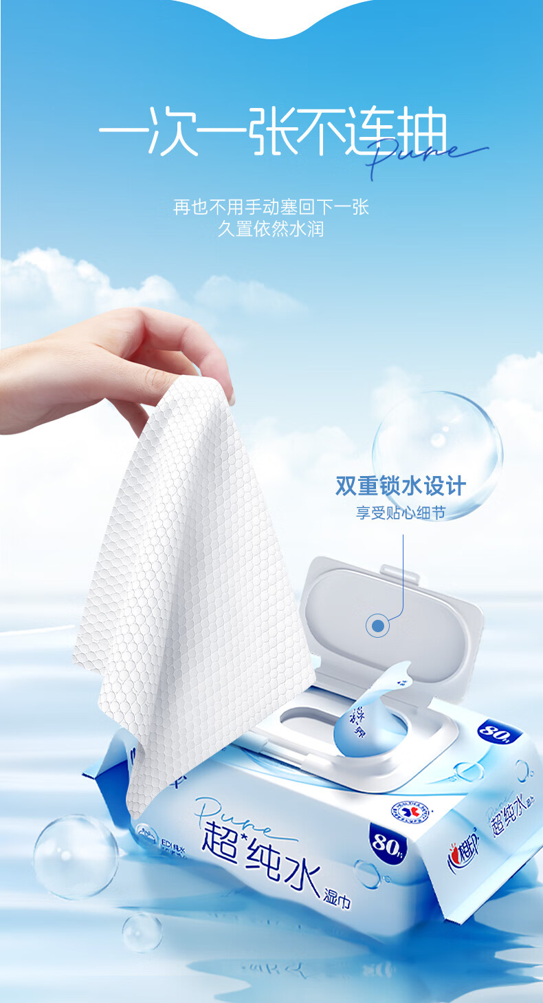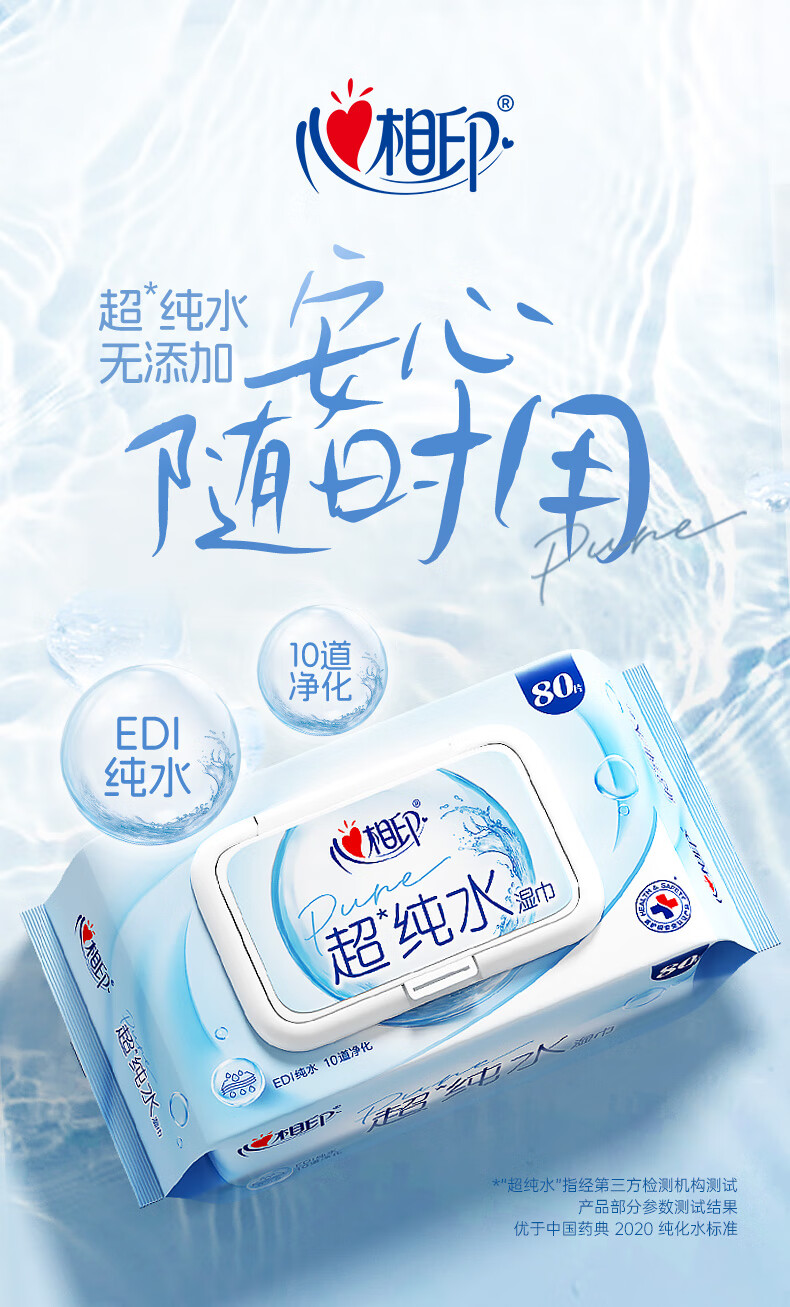 心相印EDI超纯水湿巾80片*8包 婴儿适用手口湿纸巾 亲肤温和无酒精箱装