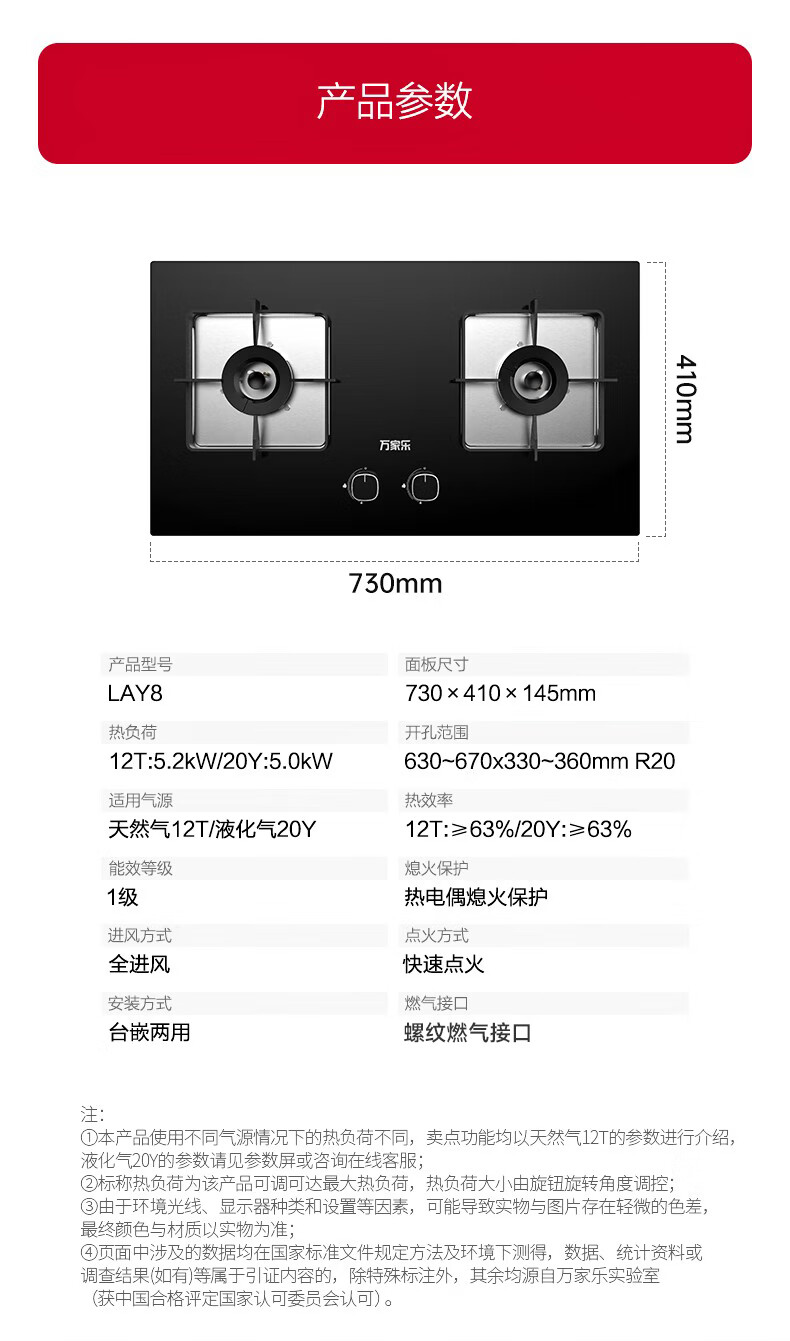 万家乐燃气灶【双高火LAY8】台嵌两用灶 5.2kw大火力嵌入式台式两用换新免扩孔 可适配开孔尺寸天然气灶