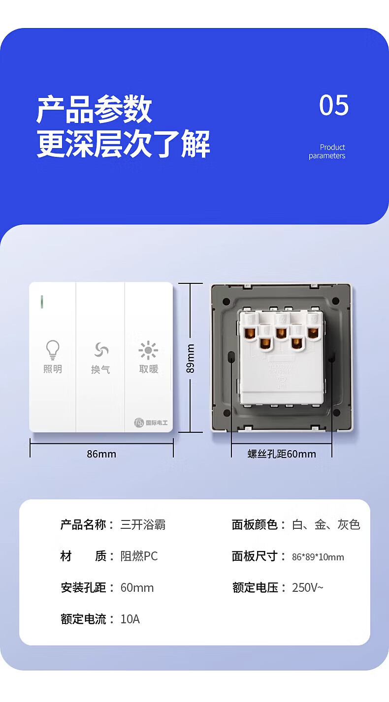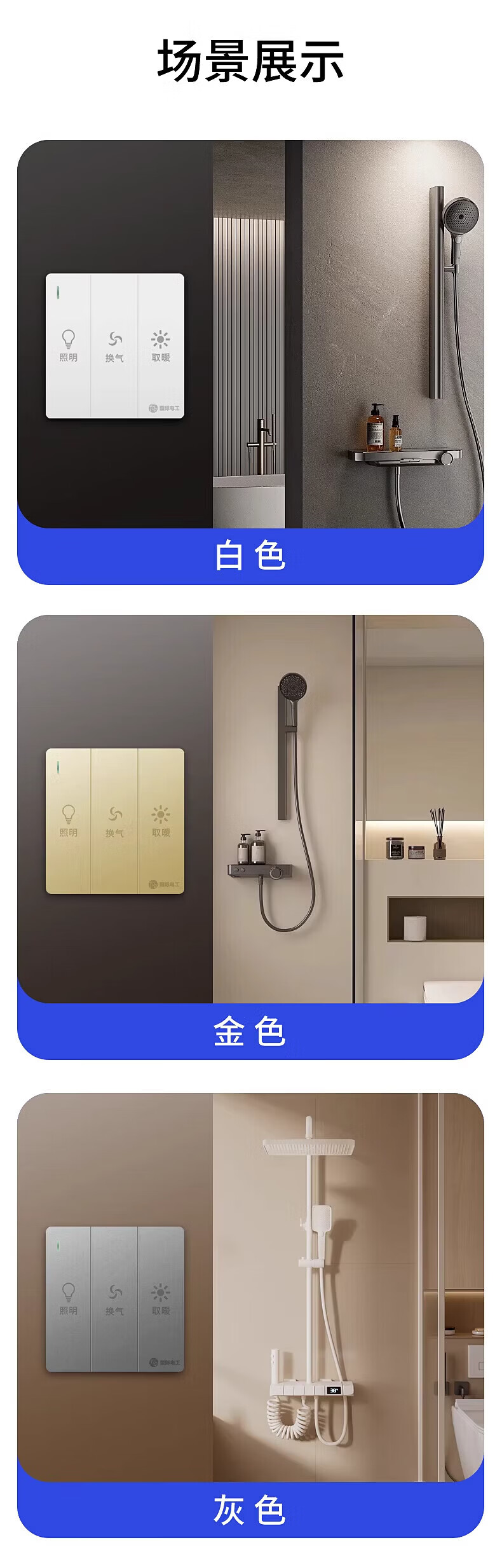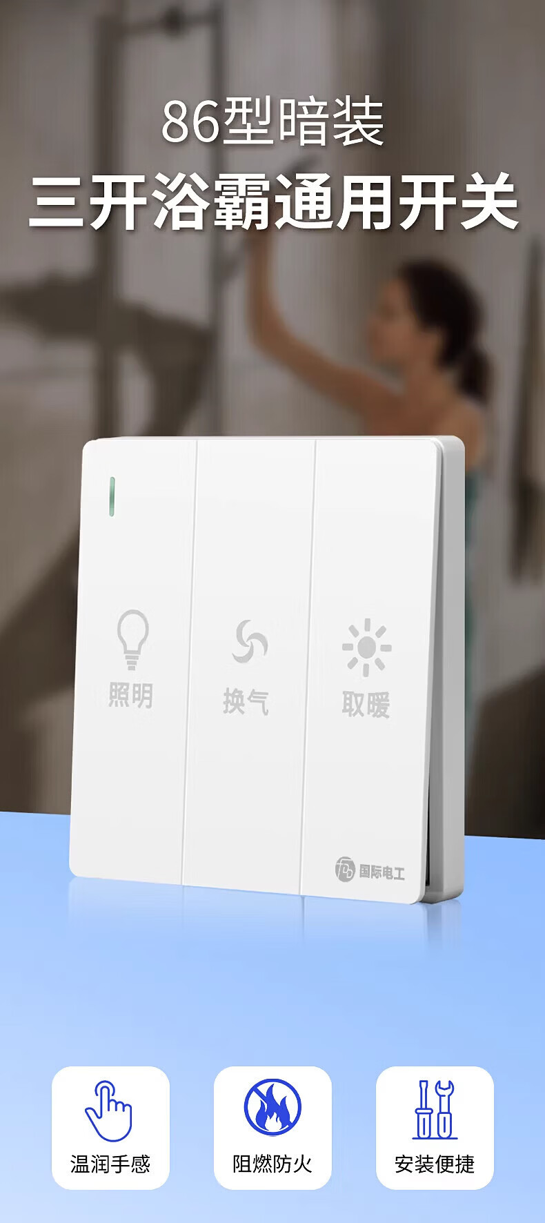 国际电工86型暗装大板三开浴霸开关浴室卫生间照明一体通用开关面板 三开浴霸开关-灰色