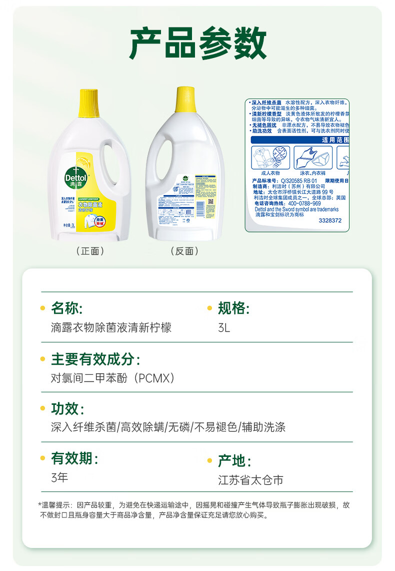滴露(Dettol)衣物除菌液 消毒液 柠檬3L 99.9%杀菌除螨内衣儿童衣物可配洗衣液