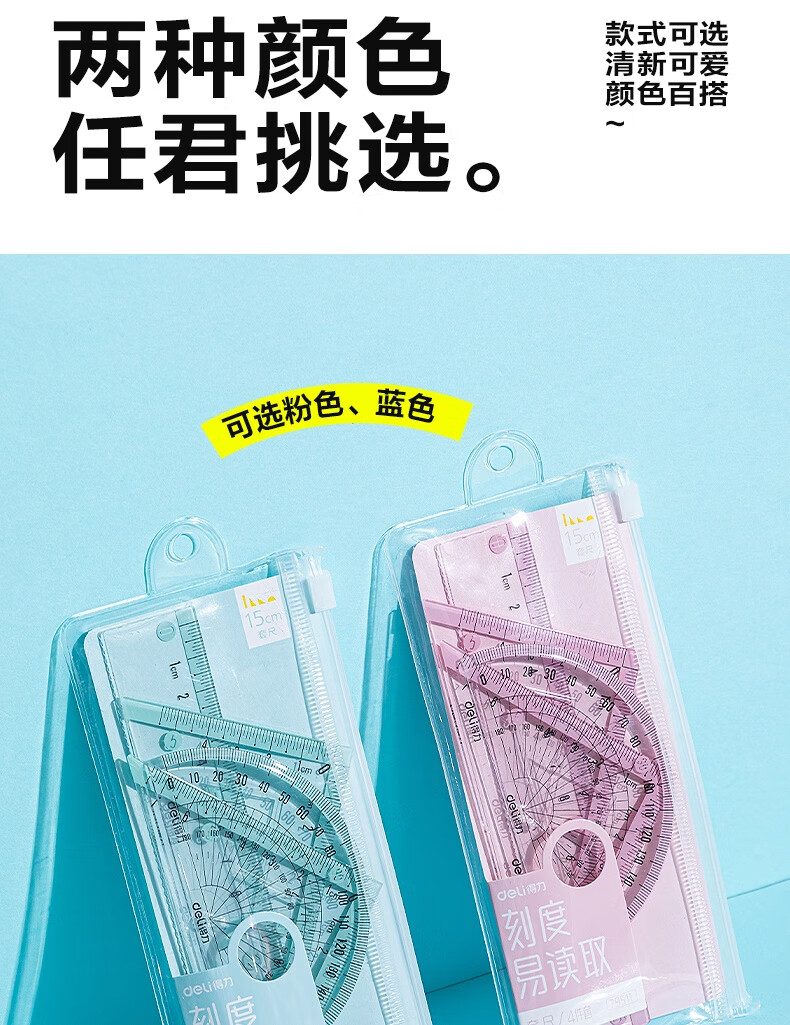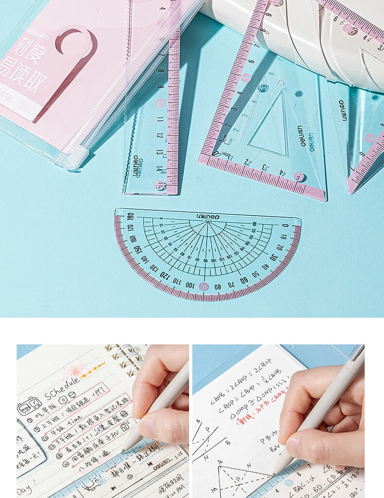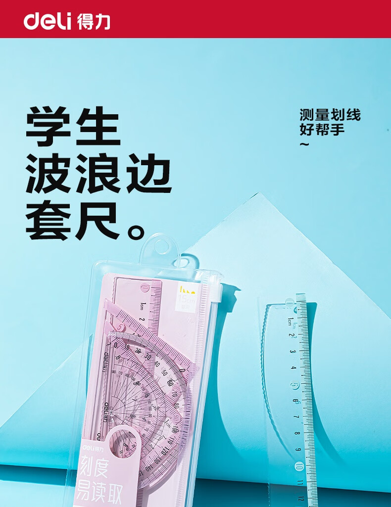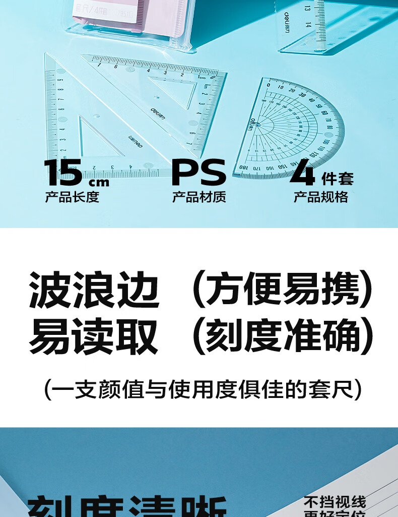 得力学生考研文具高考中考考试绘图套尺(直尺*1+三角尺*2+量角器*1)套装 尺子