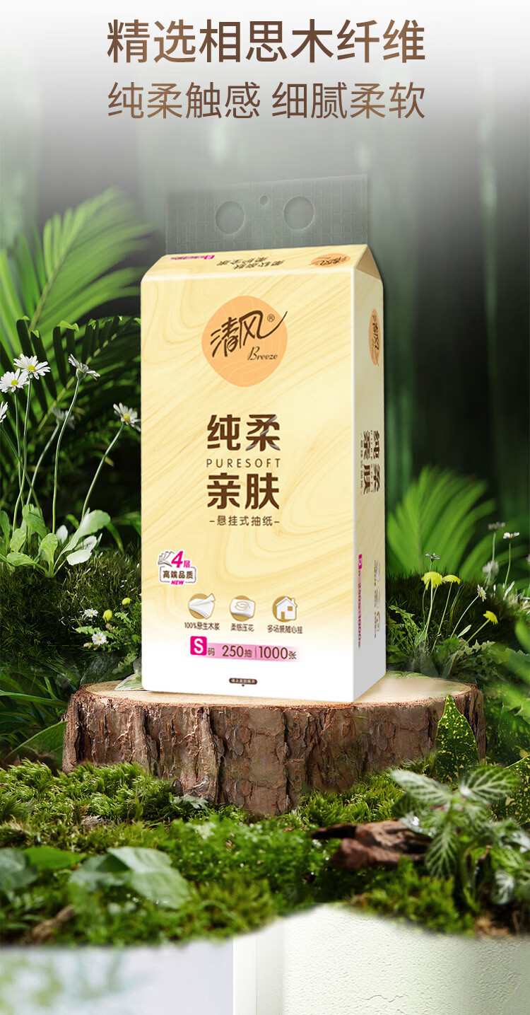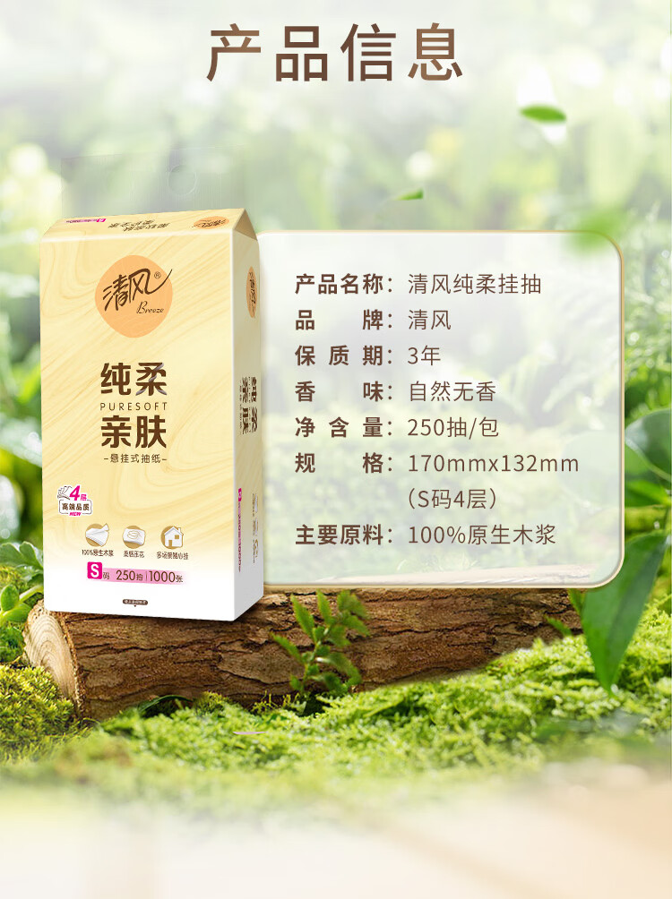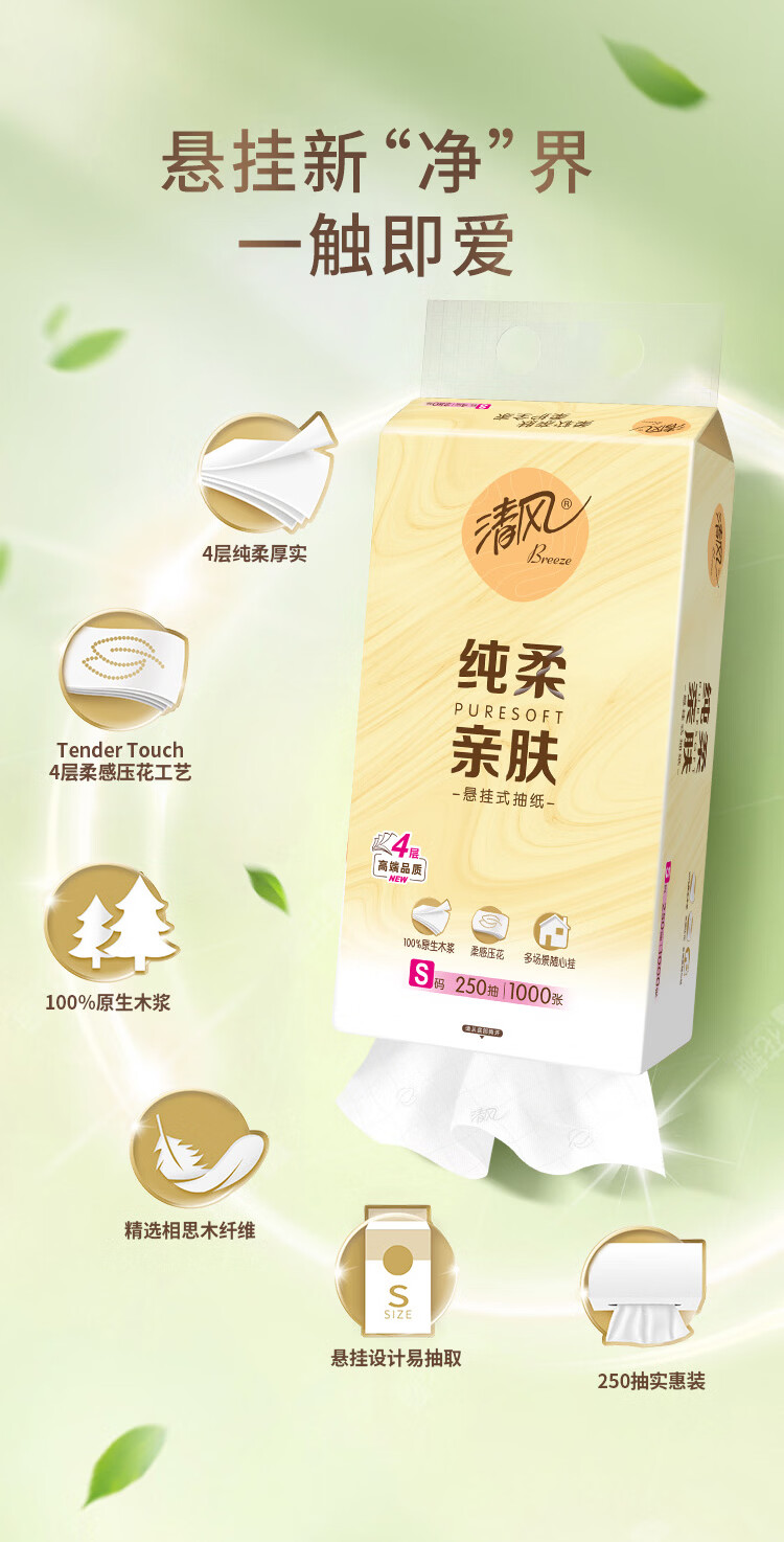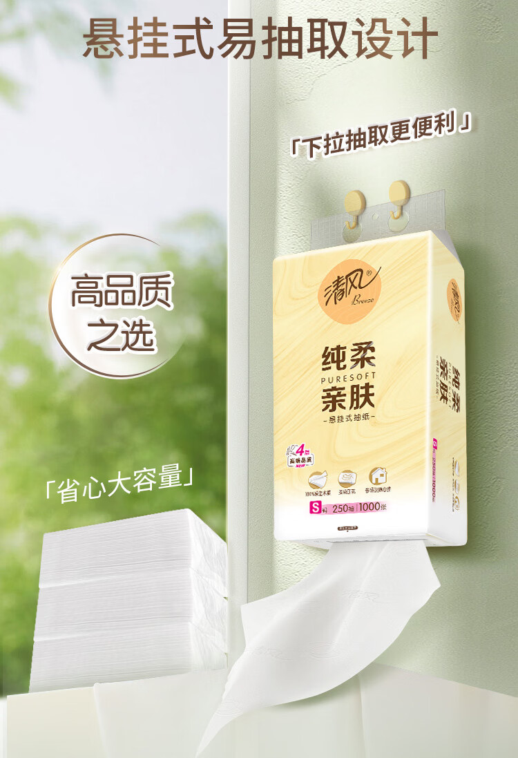 清风纯柔挂抽 4层250抽*6包整箱悬挂式抽纸 家用抽纸量大实惠装