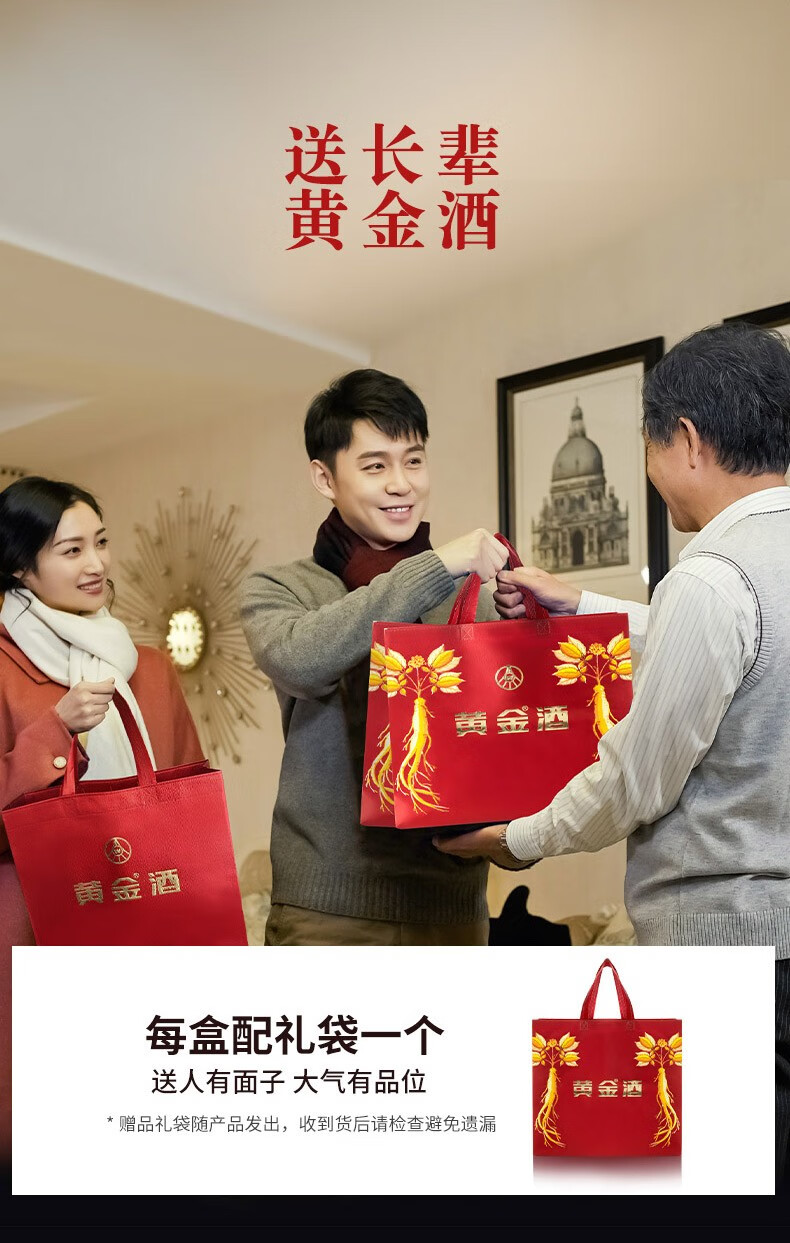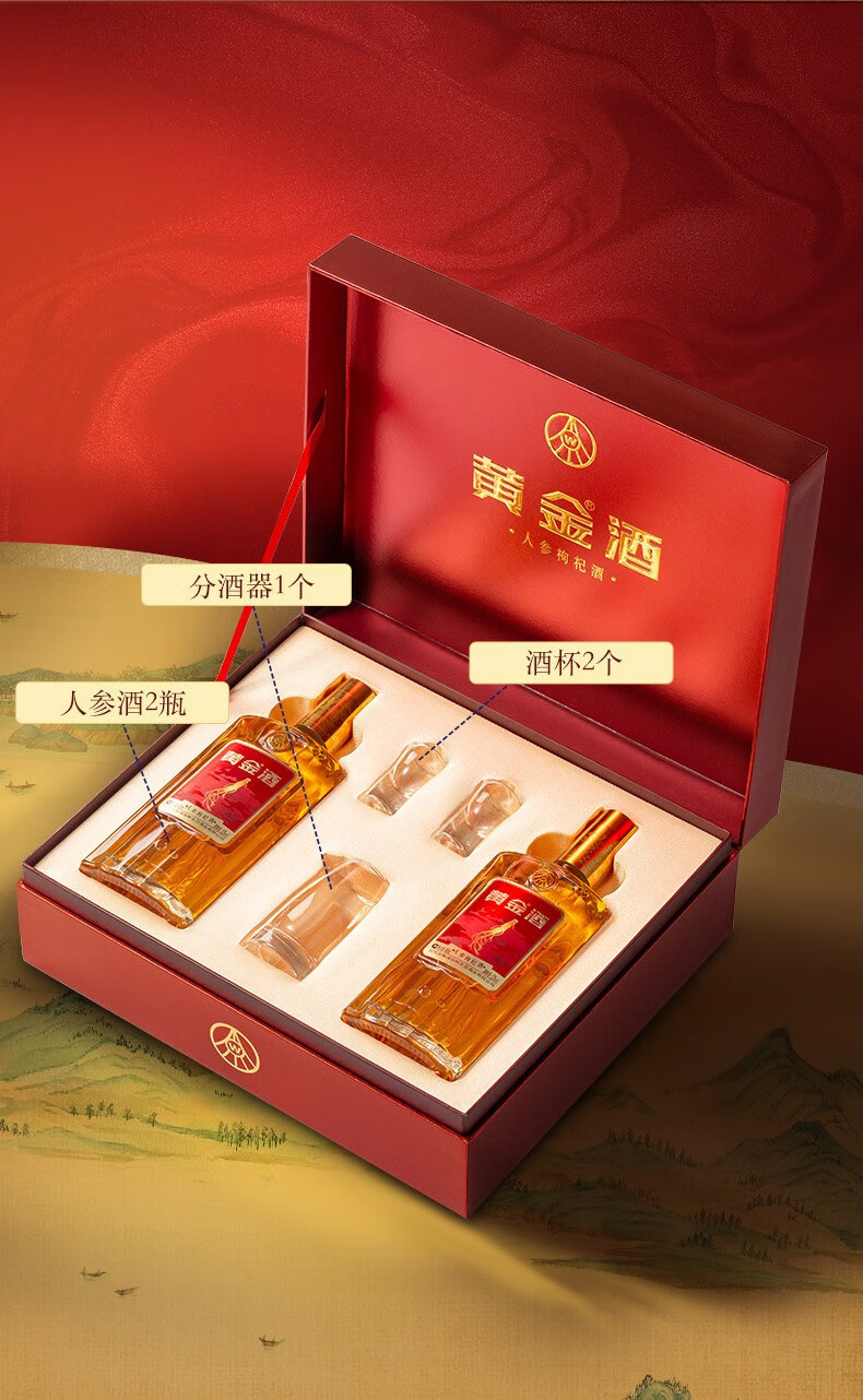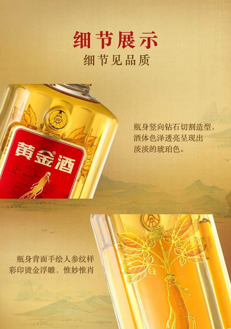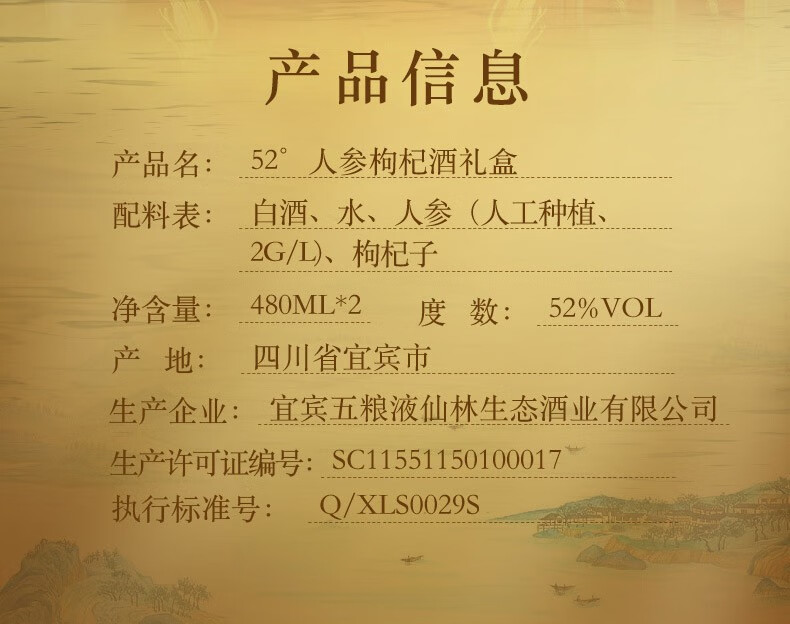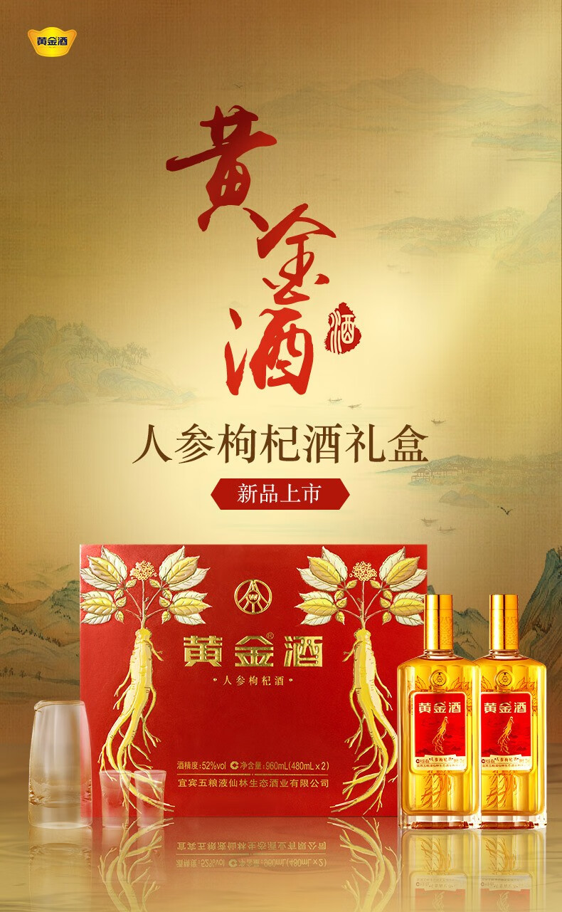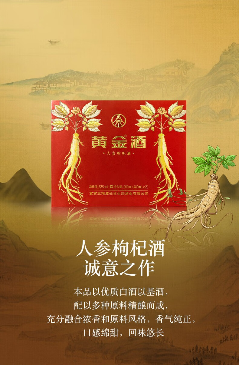 五粮浓香五粮液仙林生态出品 黄金酒 人参枸杞酒礼盒 52度 480mL 2瓶 黄金酒人参枸杞酒
