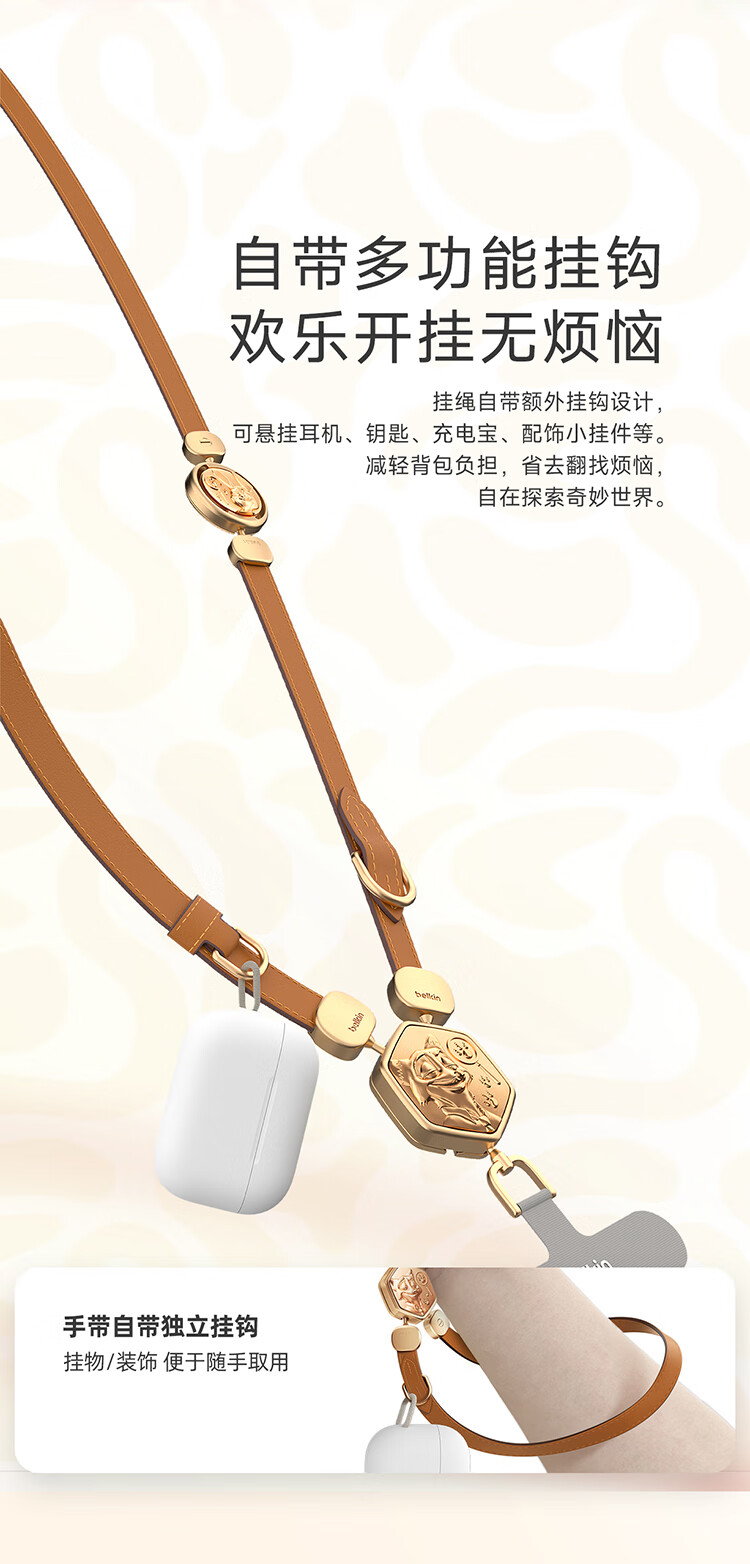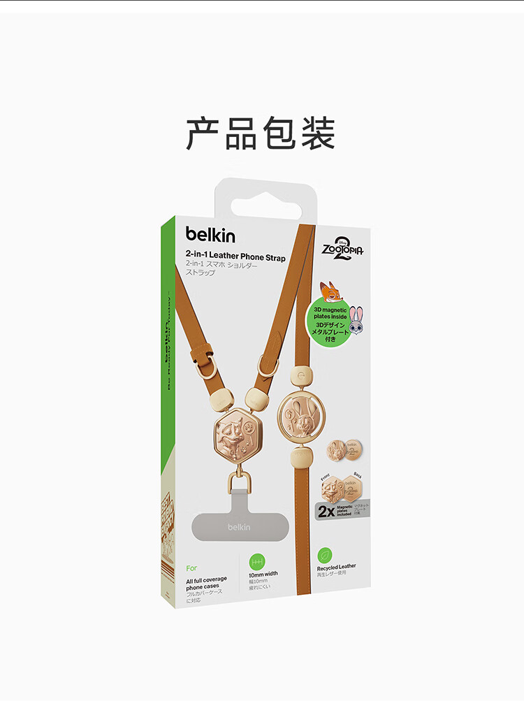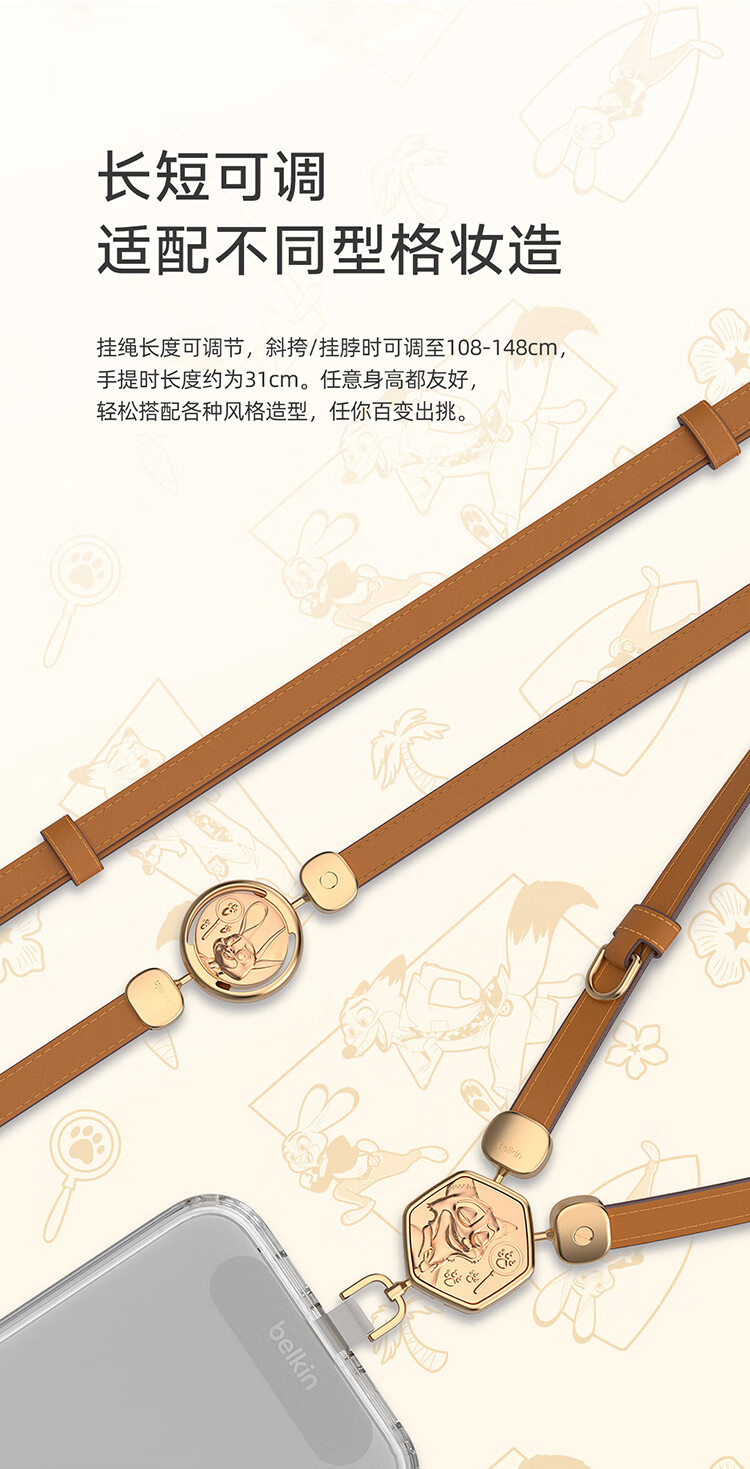贝尔金(BELKIN)手机挂绳手腕 手机链手机绳高级感挂脖斜跨手机防丢绳带手机垫片 皮革二合一 疯狂动物城2
