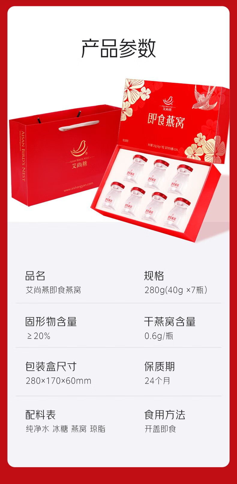 艾尚燕即食燕窝40g*7瓶年货礼盒 礼品送礼父母长辈补品营养品 生日礼物