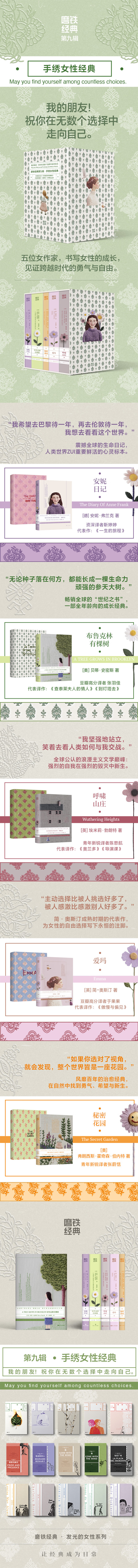 磨铁经典第9辑·手绣女性经典(全5册) 收录《安妮日记》《布鲁克林有棵树》《秘密花园》《爱玛》《呼啸山庄》五部女性经典文学 磨铁