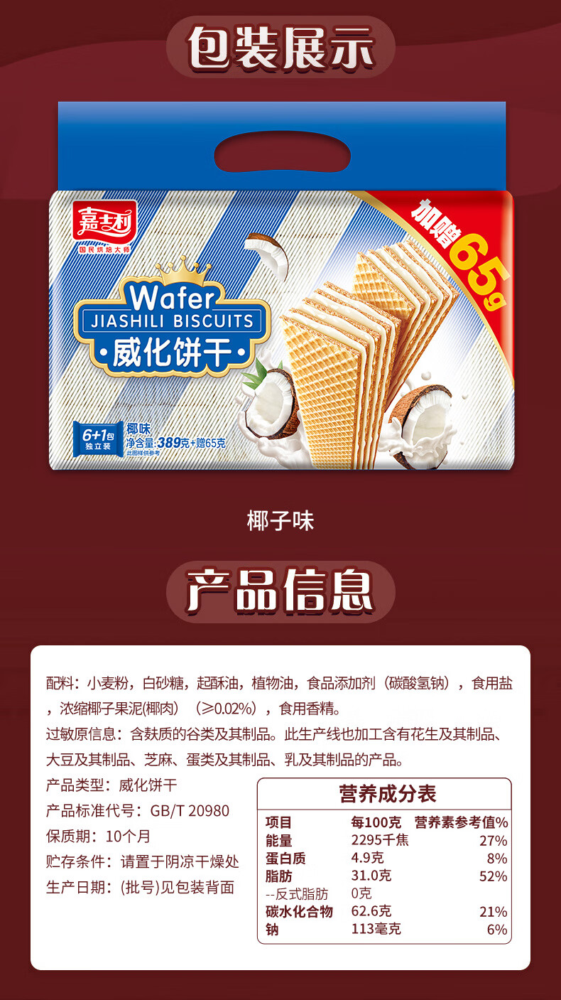 嘉士利威化饼干零食早餐点心夹心饼干 椰味389g+65g/袋 办公室零食代餐