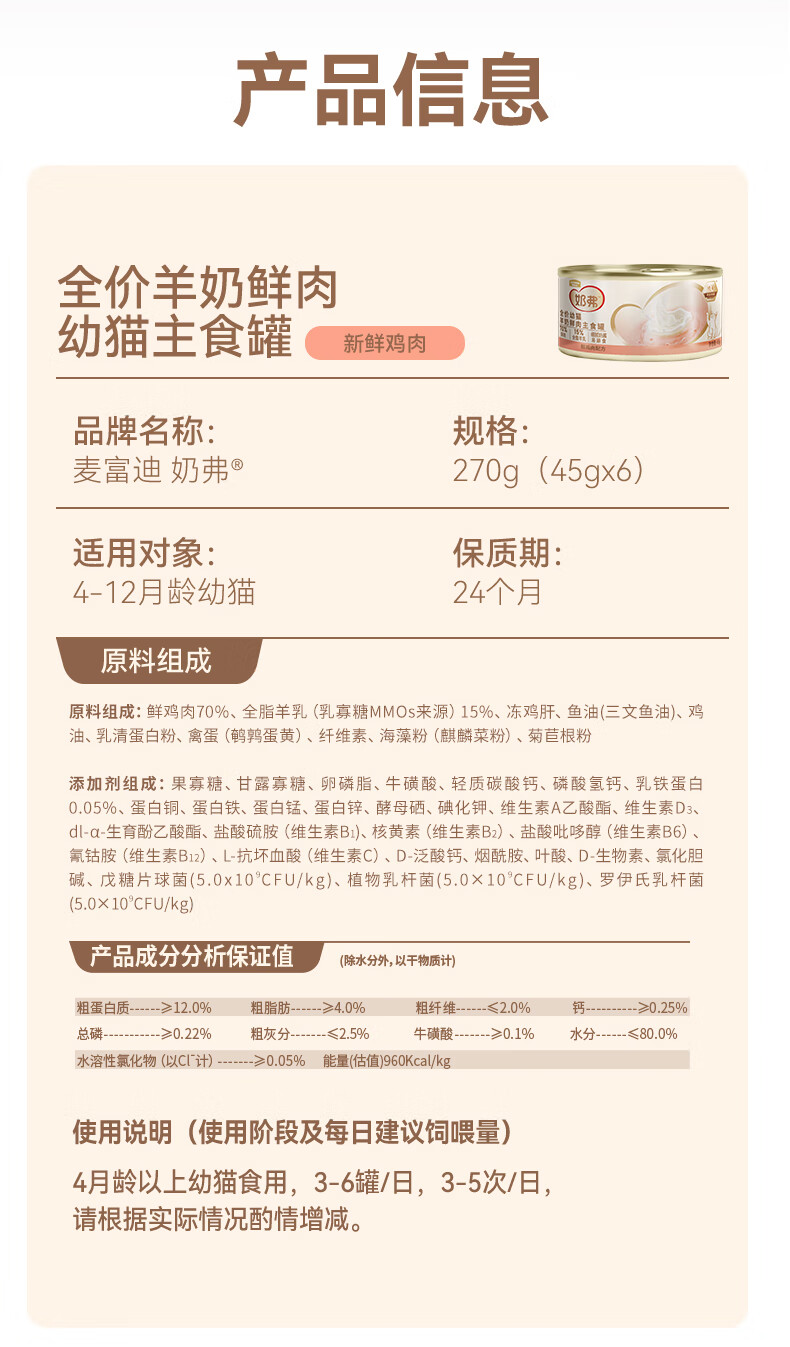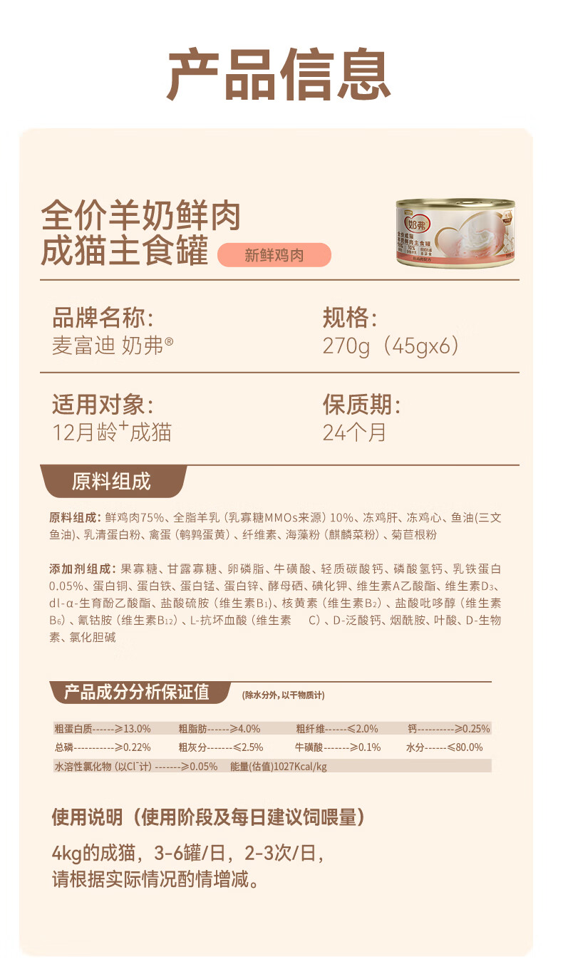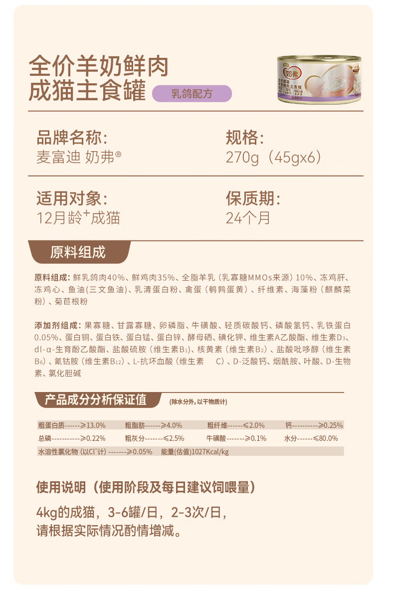 麦富迪 猫湿粮 奶弗羊奶鲜肉主食罐慕斯质地补水易舔食罐头 【成猫】混合装45g*24