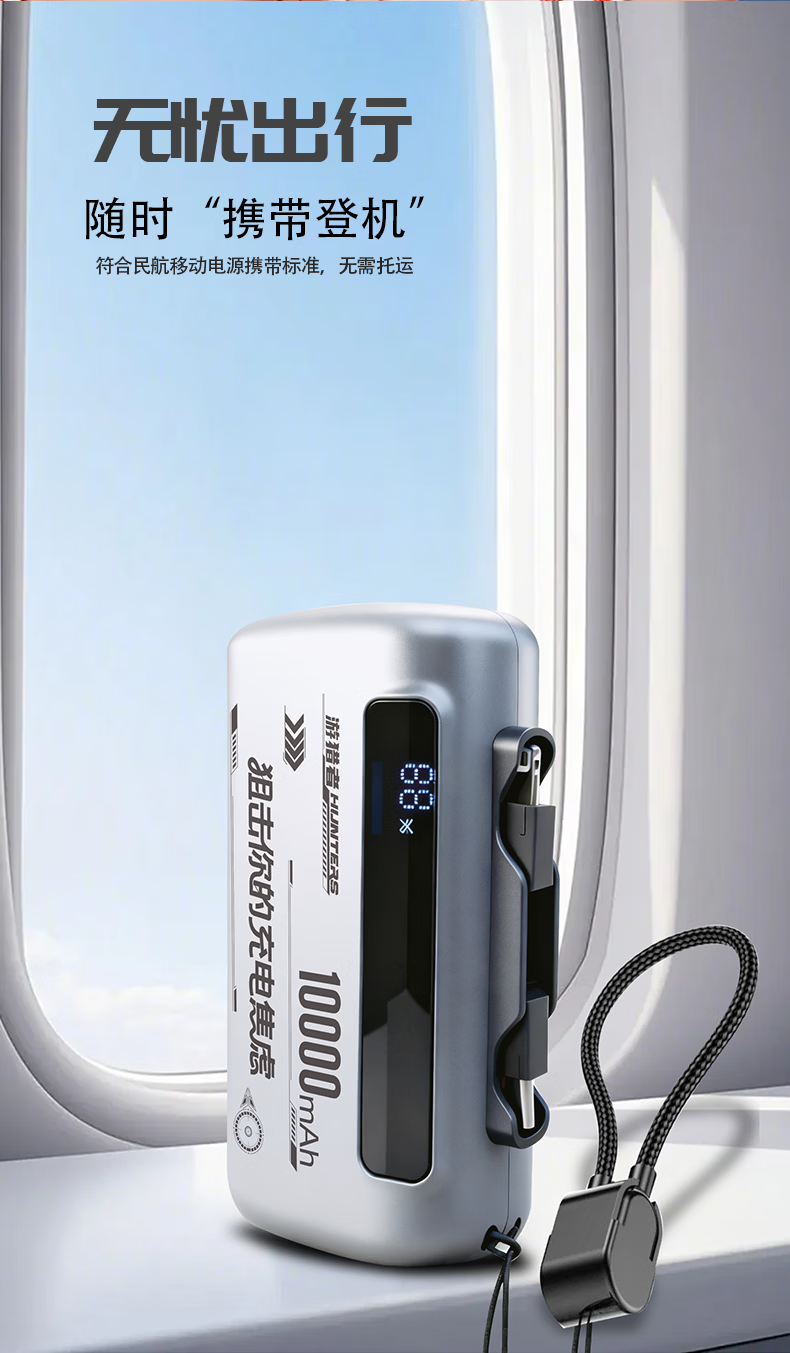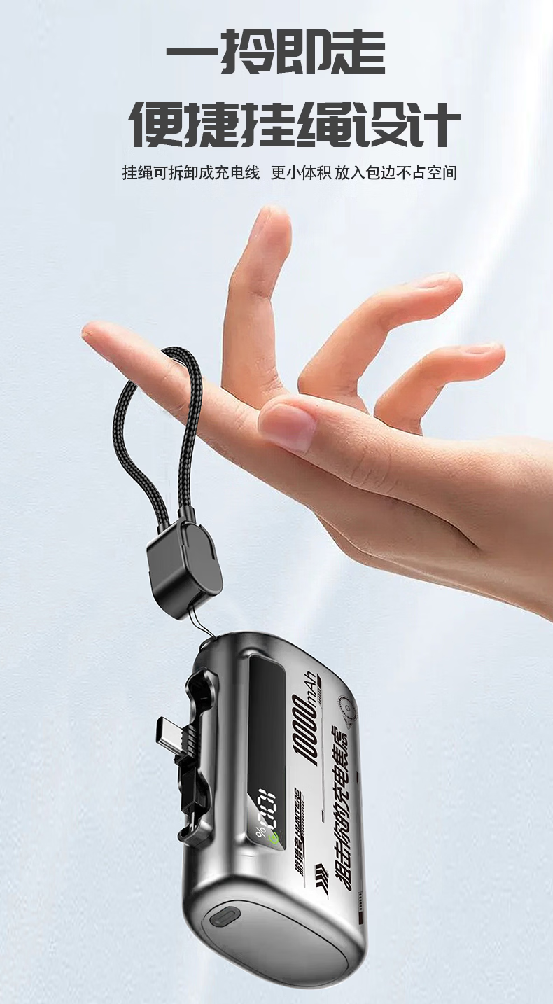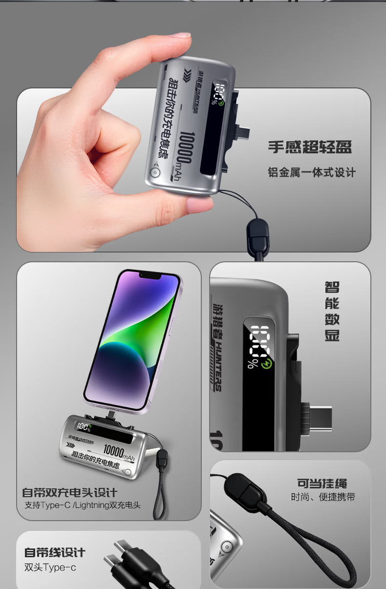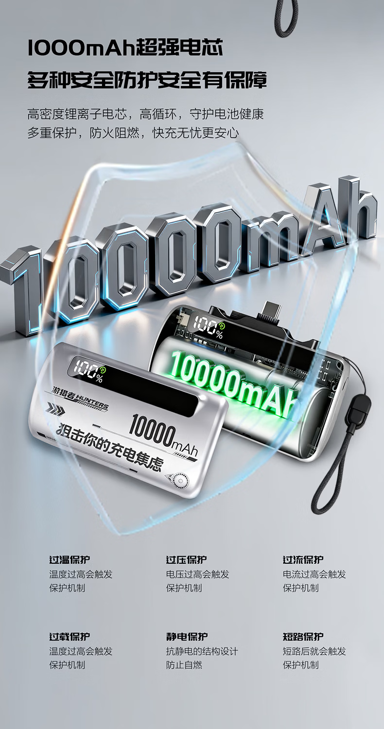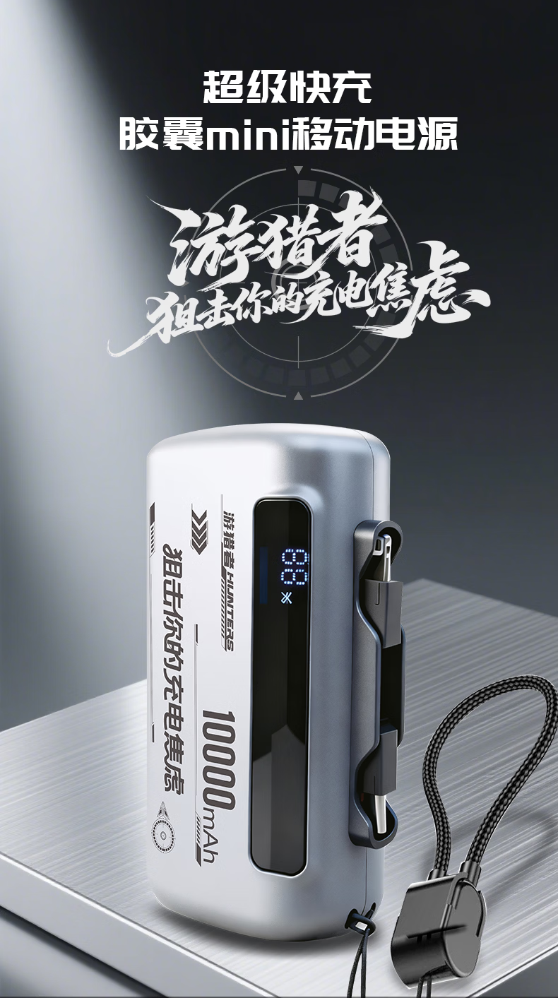 游猎者全协议超级快充自带线1万毫安胶囊充电宝小巧便携移动电源 10000mAh