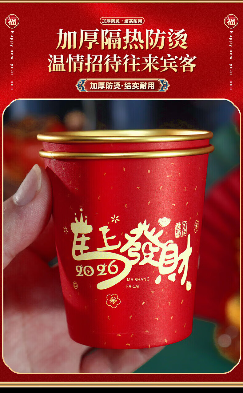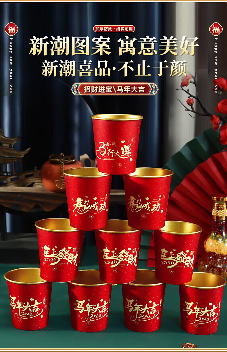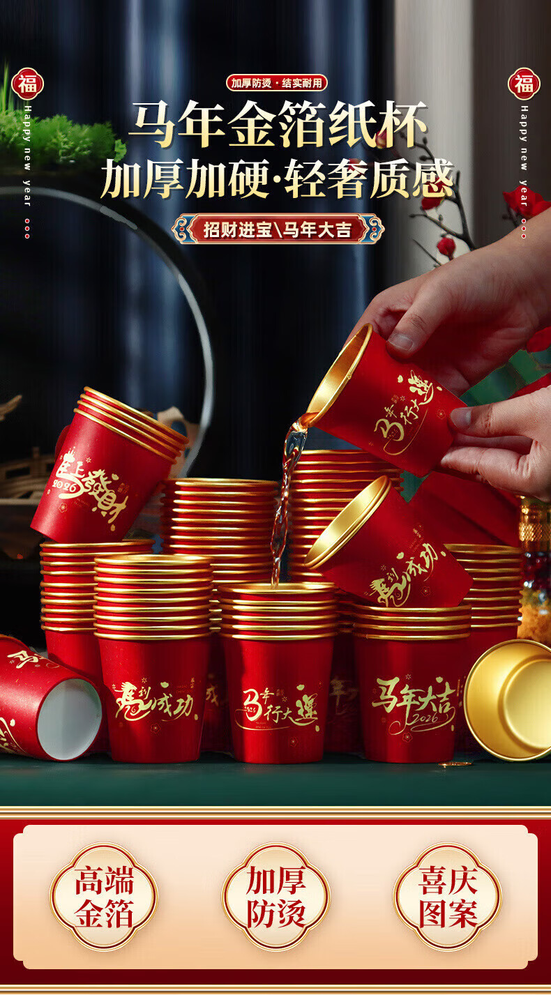 收米(ShouMi)2026马年春节金箔国潮纸杯一次性杯家用新年贺岁结婚加厚杯子防烫 马年金箔纸杯【200个装】款式随