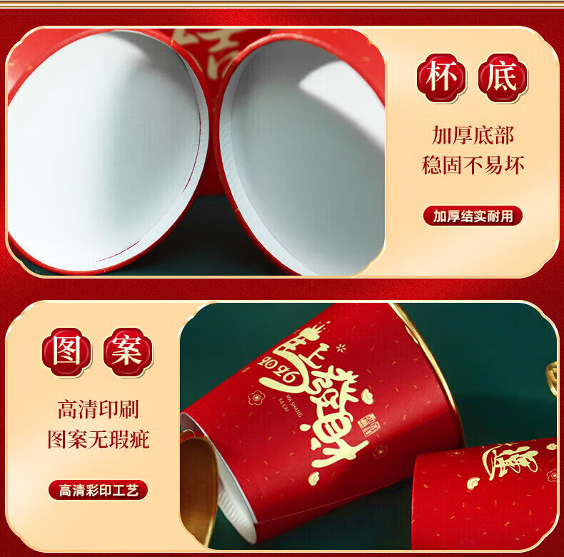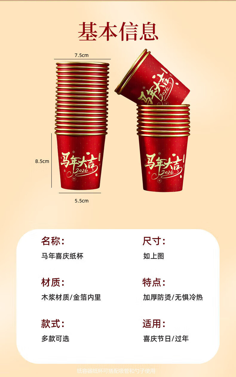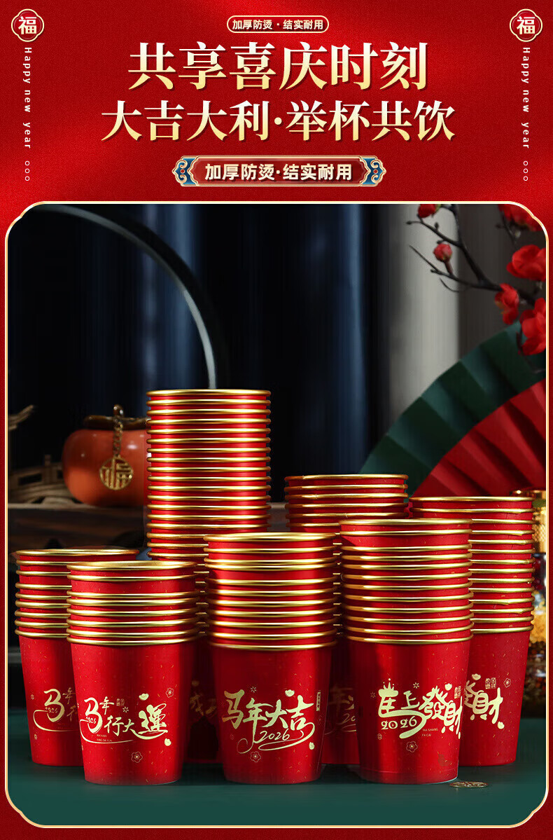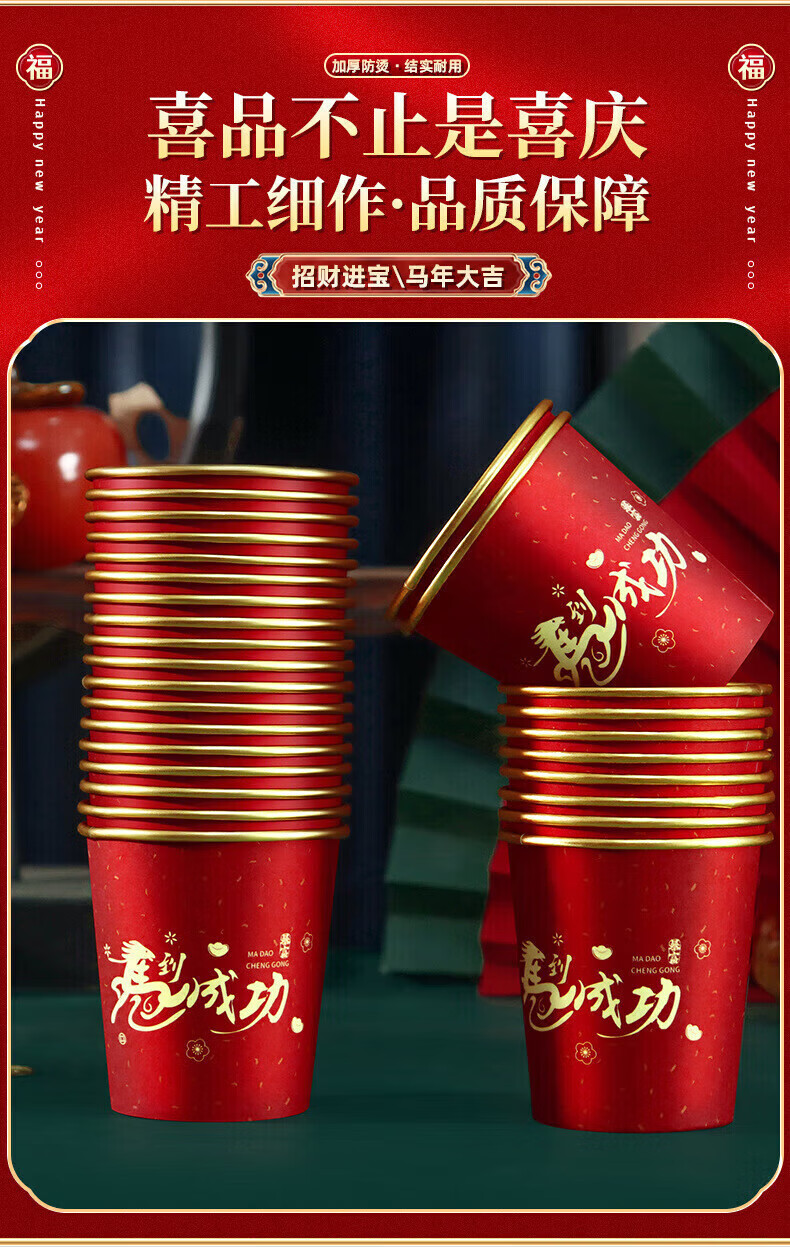 收米(ShouMi)2026马年春节金箔国潮纸杯一次性杯家用新年贺岁结婚加厚杯子防烫 马年金箔纸杯【200个装】款式随