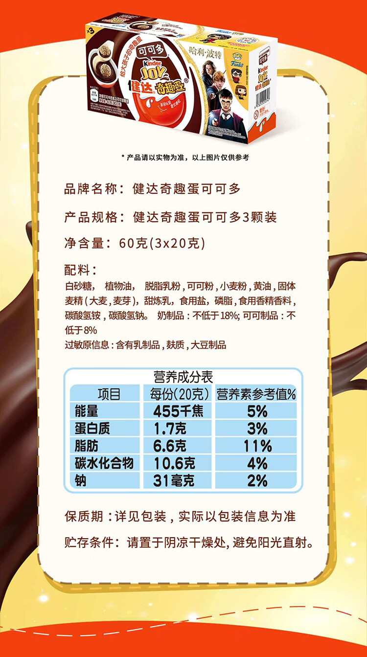 健达奇趣蛋 哈利波特款 3颗装 60g 牛奶巧克力含玩具 糖果 年货礼盒