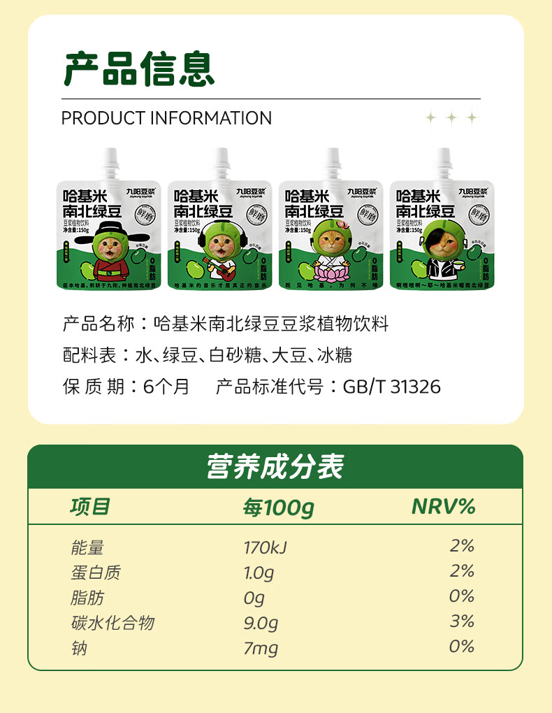 九阳豆浆哈基米南北绿豆浆150g*10袋 京仓现货