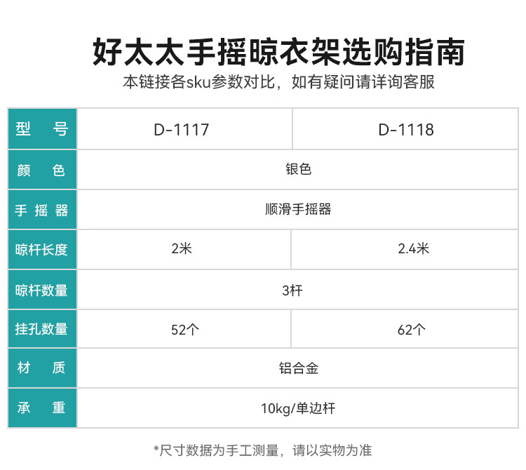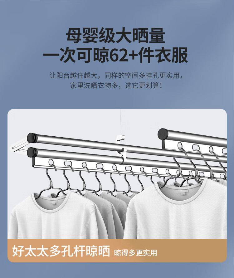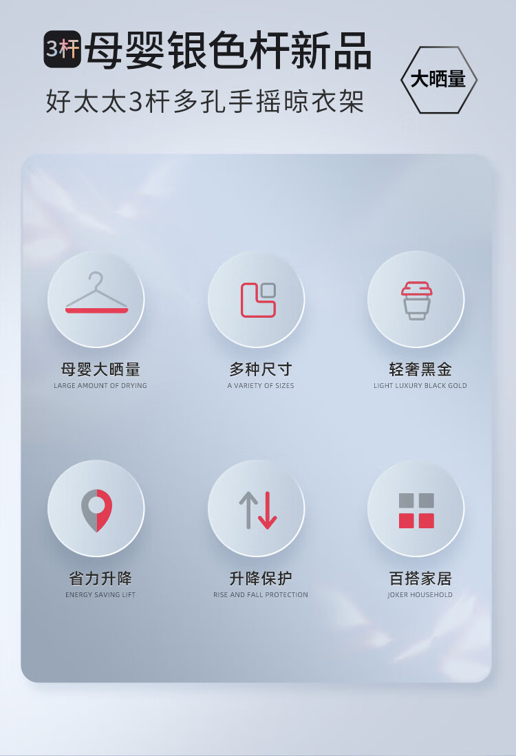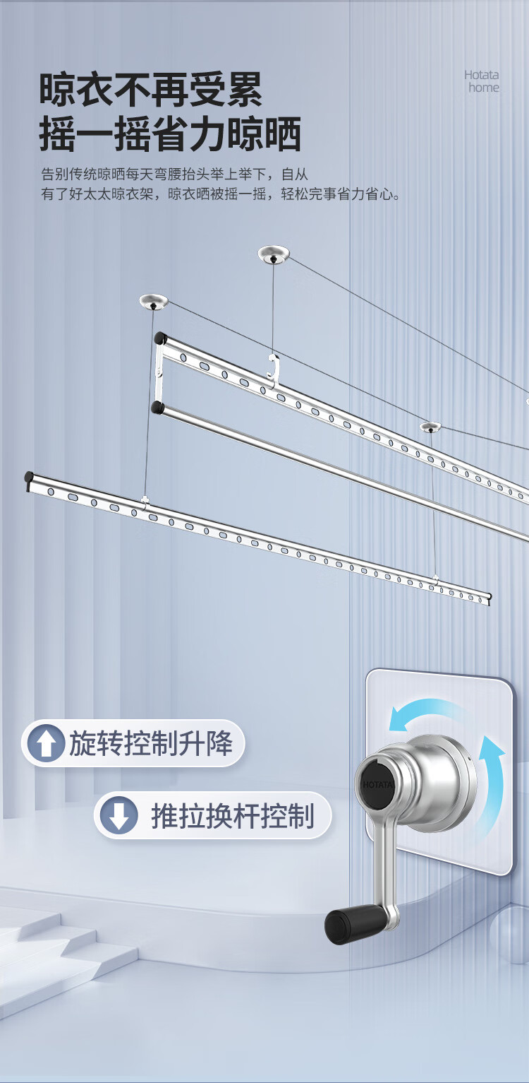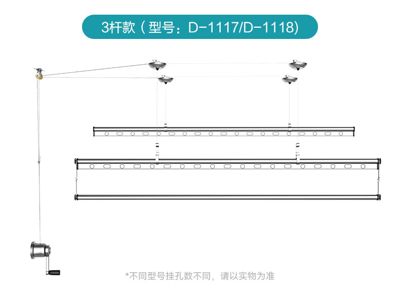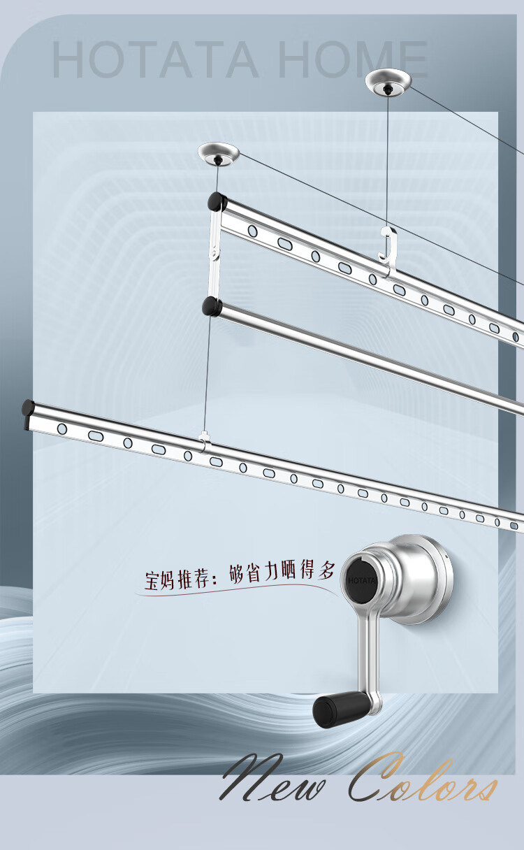 好太太(Hotata)三杆手摇晾衣架阳台室内升降晒衣架铝合金晾衣杆D-1118 2.4米银黑