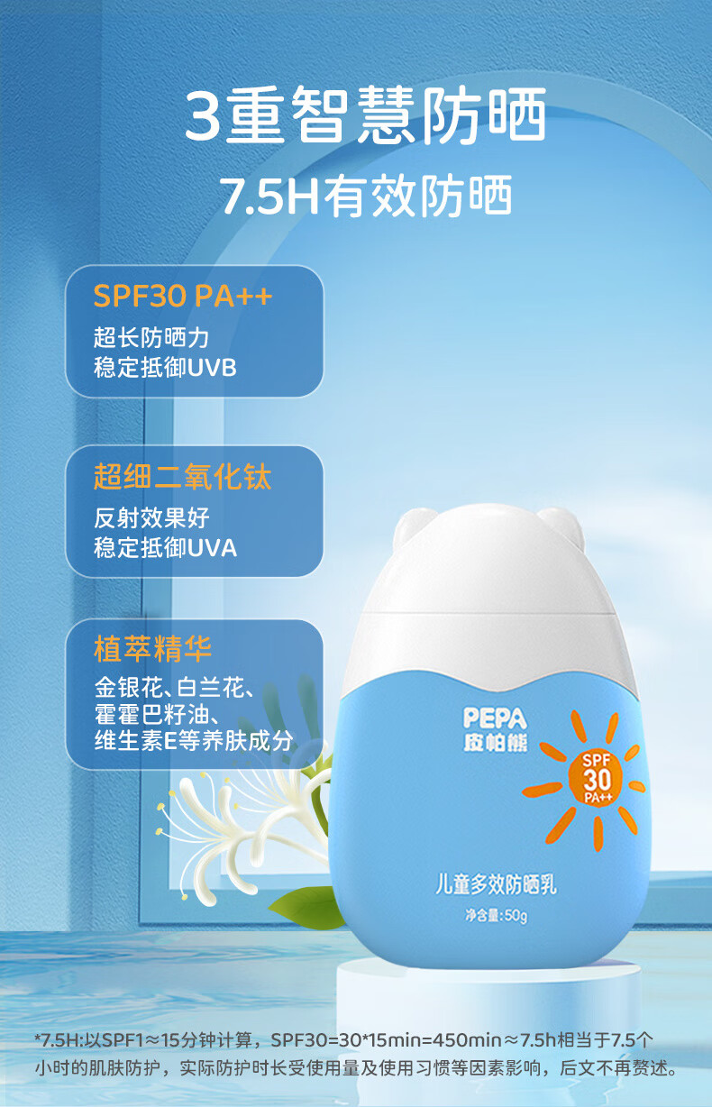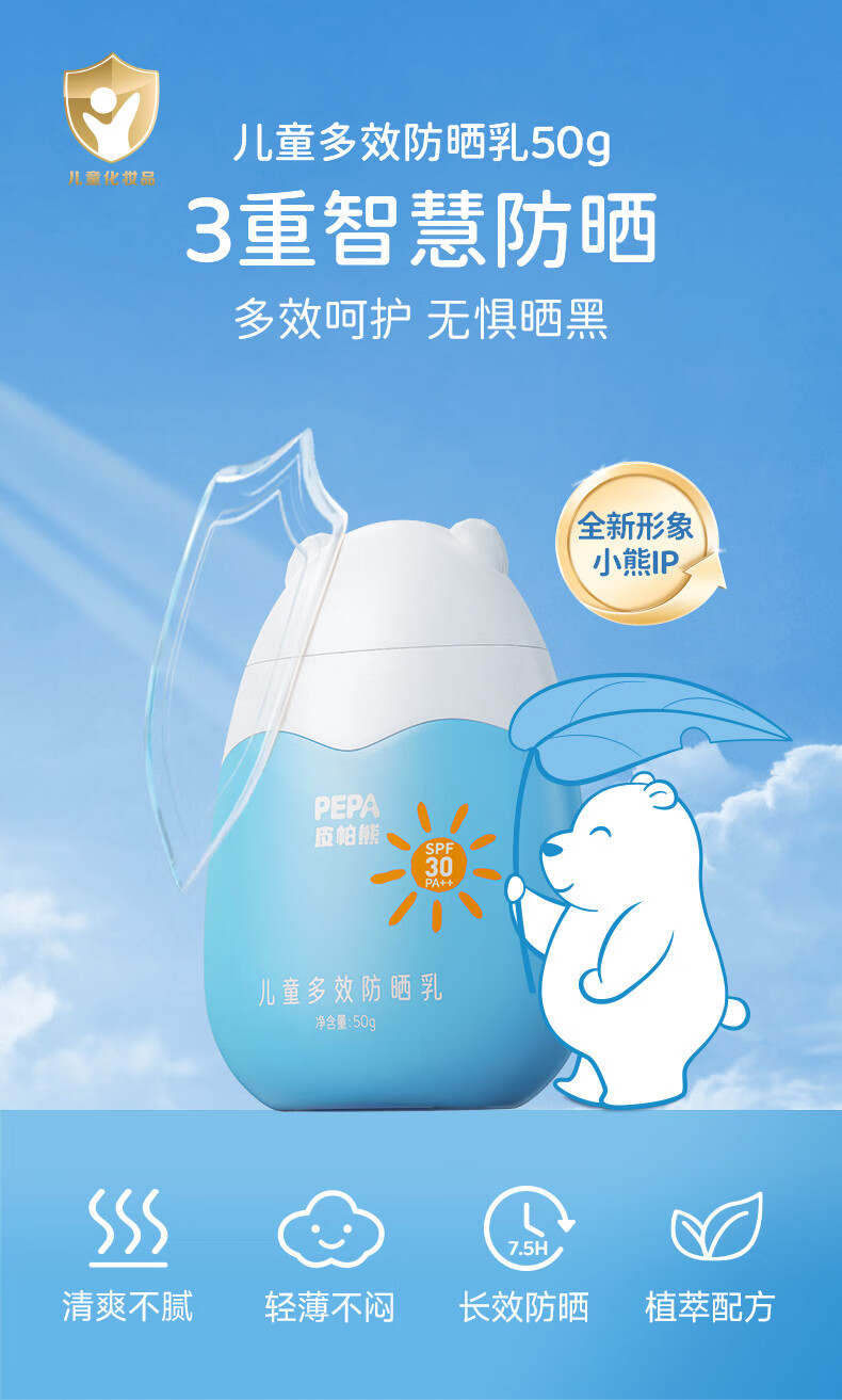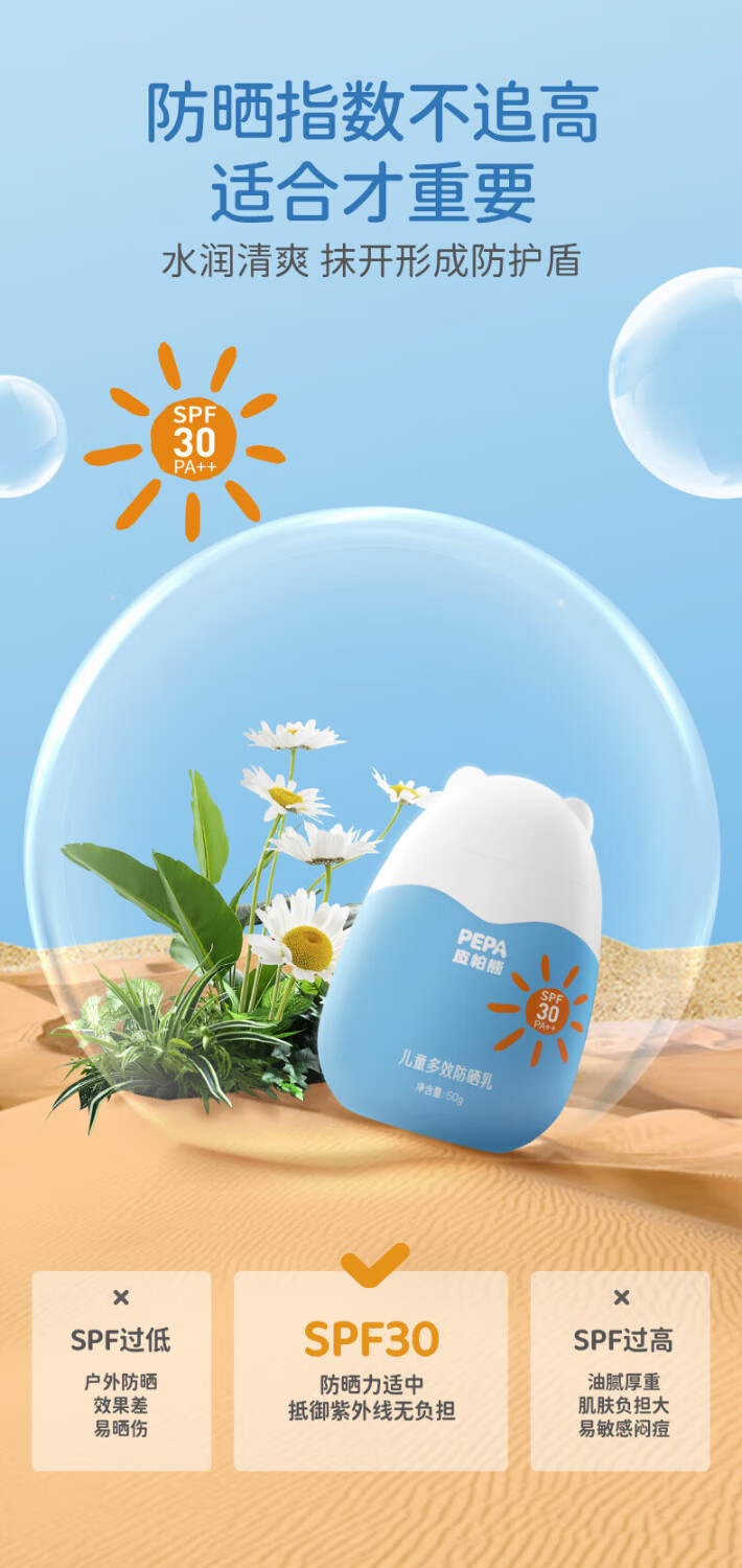 PEPA儿童多效防晒霜SPF30宝宝学生防晒乳户外3重防护隔隔离紫外线50g 儿童防晒