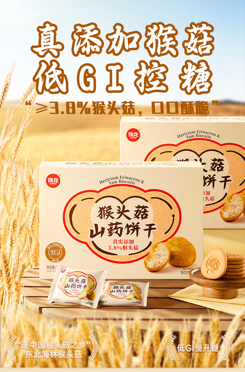 伟龙猴头菇山药饼干低IG食品早餐健康过年礼盒送长辈礼 【大方送礼】384g*2盒(加礼袋)