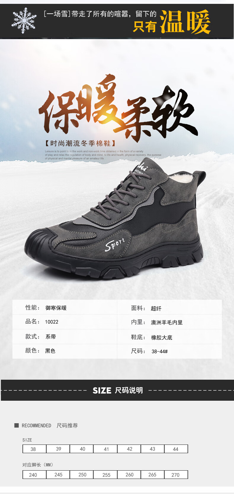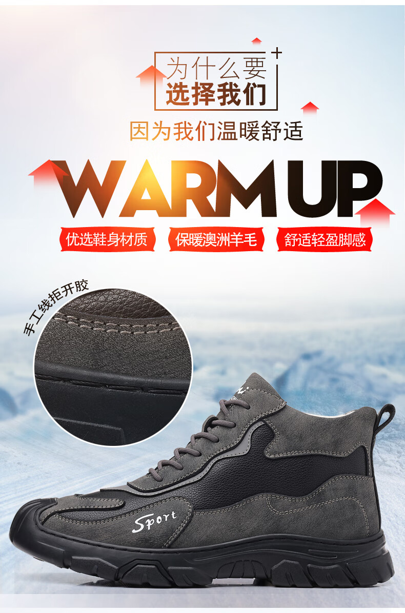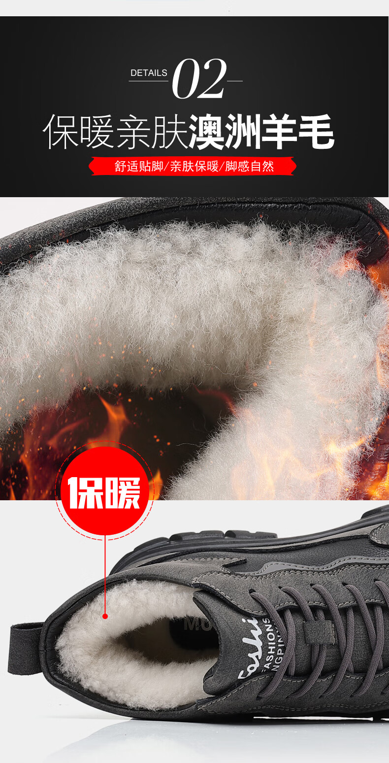 稻草人(MEXICAN)棉鞋男士冬季加绒保暖加厚羊毛爸爸雪地靴真皮防滑厚底高帮男鞋子 10022灰色羊毛款 38