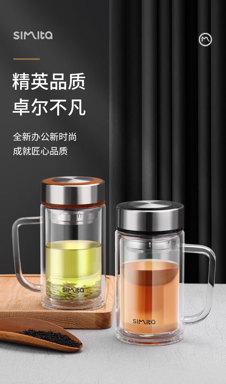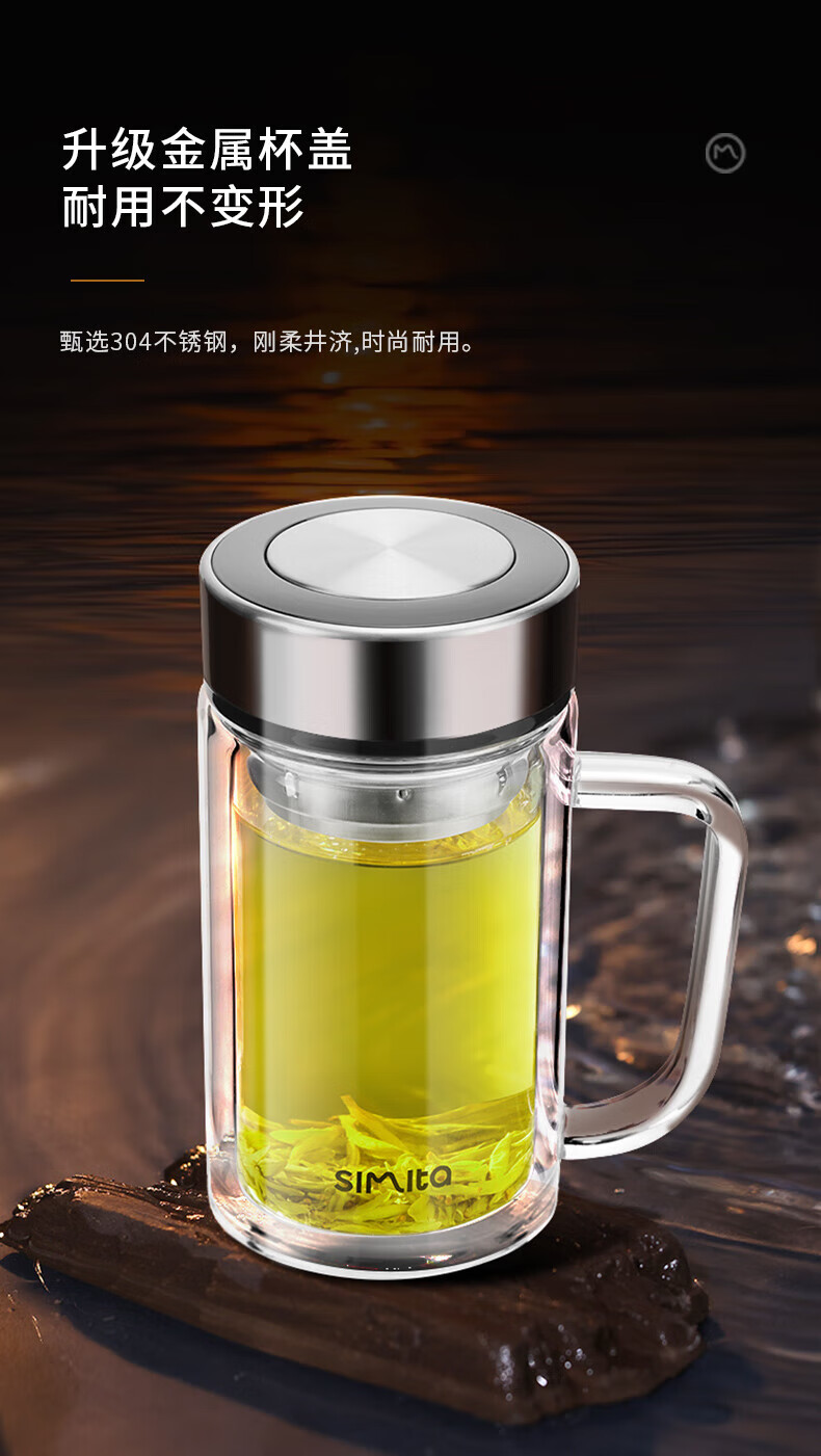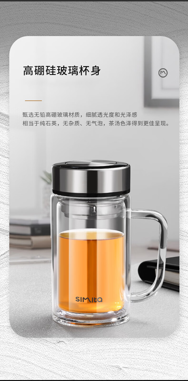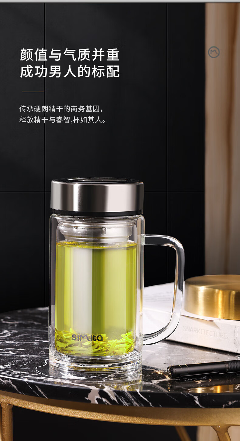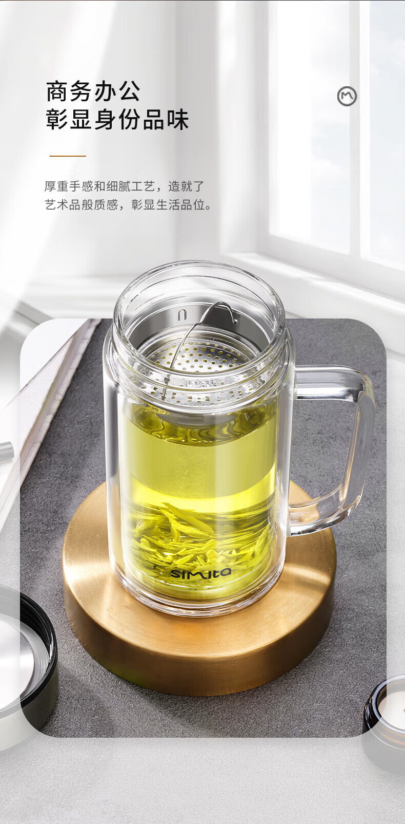 施密特(simita)玻璃杯男士 带茶隔把手 大容量双层高硼硅玻璃办公泡茶喝水杯子 咖啡色【双层高硼硅玻璃】 600ml