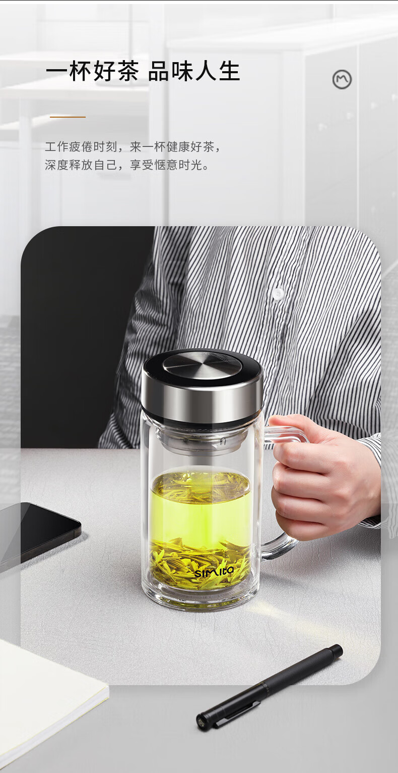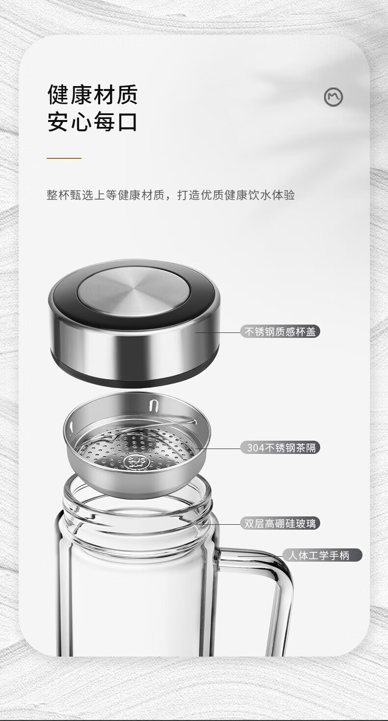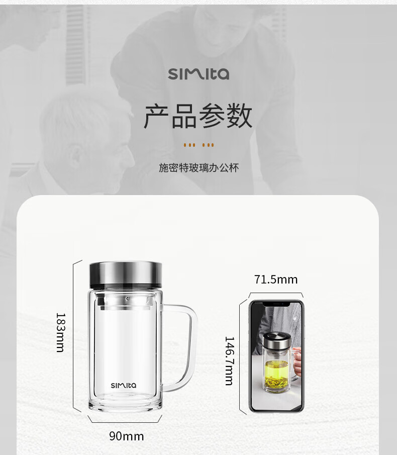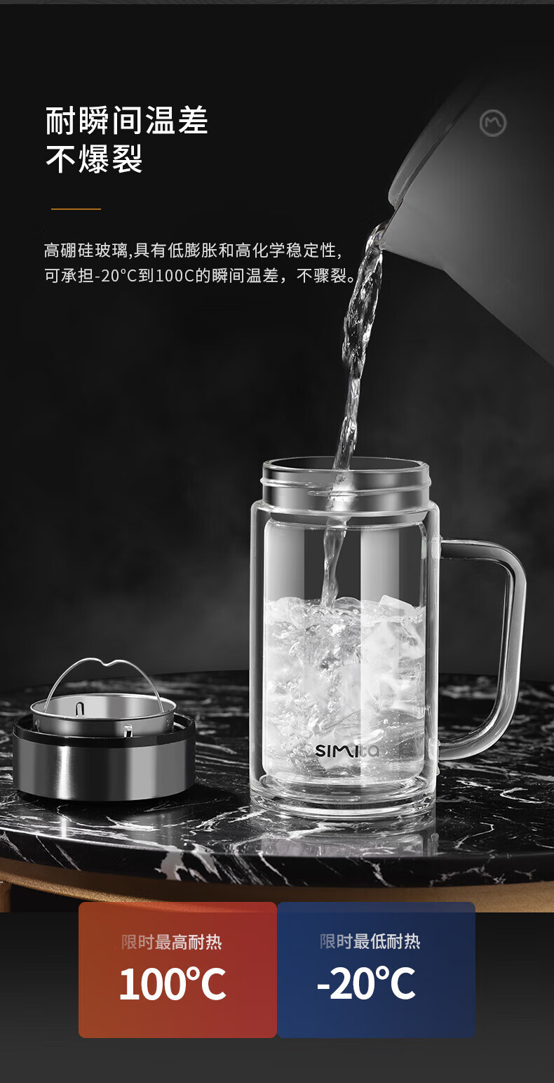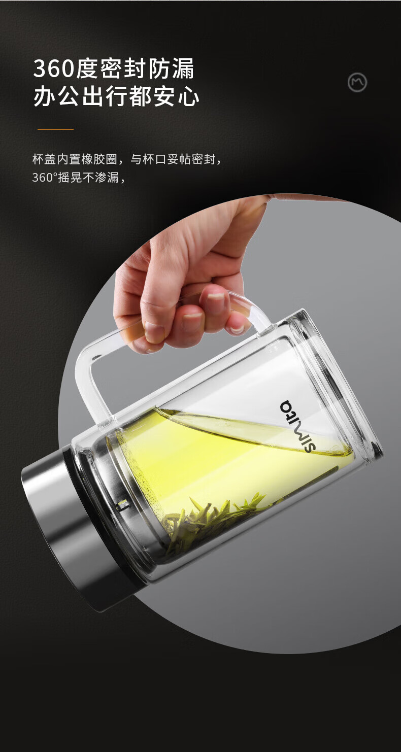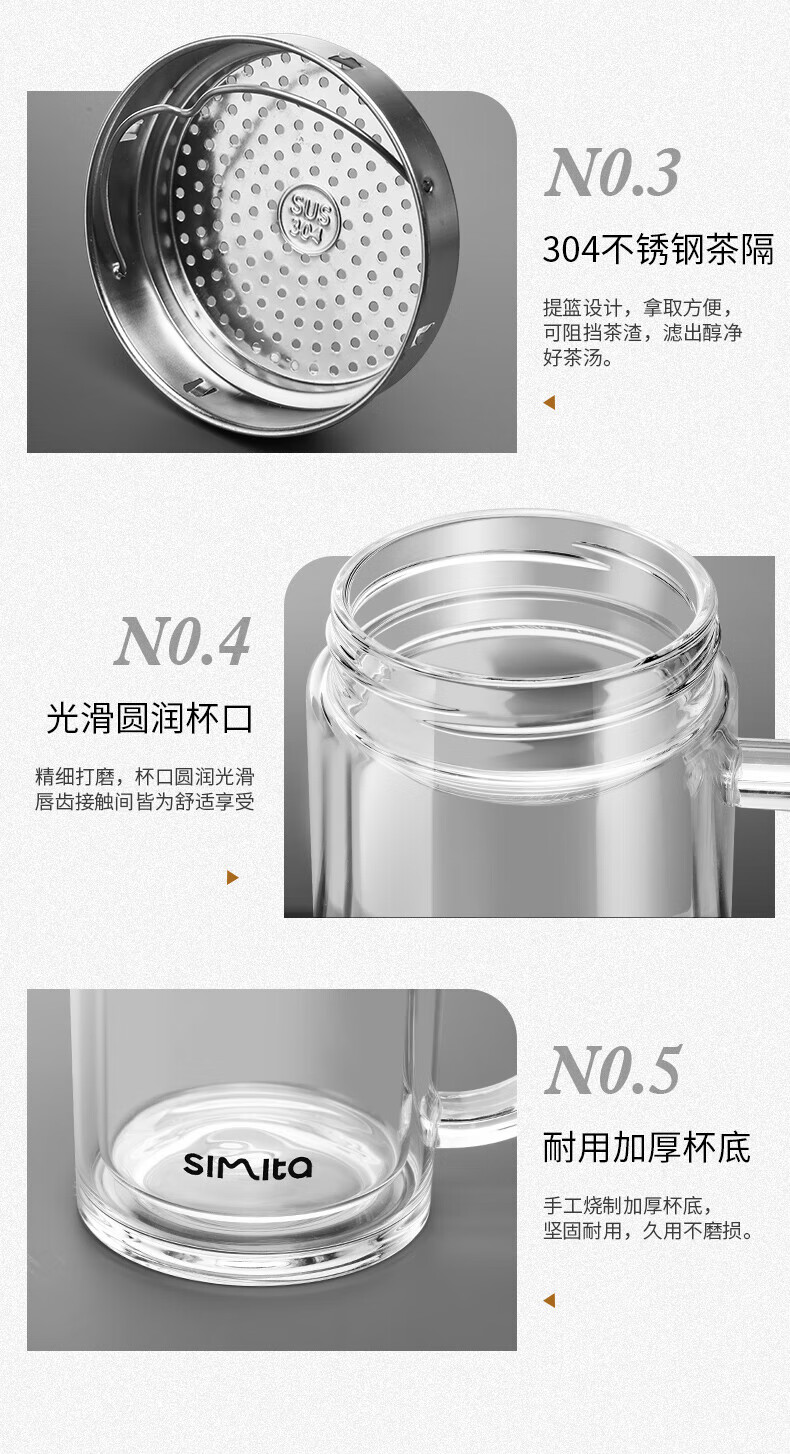 施密特(simita)玻璃杯男士 带茶隔把手 大容量双层高硼硅玻璃办公泡茶喝水杯子 咖啡色【双层高硼硅玻璃】 600ml