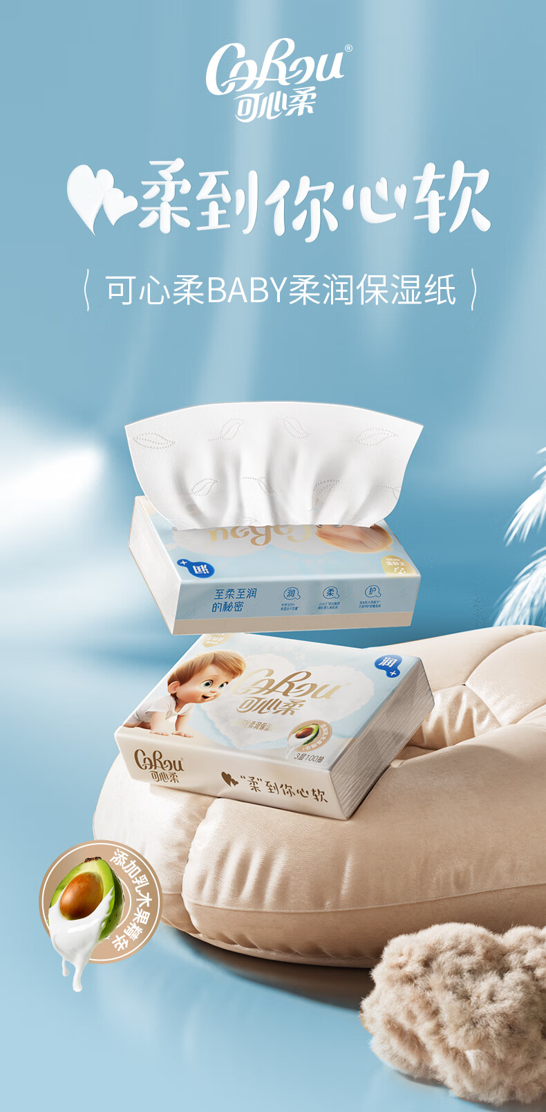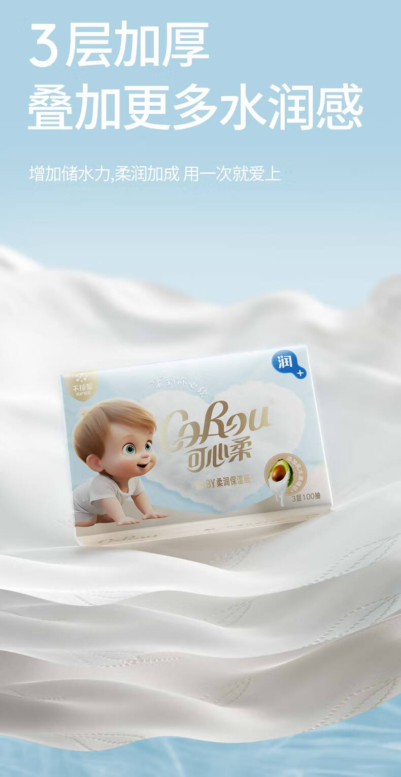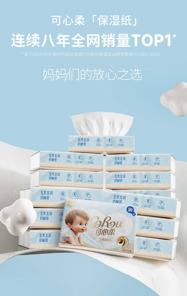可心柔(COROU)V9婴儿乳霜纸M码3层100抽乳木果云柔巾保湿纸巾大包抽纸 【乳木果云柔巾】 3层 100抽*24包 M码