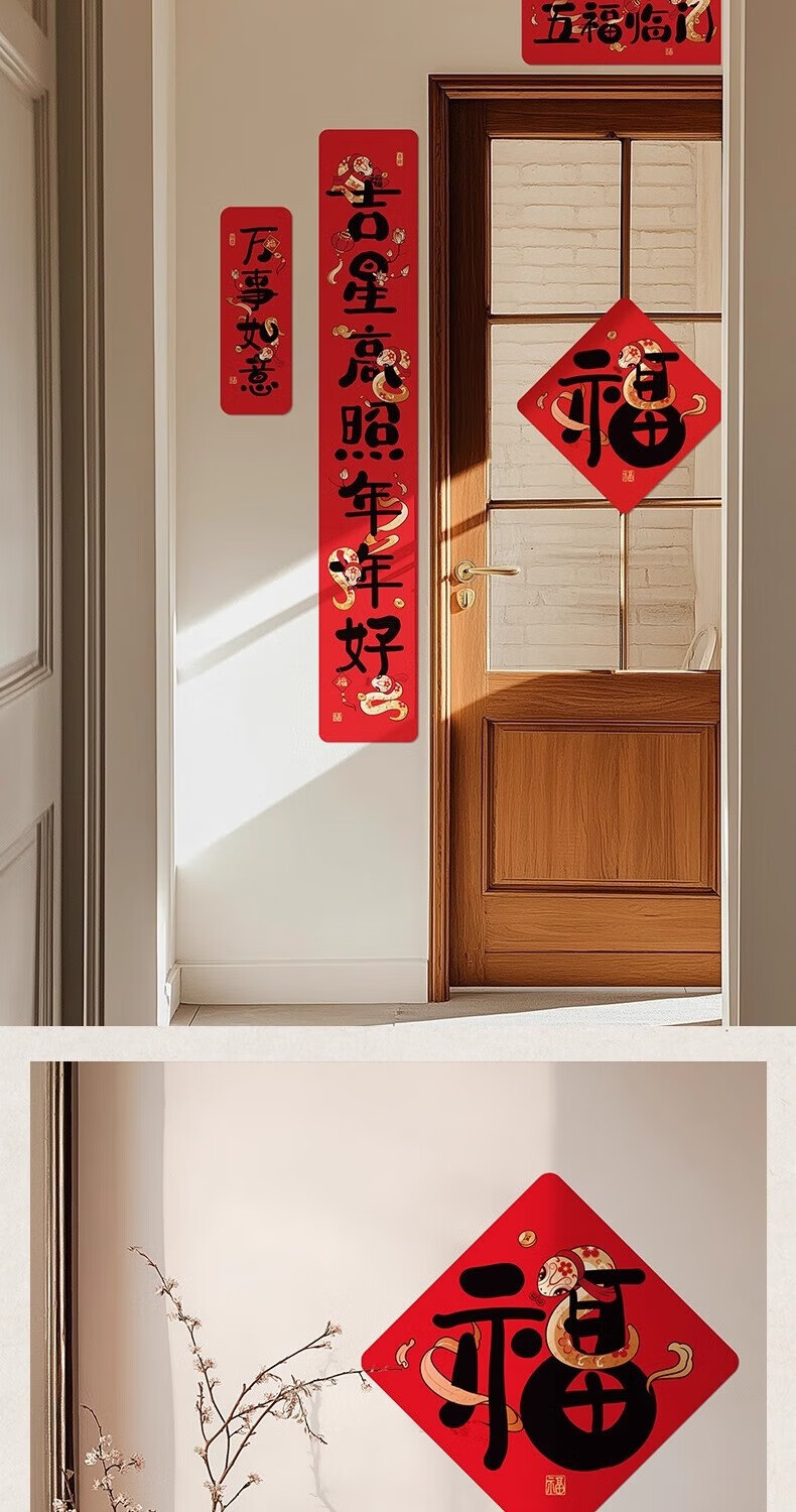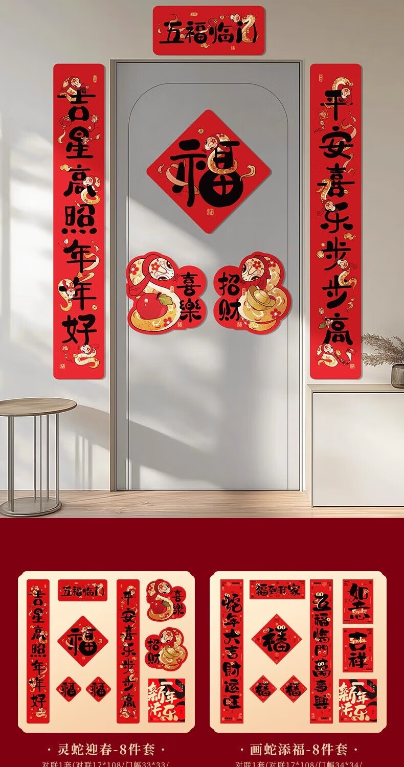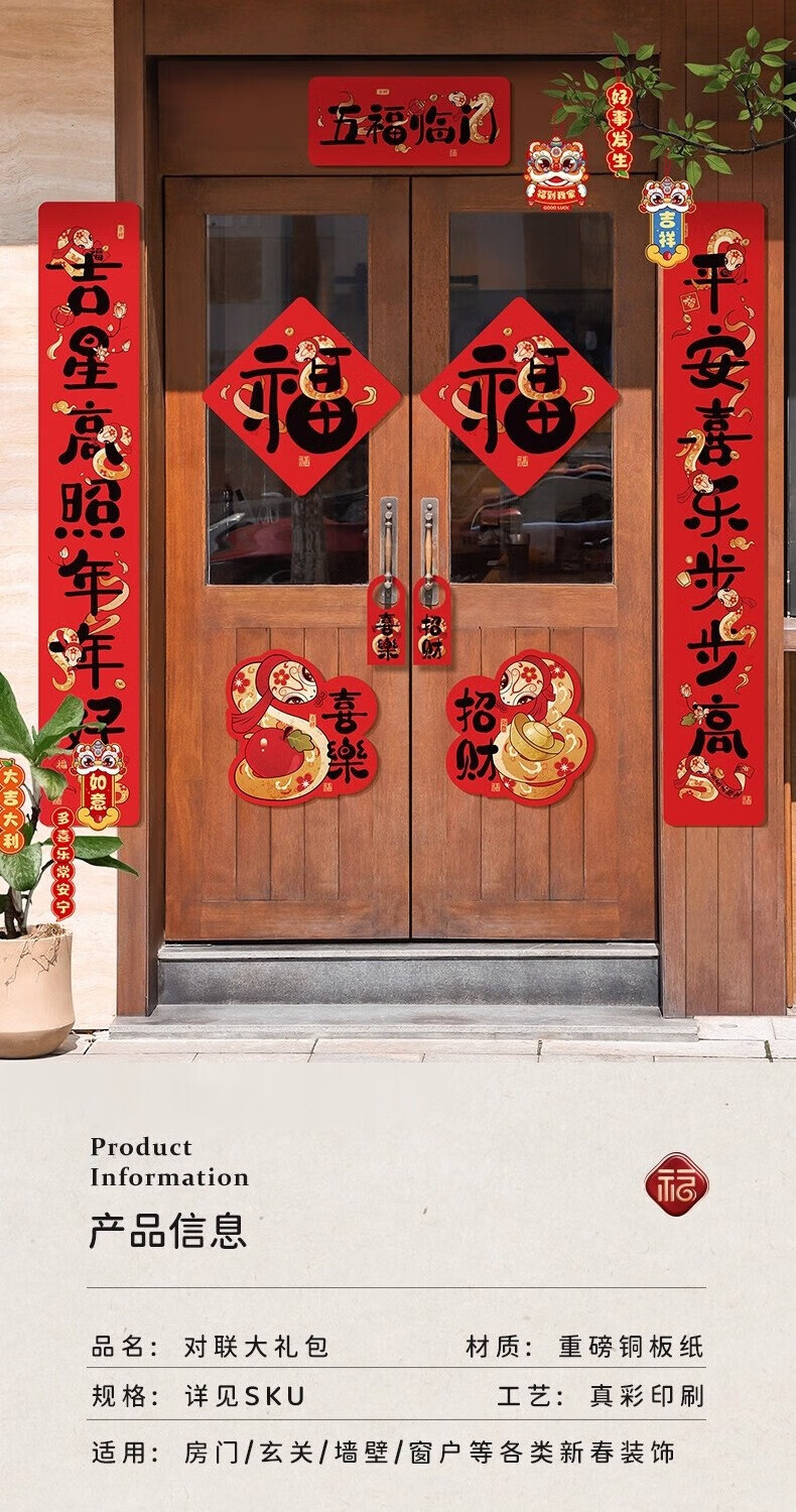 新年对联大礼包2026春联春节马年新款过年装饰福字贴礼盒装大门贴 简约14件套-五福临门