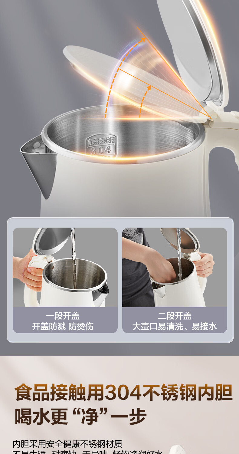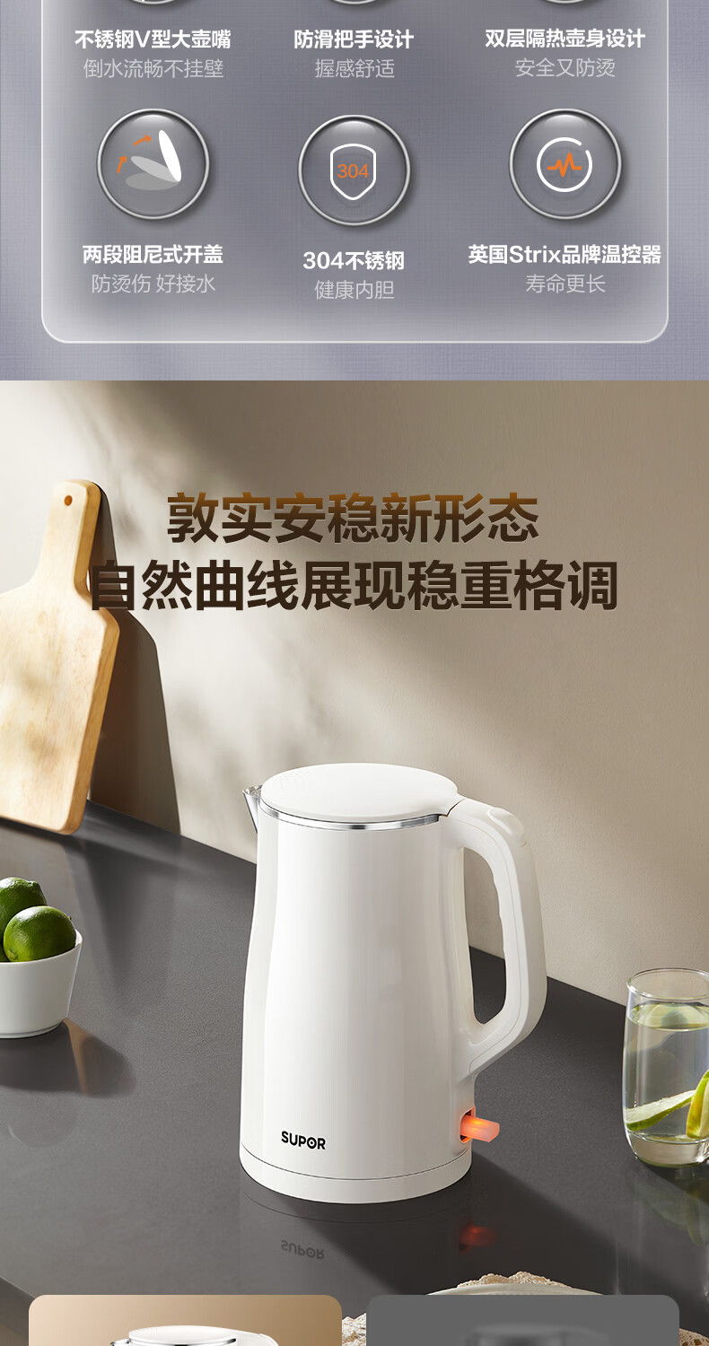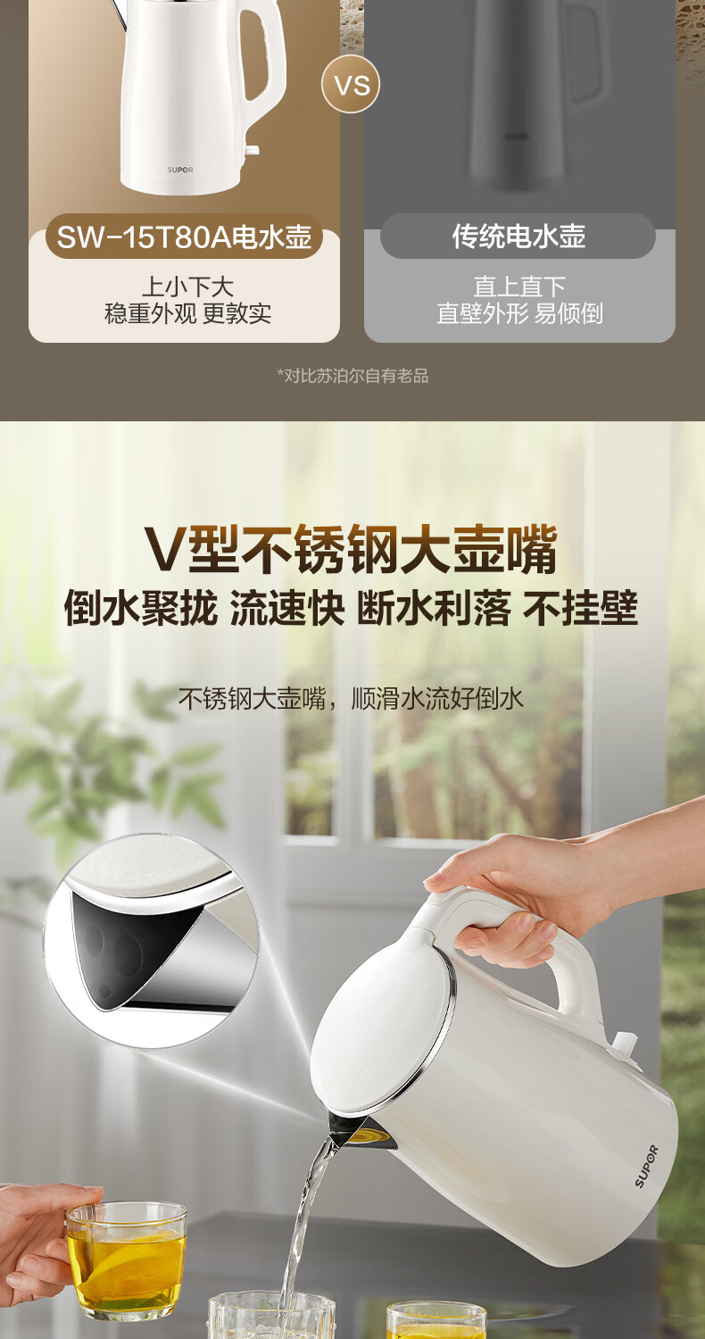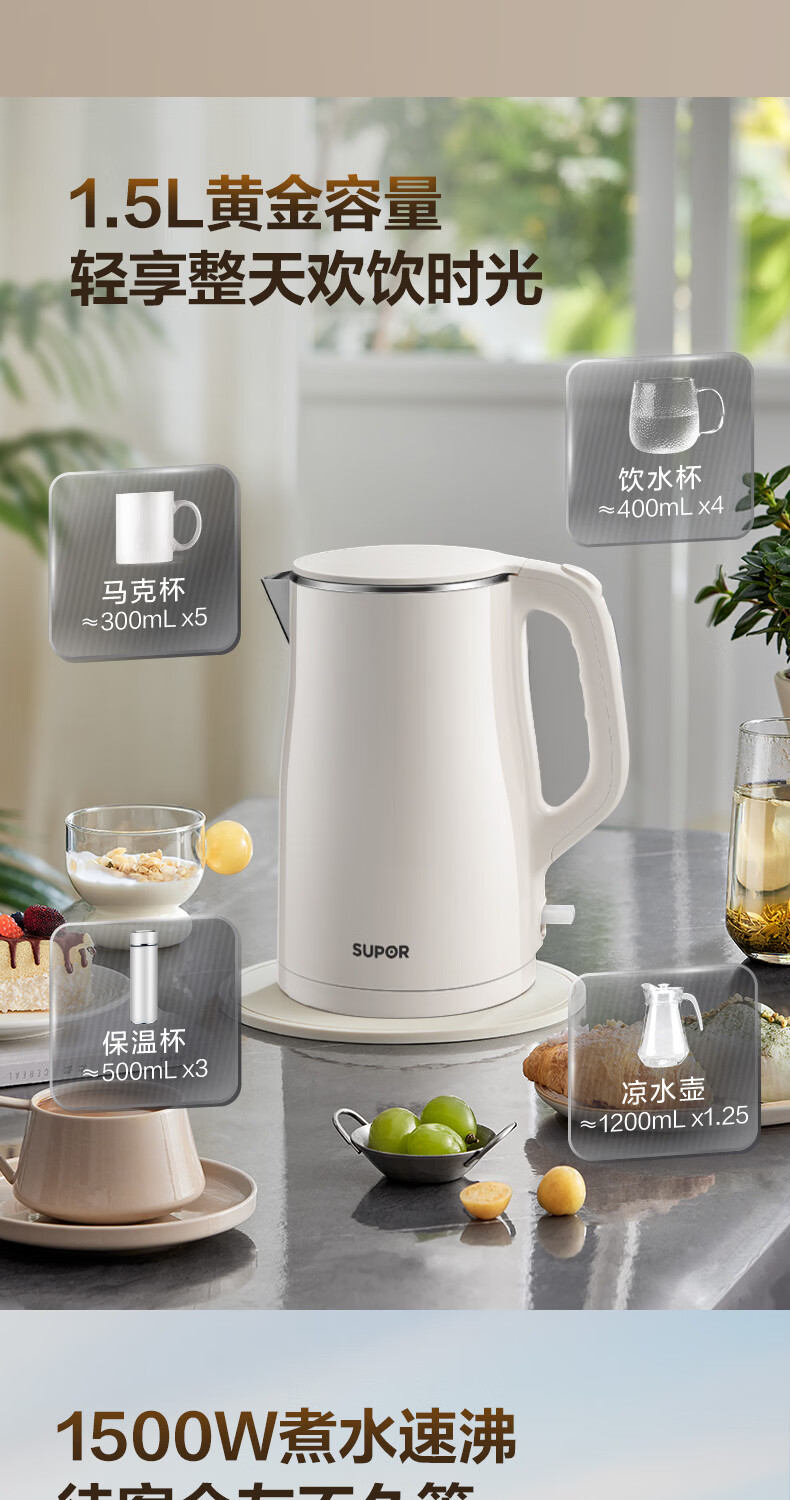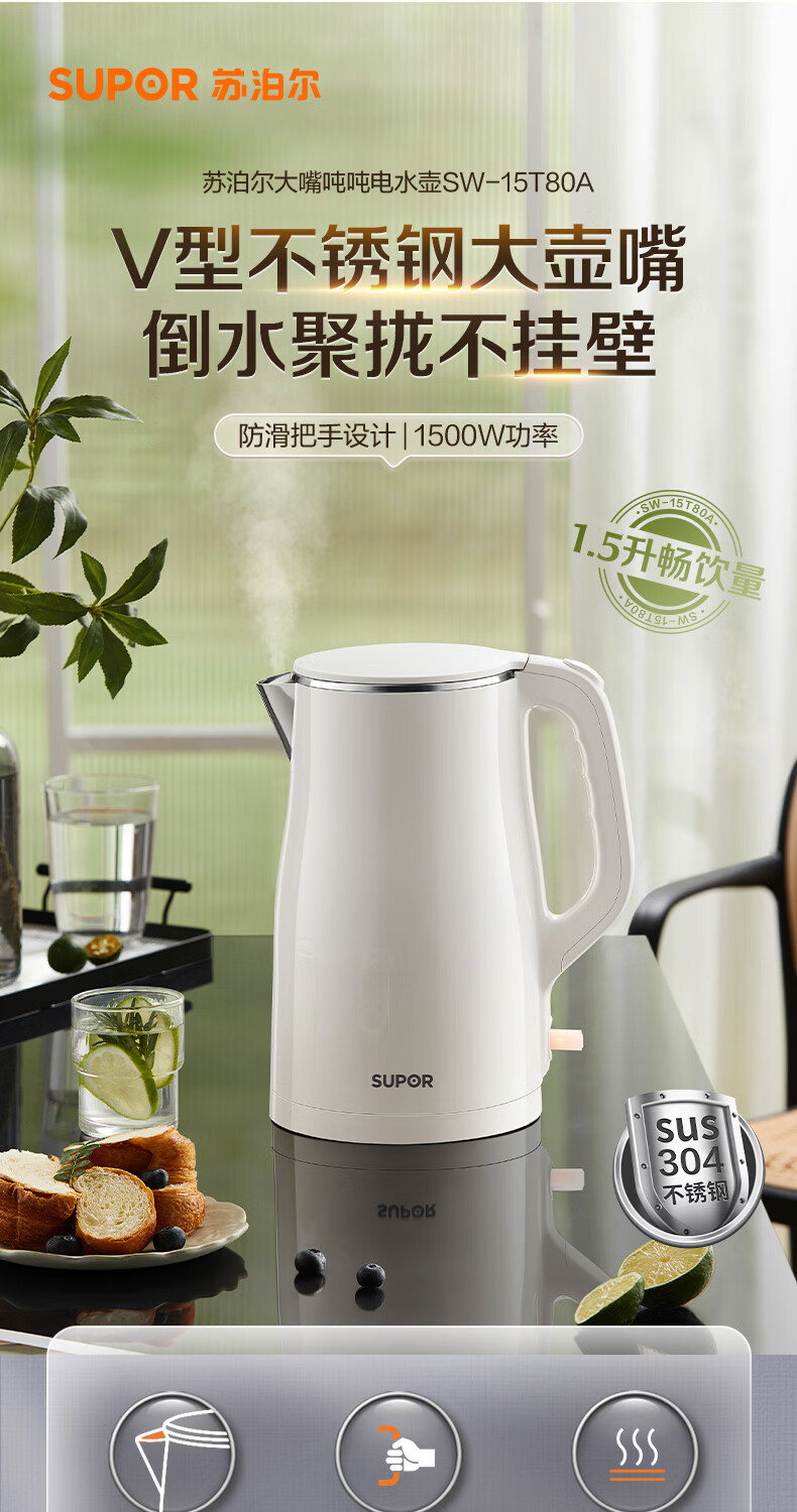 苏泊尔(SUPOR)电水壶烧水壶 1.5L小容量热水壶 304不锈钢健康内胆 双层防烫 电热水壶 SW-15T80A