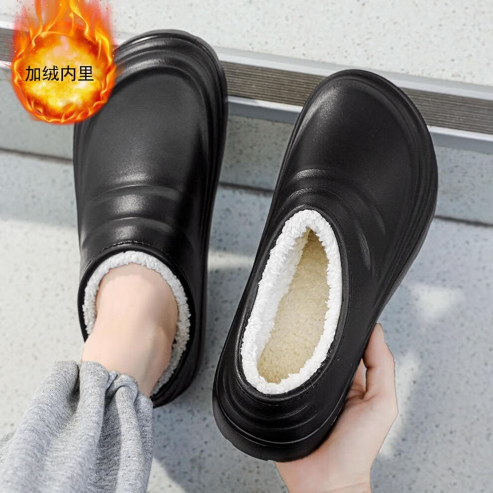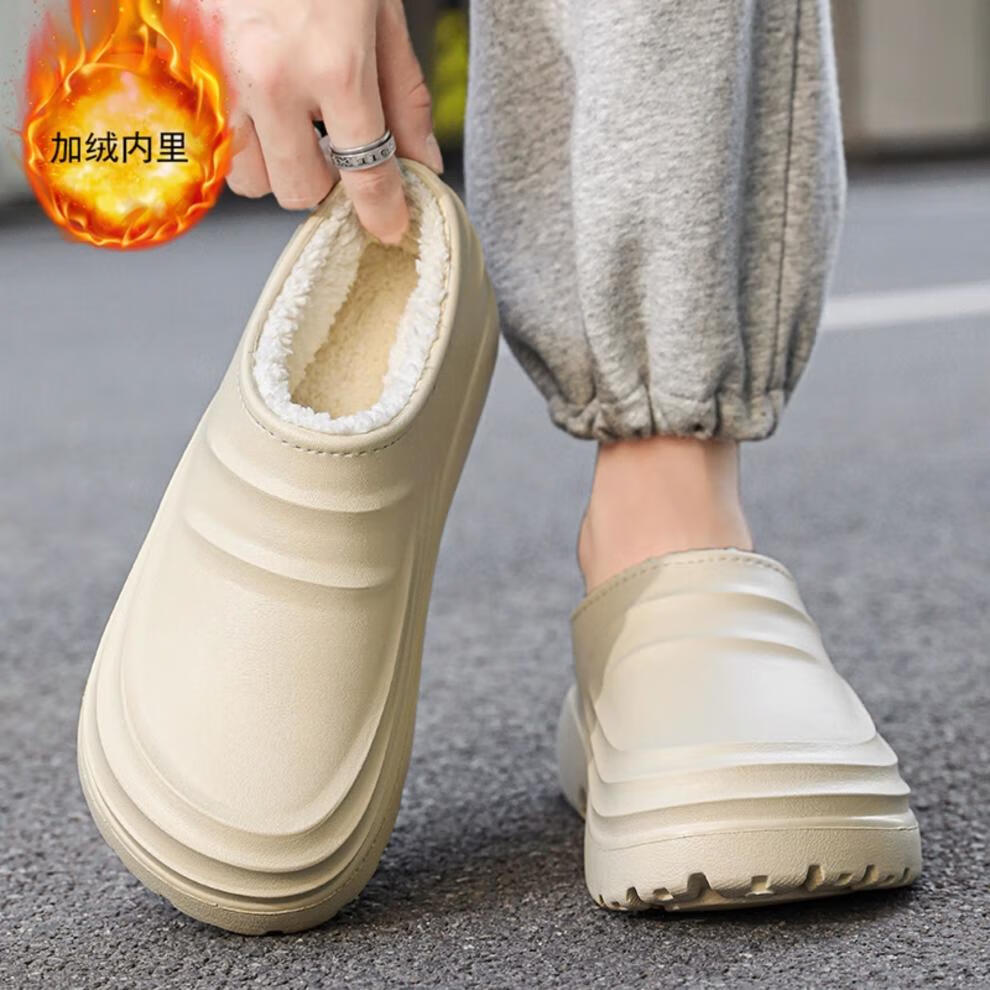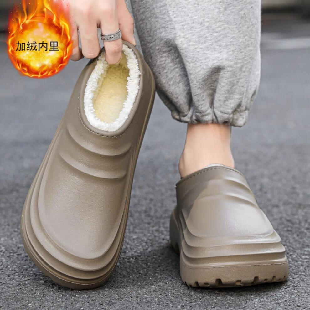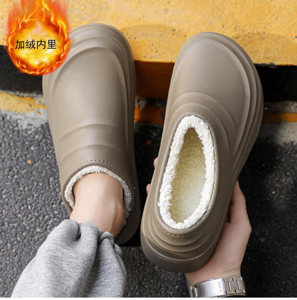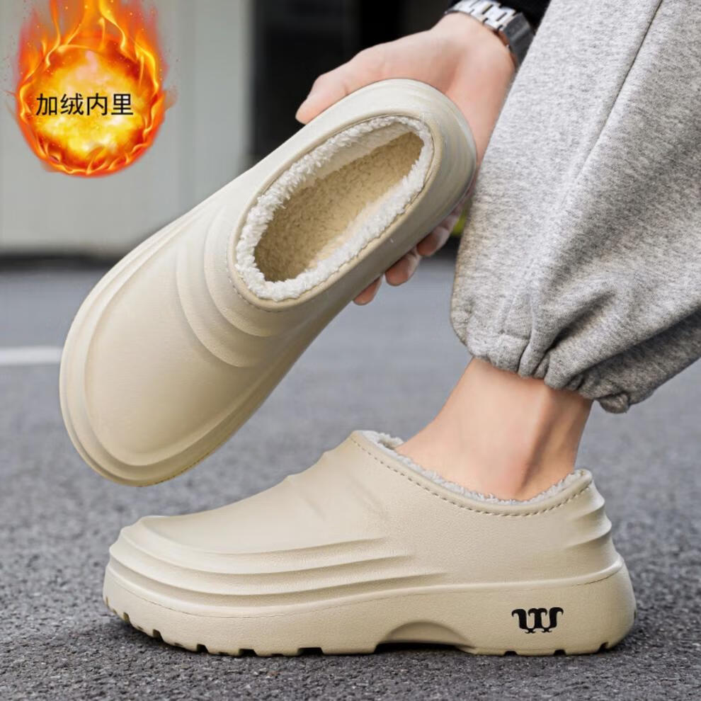 稻草人(MEXICAN)冬季加绒防水棉鞋男厨房专用防滑棉鞋 保暖软底中跟厚底棉鞋 米白 (正常鞋码) 44