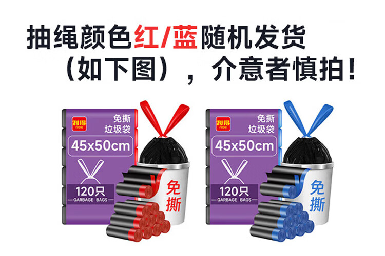 利得抽绳垃圾袋黑色45*50cm120只单面1.2丝免撕加厚款厨房用
