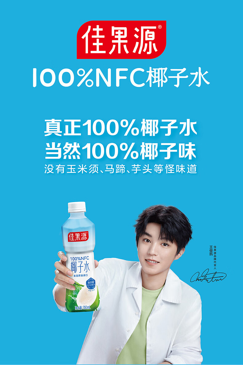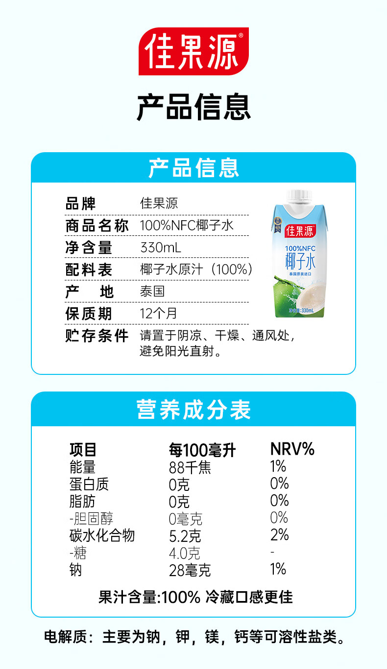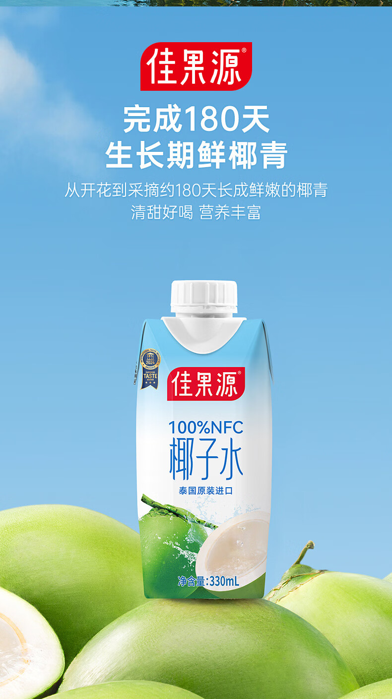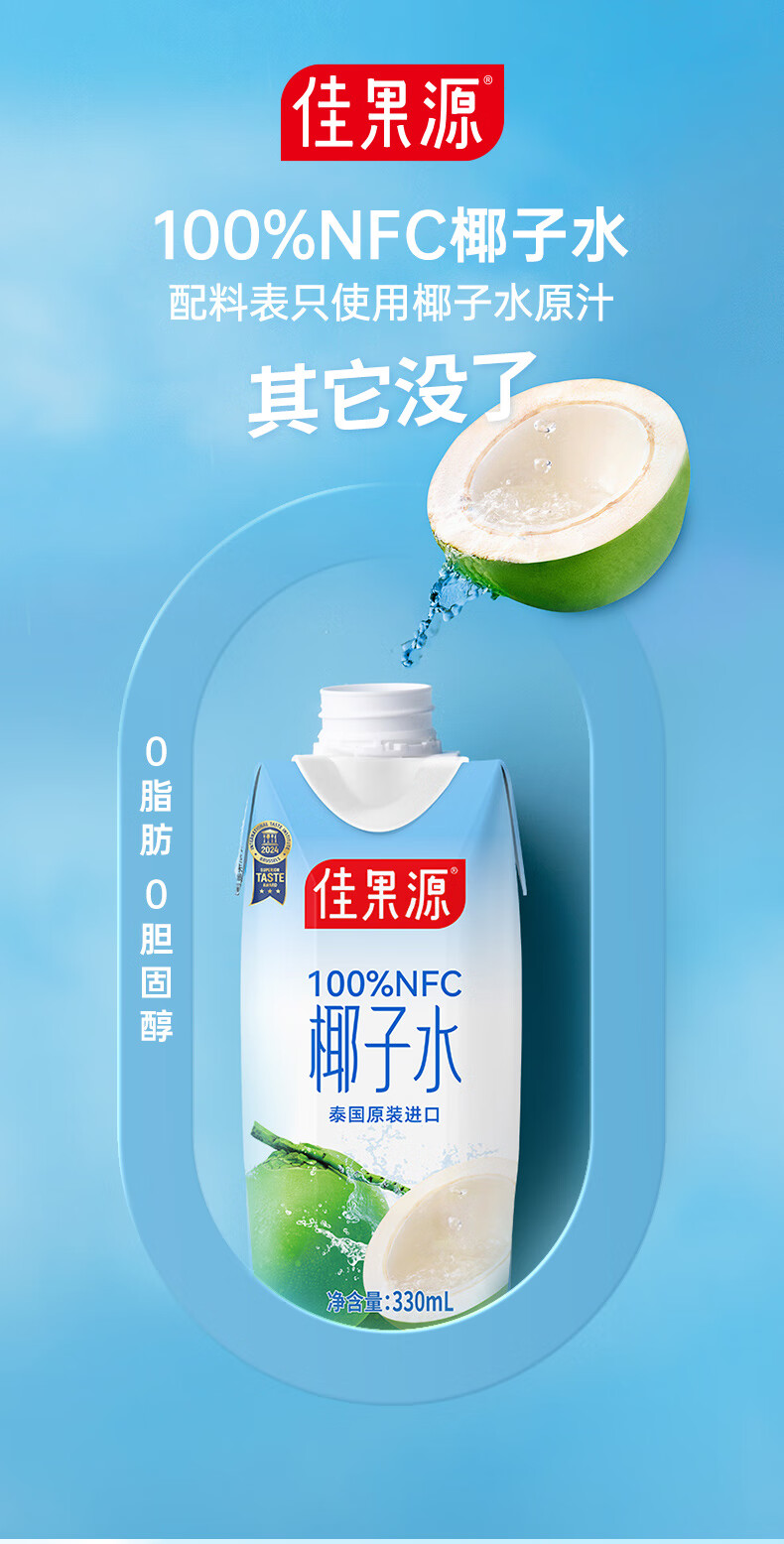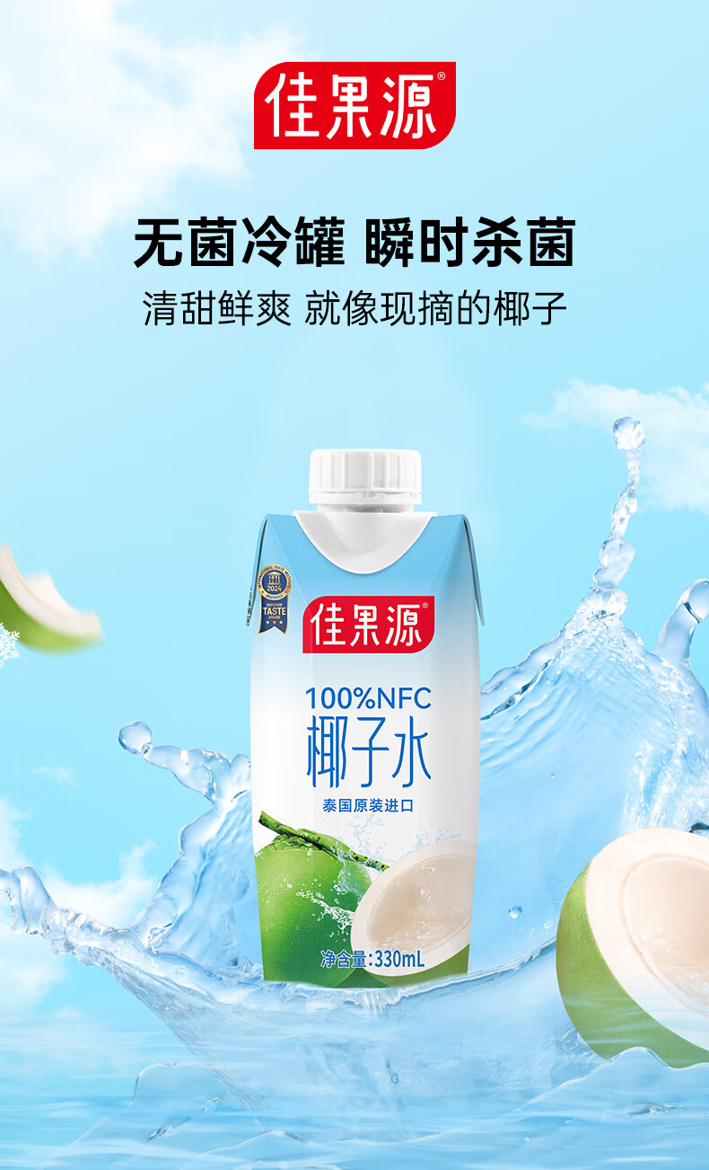 佳果源佳农旗下100%NFC椰子水330ml×12瓶 电解质饮料泰国进口 年货送礼