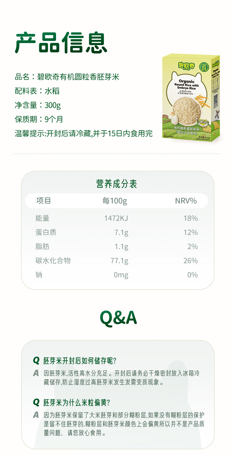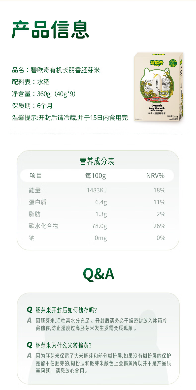碧欧奇【79元任选5件】辅食面条贝壳面胚芽米面粉米粉松饼粉米糕粉 有机长丽香胚芽米360g