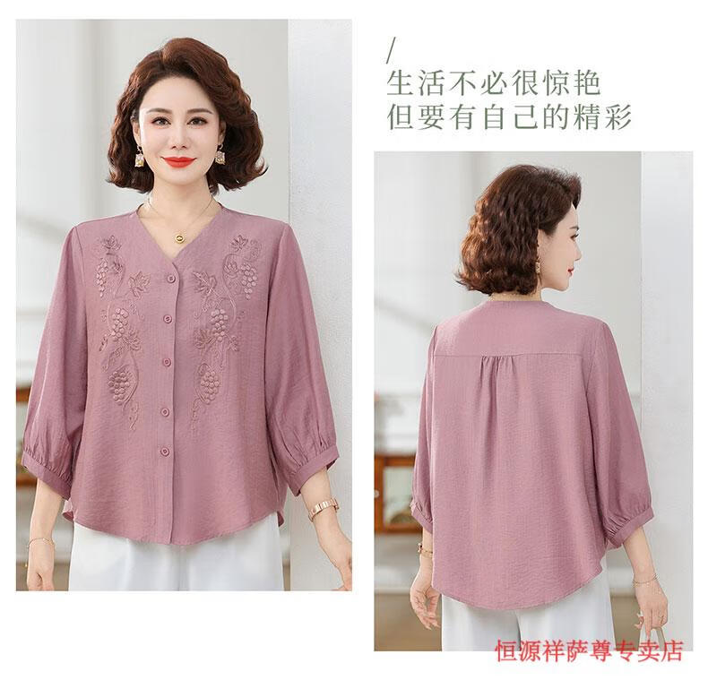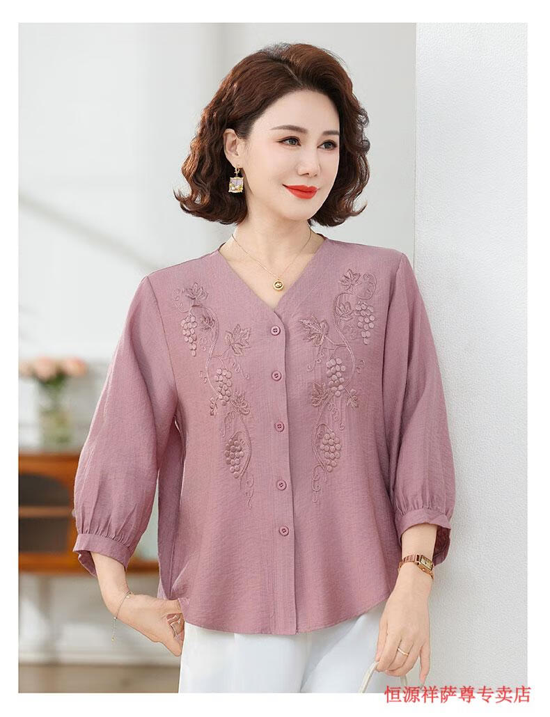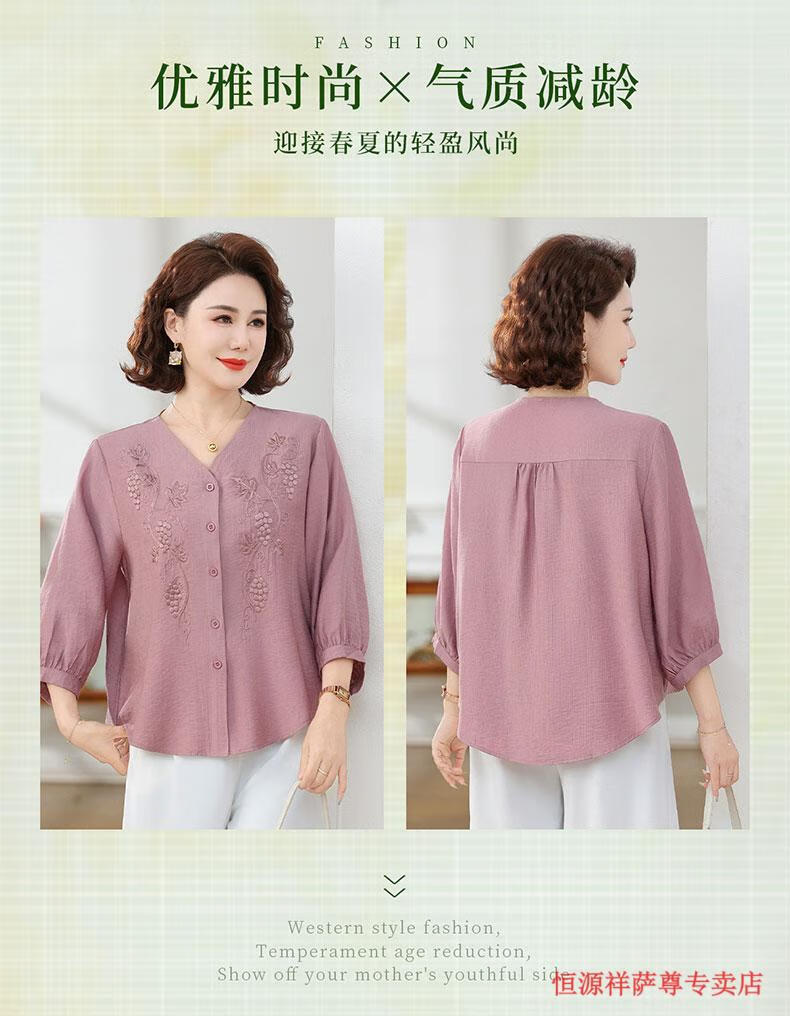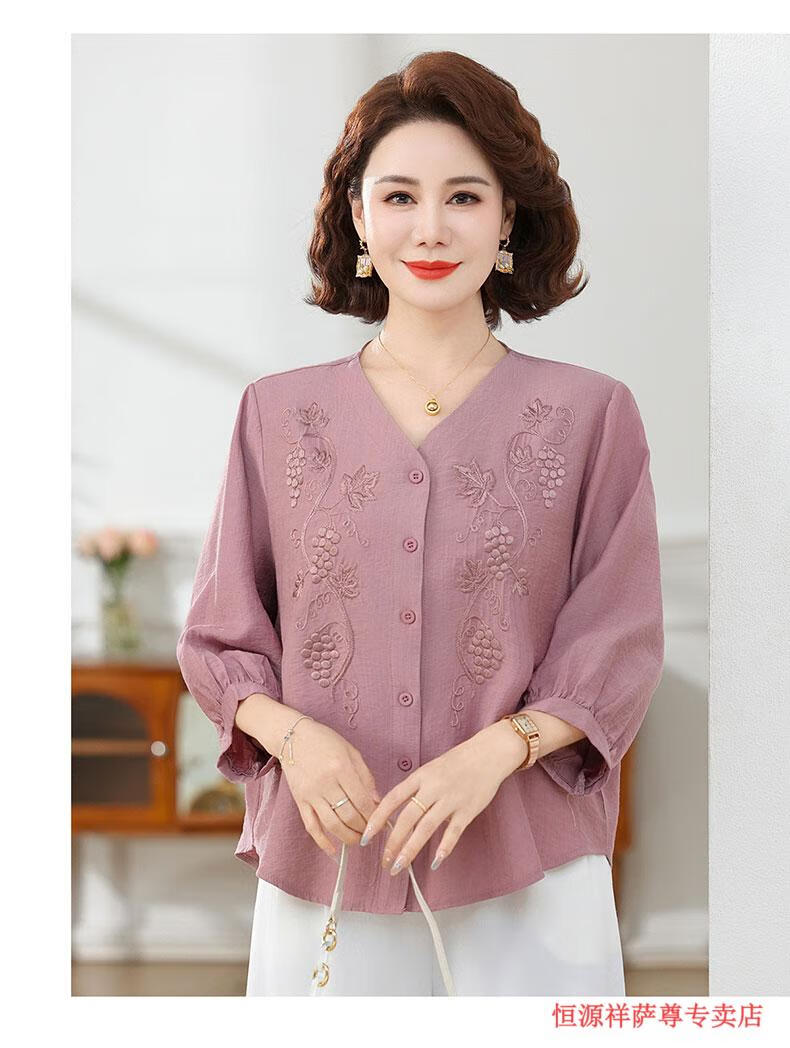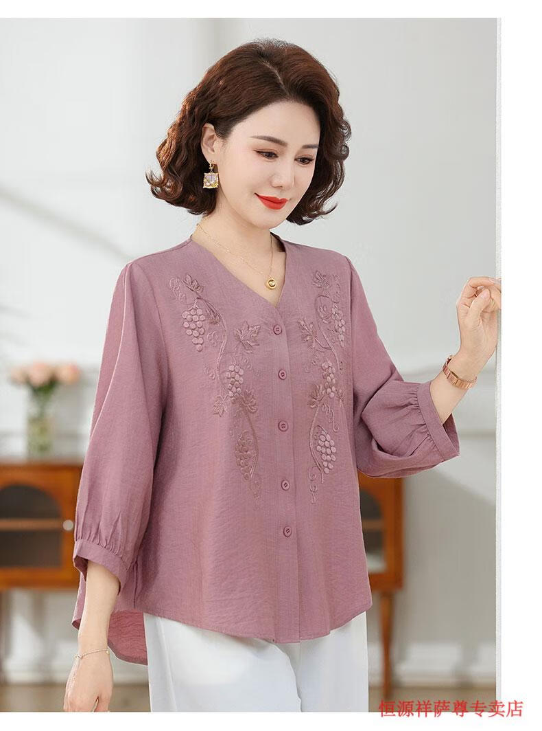 啄木鸟(TUCANO)高端棉麻上衣大尺码女装夏季新款中年老年妈M妈宽松七分袖亚麻衬 粉紫色 XL 建议85-105斤