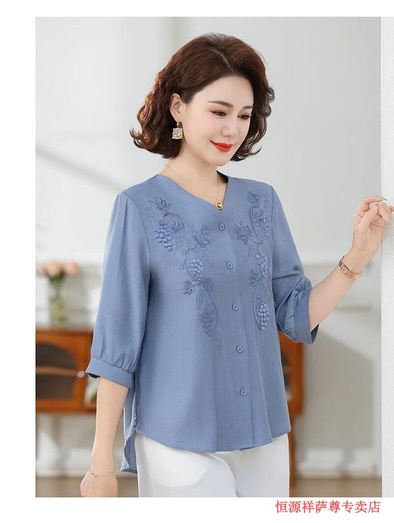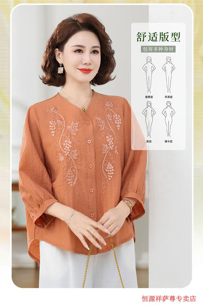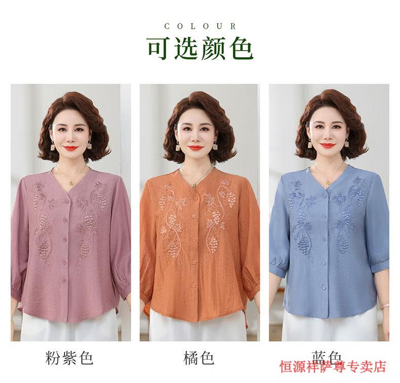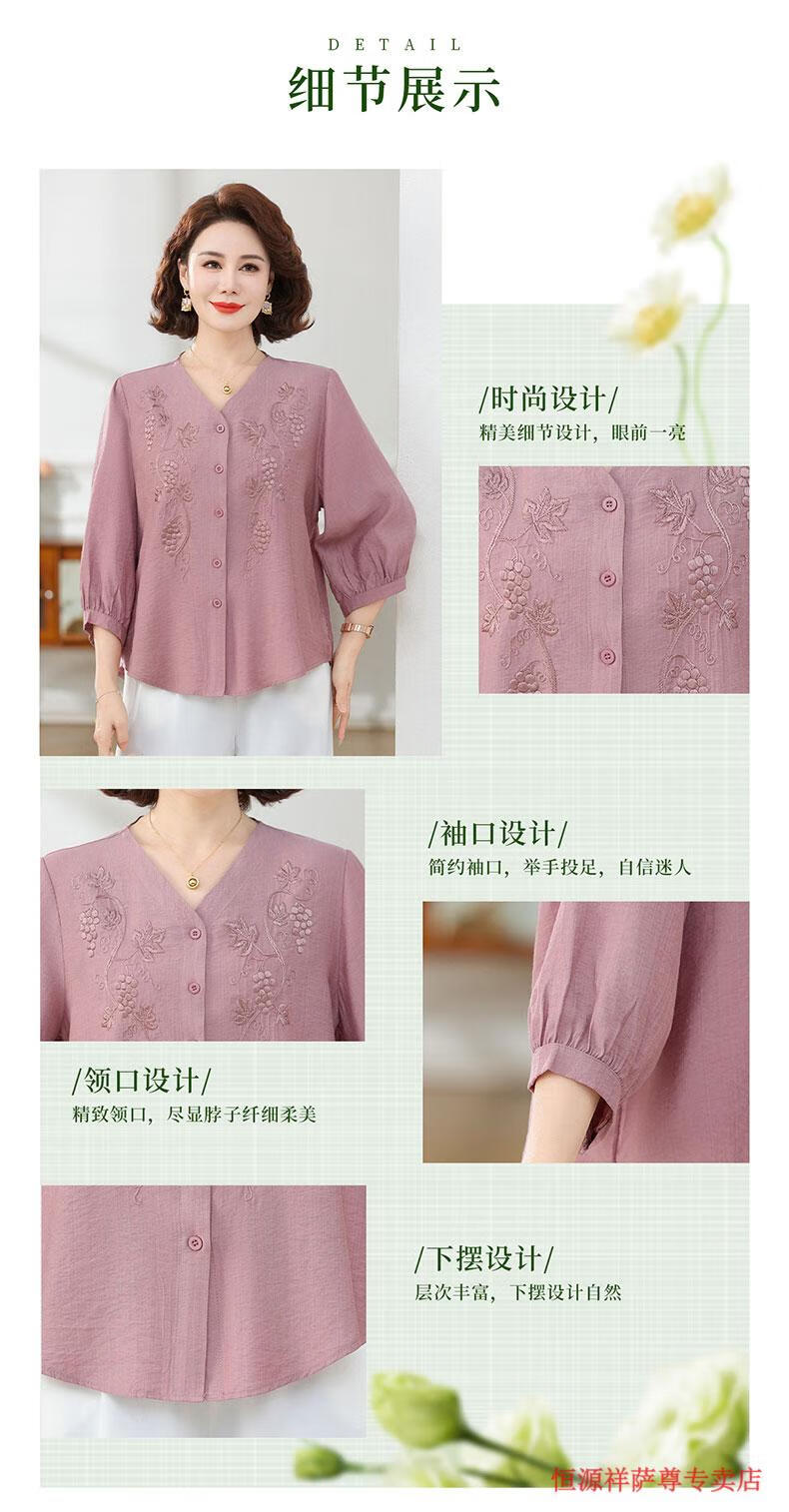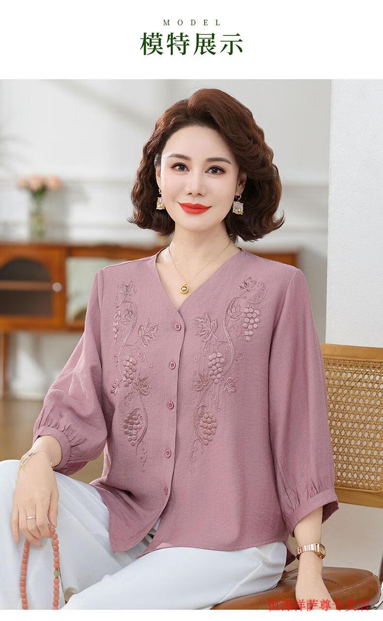 啄木鸟(TUCANO)高端棉麻上衣大尺码女装夏季新款中年老年妈M妈宽松七分袖亚麻衬 粉紫色 XL 建议85-105斤