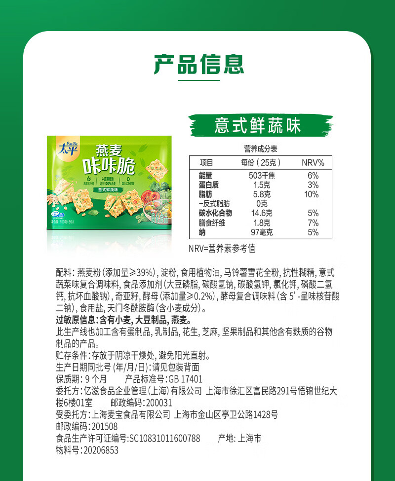 太平《新闻女王》同款燕麦咔咔脆 意式鲜蔬味150g 苏打饼干休闲零食