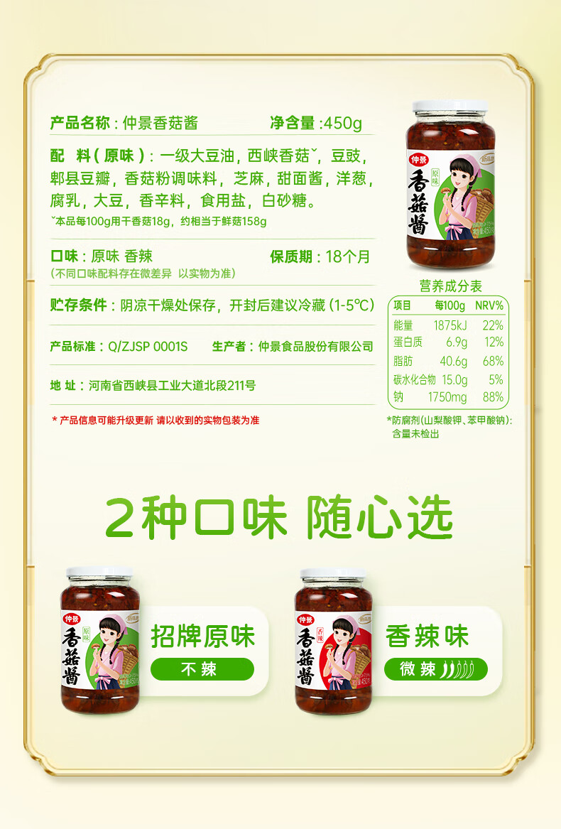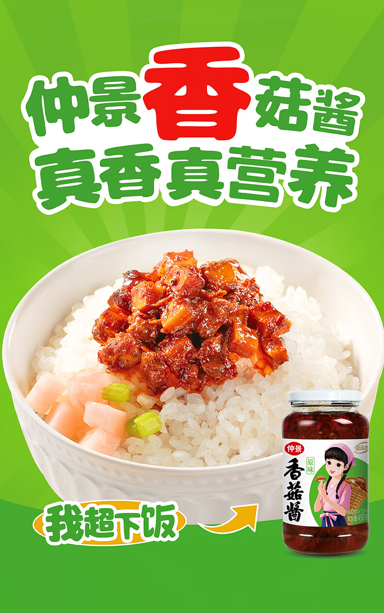 仲景 香菇酱 暴下饭酱菜招牌拌饭拌面酱航天品质蘑菇酱夹馍面条酱料 原味香菇酱450gx2瓶