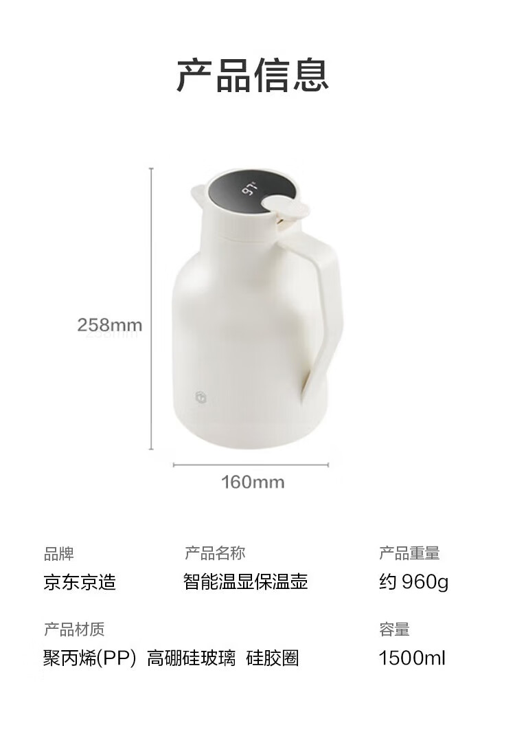 京东京造保温壶 智能温显大容量玻璃内胆热水壶暖壶宿舍办公炼乳白1.5L