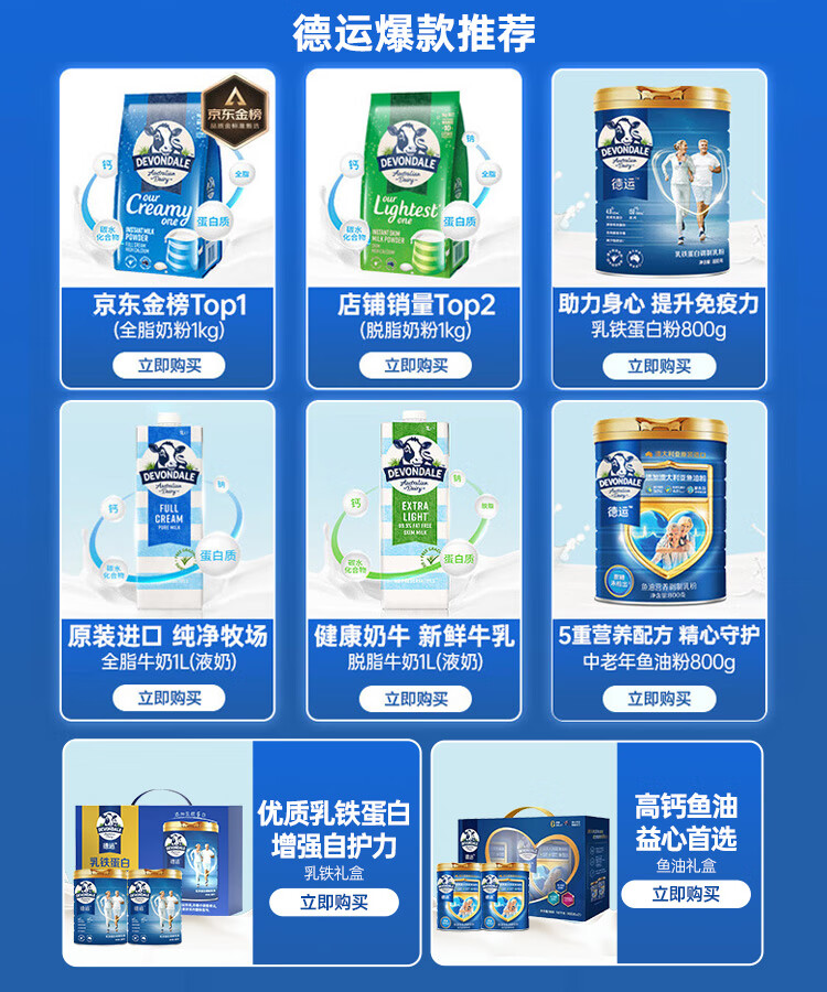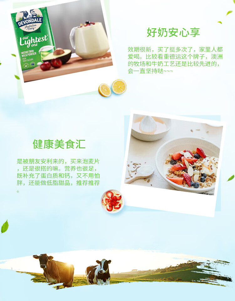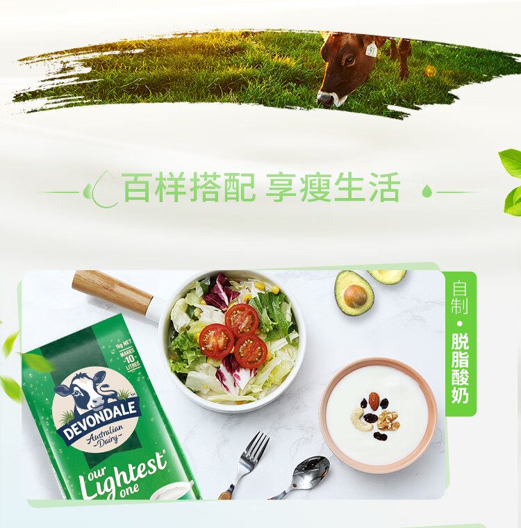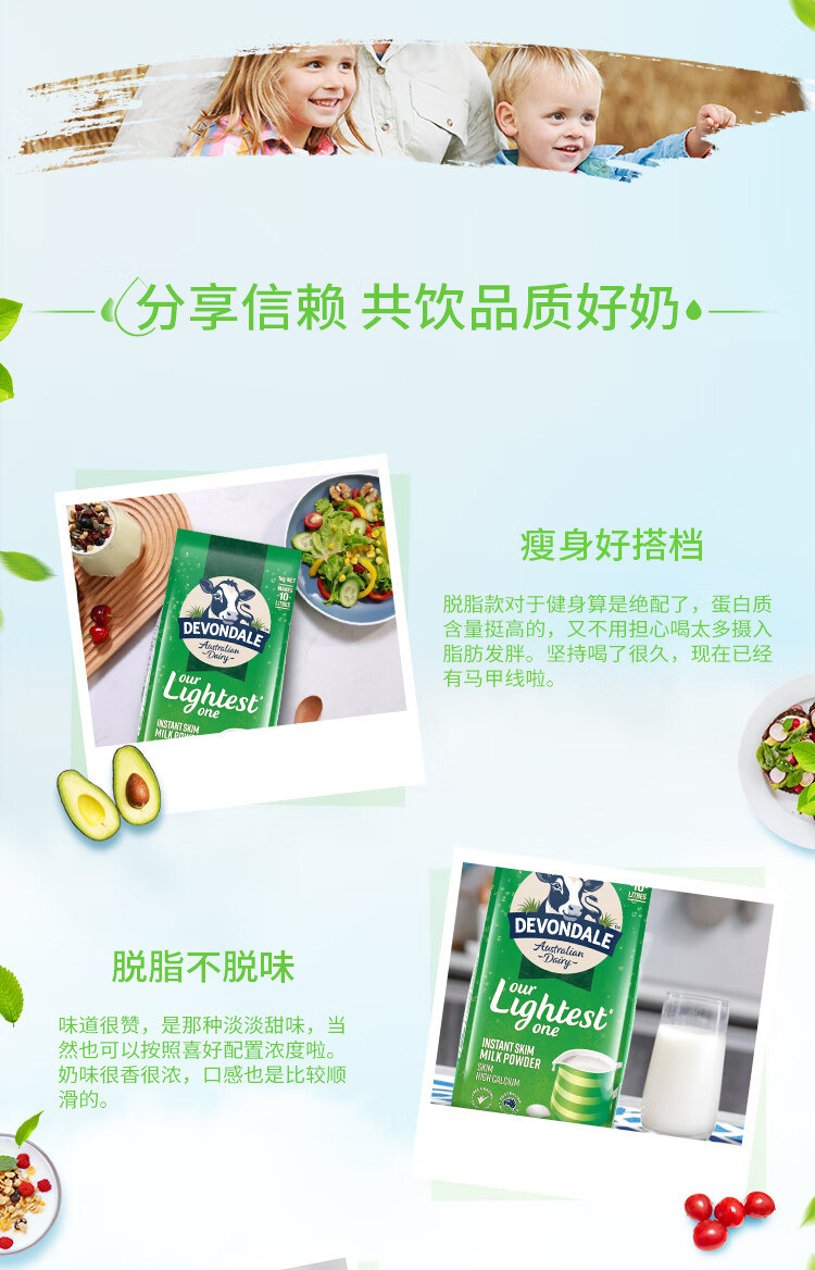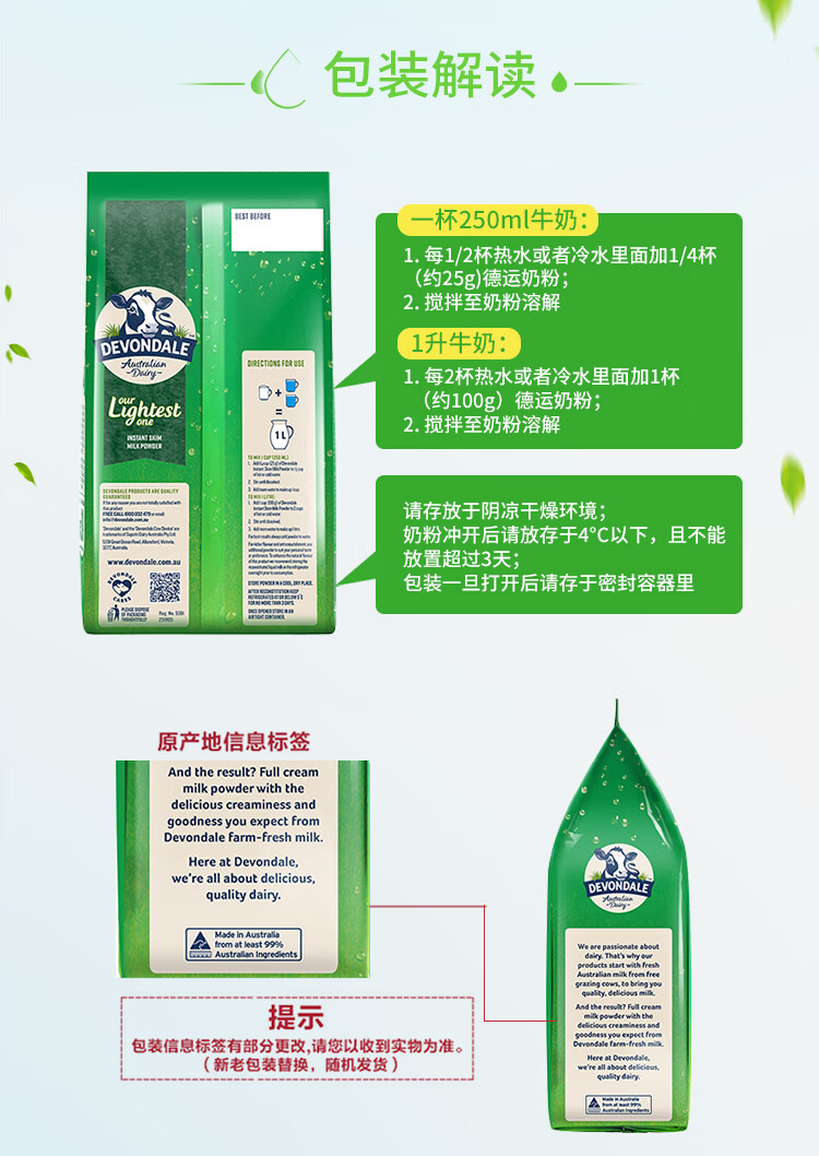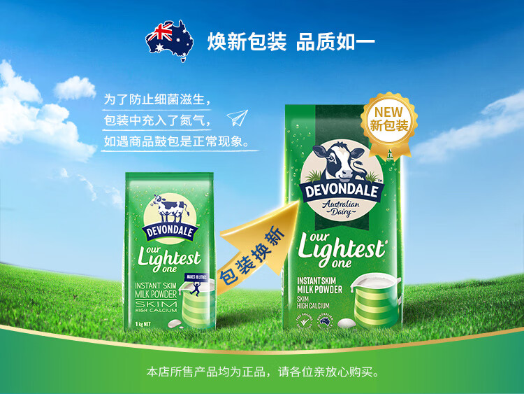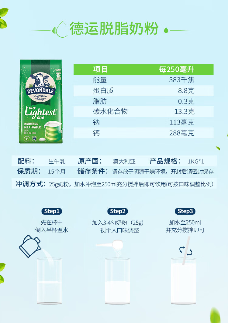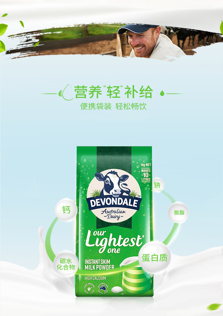 德运(Devondale)澳洲脱脂成人奶粉1kg 0蔗糖高钙女生轻盈早餐冲泡进口奶粉