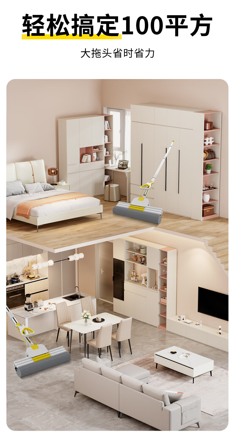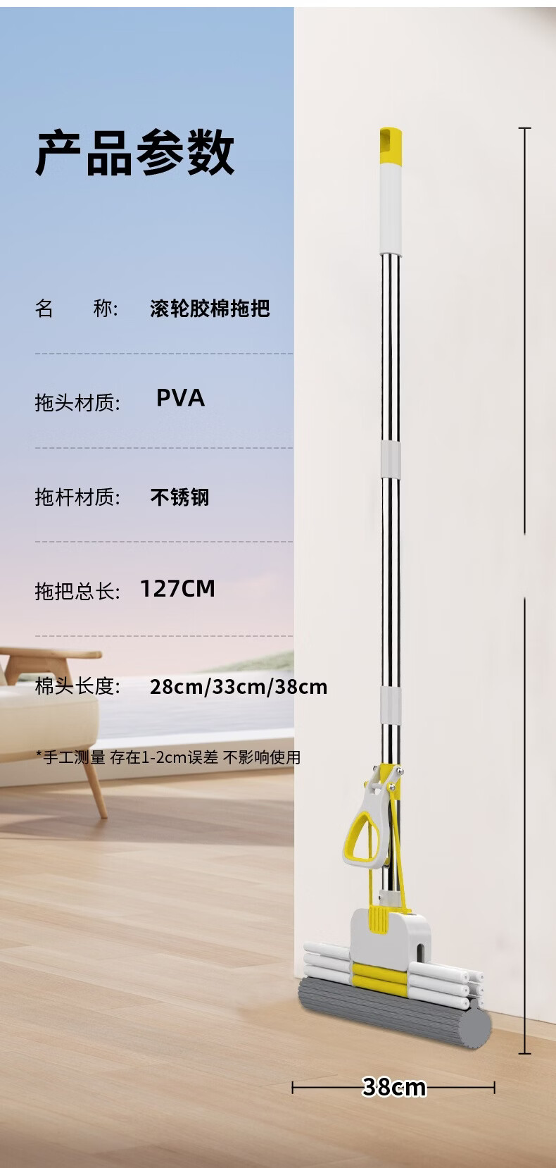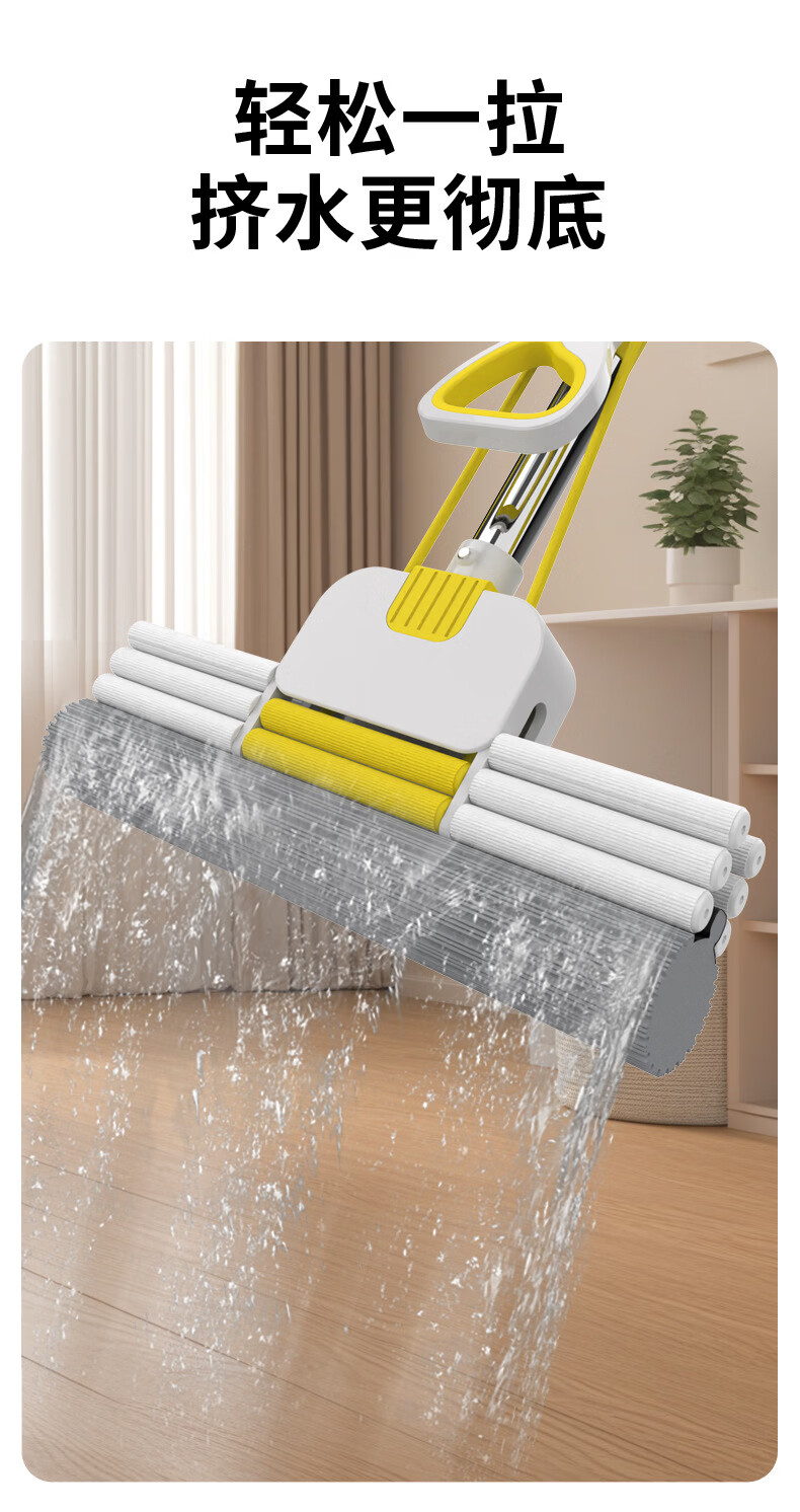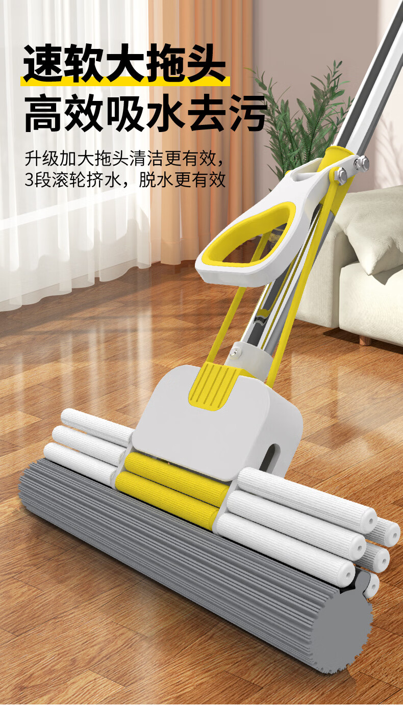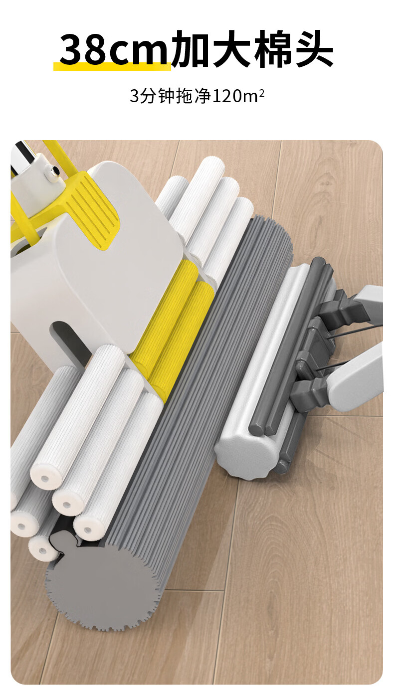 胖东来同款加大海绵拖把大号三排轮胶棉挤水滚轮吸水免手洗耐用结 款44CM二排轮拖把【共2个棉头】蓝色