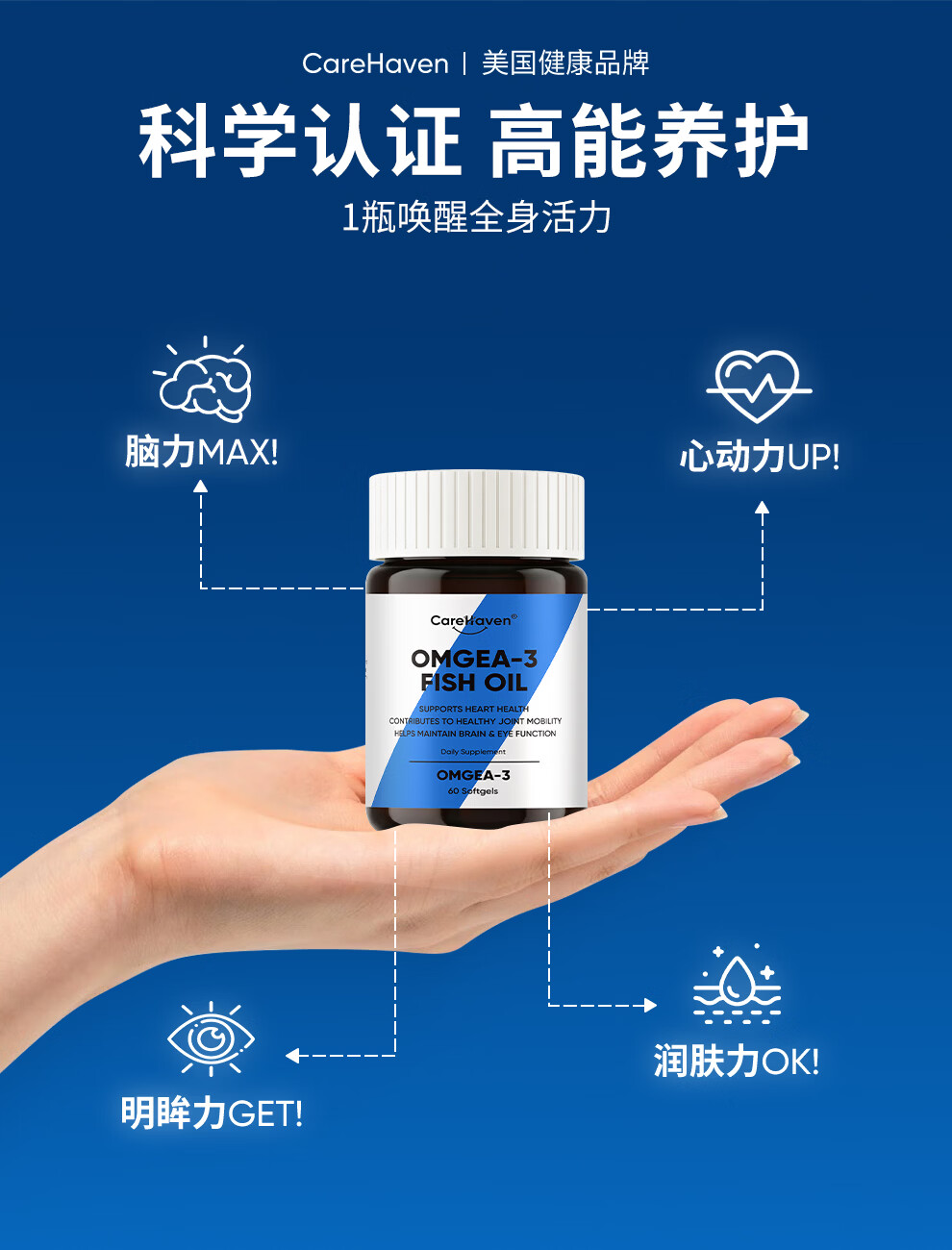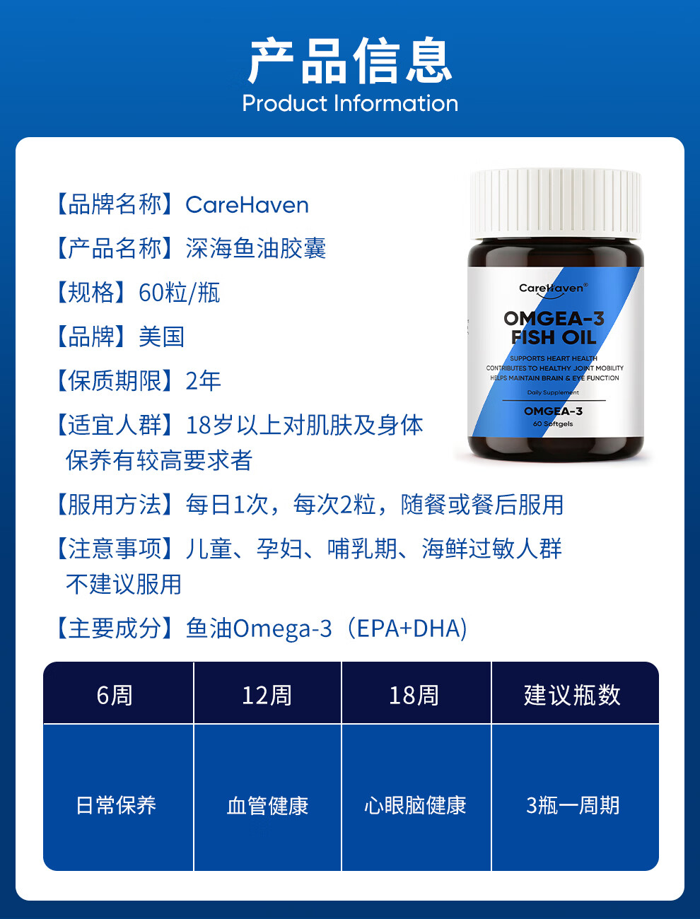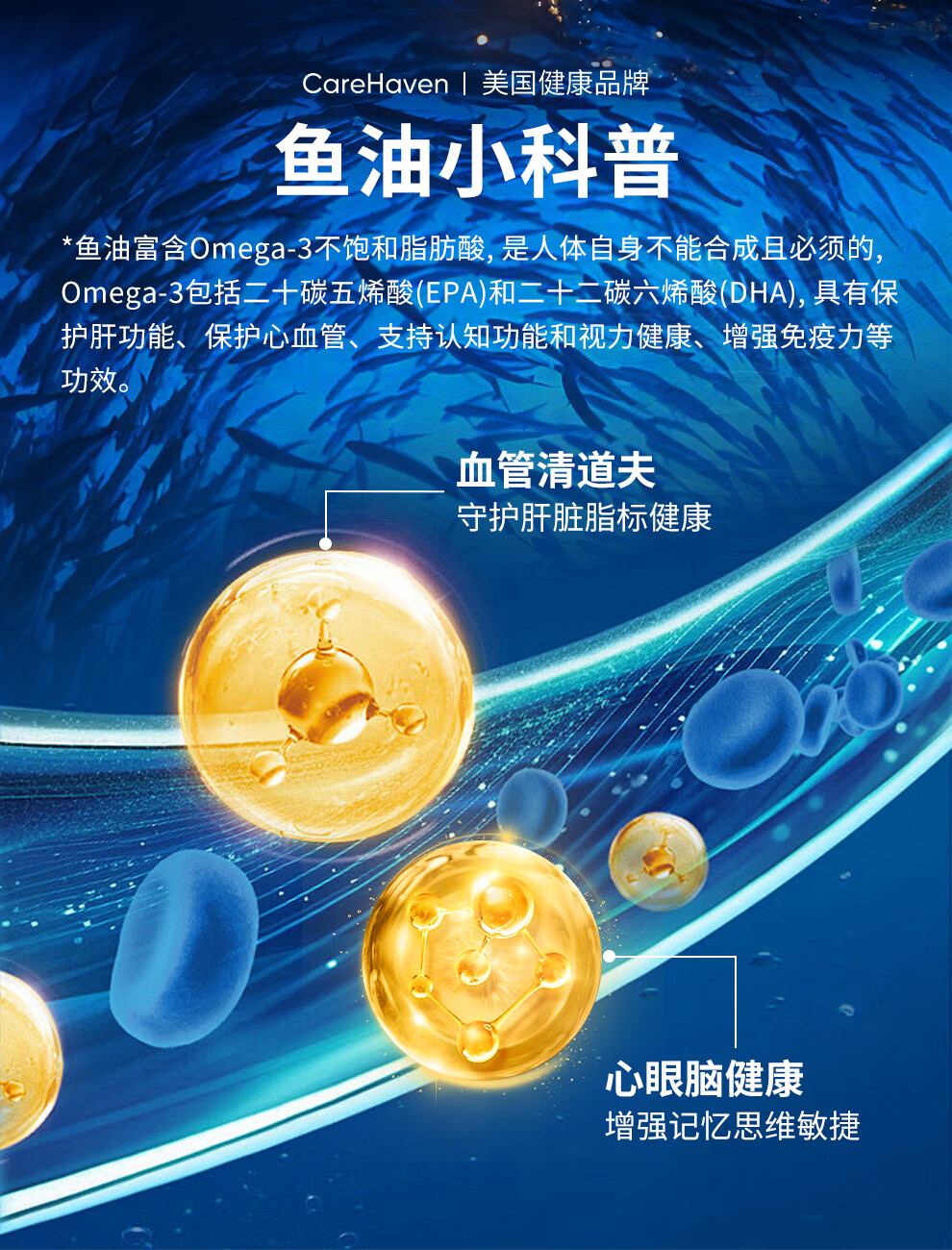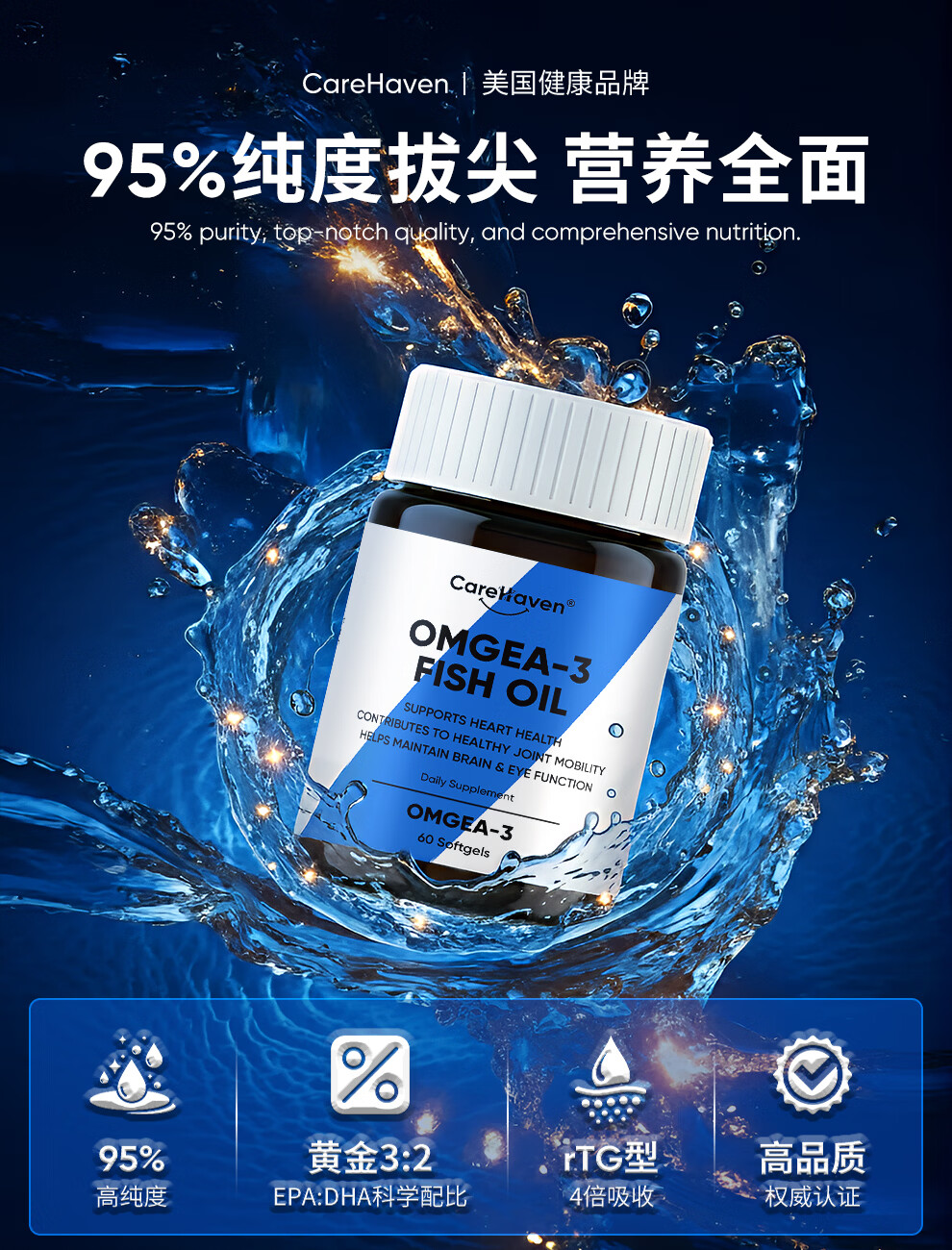 CareHaven【香港直邮】美国高纯深海鱼油omega3降血脂非鱼肝油成人中老年 【97%高纯】深海鱼油胶囊 60粒*1瓶