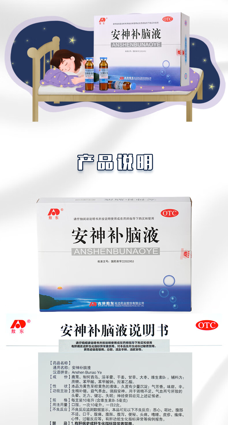 敖东安神补脑液10ml*24支/盒补气血女补气养血提高免疫力睡眠失眠助眠药非褪黑素酸枣仁